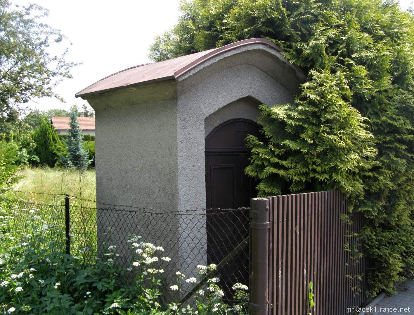 Rovněž na bočních stranách chyběla okna a dozadu jsme se přes plot nedostali. Kaplička nebyla nijak zdobená a to dokonce ani na stříšce ve tvaru oblouku, kde nebyl žádný kříž. Déle jsme se zde tak nezdržovali a vrátili se k autu, kterým jsme vzápětí odjeli k nedaleké vodárenské věži, o níž však již pojednává jiný můj příspěvek. Chcete-li znát jak pokračovalo naše putování Hlučínem, vyhledejte si další moje články, popřípadě celé dobrodružství najdete v sekci Velké povídání o výletech.