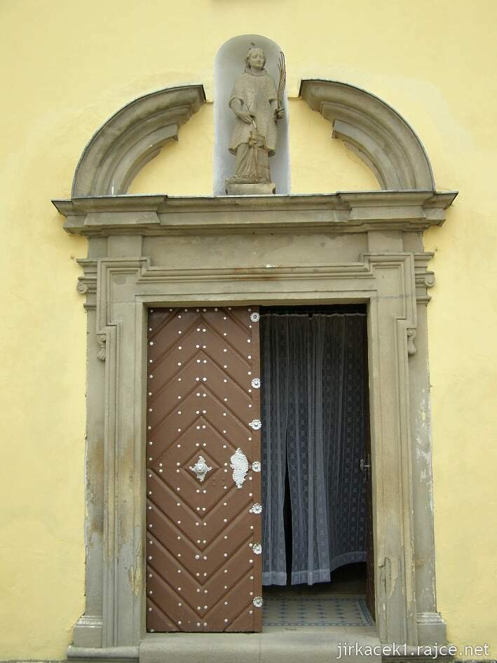 Když jsme si interiér kostela dostatečně prohlédli, vyšli jsme ven a krátce jsme se zastavili u kříže s Kristem, stojící před hlavním vchodem do kostela. Dlouho jsme se u něj nezdrželi a pak jsme se poněkud od kostela sv. Vavřince vzdálili, neboť jsme se šli podívat na sousoší sv. Jana Nepomuckého. Světec stál uprostřed sochařského díla na soklu s obláčky, mezi nimiž jsme rozpoznali několik nahodile umístěných andělských tvářiček či okřídlených hlaviček. Figura sv. Jana Nepomuckého představovala tradiční pojetí kanovníka v trojdílném oděvu s biretem na hlavě, který v pravé ruce držel krucifix s korpusem Krista a levou rukou ukazoval na ústa v gestu mlčenlivosti. Po jeho levé straně stála socha sv. Antonína Pisánského, představující starého holohlavého mnicha s plnovousem v mnišském šatu. Postava se svatozáří ukazovala rukou k srdci a měla zvednuté paže.