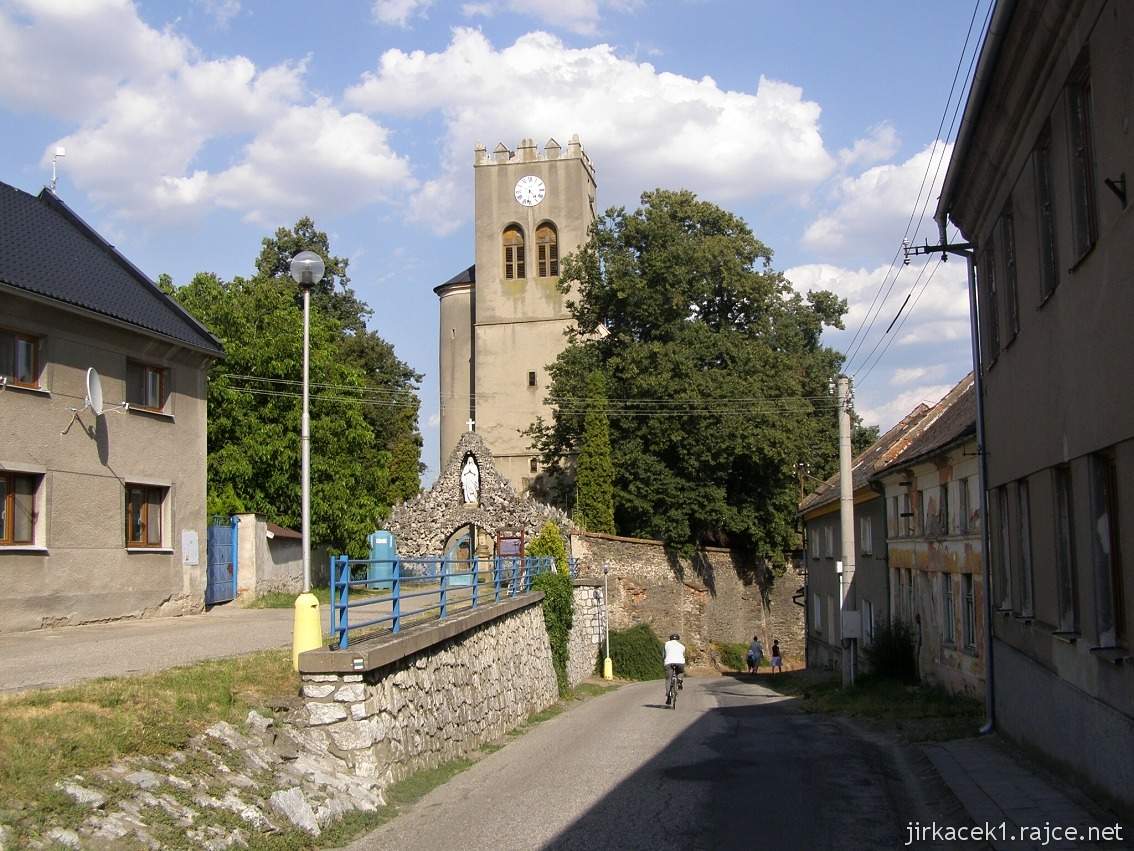 Za ní jsme spatřili další přístavek, což bylo vyústění schodiště z ulice pod námi. Tím jsme dokončili naši obchůzku kolem kostela a následně jsme bránou z korálů vyšli ven z areálu. Poté zabočili doleva dolů a kráčeli podél vysoké ohradní zdi z lomového kamene. Zeď byla zčásti krytá břidlicovými plotnami s kamennými chrliči osazenými ve zdivu. O kousek níž jsme spatřili dveře ve zdi, což byl vchod na již zmíněné schodiště. Pomalu jsme došli až za kostelní areál, kde byla zeď nejvyšší a zde jsme si z druhé strany prohlédli kostnici. Uviděli jsme na ní dvě okna se žaluziovými okenicemi a ve štítu kruhové větrací okénko a také jsme si všimli, že byla kdysi postavená na bývalé středověké baště Odtud jsme měli celý kostel jako na dlani a tak jsme krásnou scenérií nepohrdli a z několika pohledů si jej vyfotili. Přitom jsme se pohybovali v místech, kde dříve bývaly bažiny a močály, tvořící ideální ochranu pro středověkou tvrz nad námi. Po několika minutách jsme se vydali opět podél zdi zpátky k našemu autu na náves a pak jsme odjeli do sousední obce Příkazy, kde nás čekala obhlídka kaple sv. Cyrila a Metoděje. Chcete-li vědět, jak náš výlet pokračoval, vyhledejte si v sekci Velké povídání o výletech článek Jak jsme mezi Olomoucí a Litovlí poznávali jednu památku za druhou, který vám prozradí další podrobnosti.