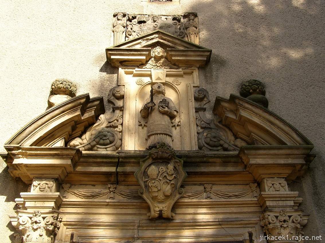 Nad erbem jsme ve výklenku nemohli přehlédnout sochu sv. Štěpána a ještě výše pak byl třídílný reliéf s kartuší a dvěma znaky - Kašpara Myruše z Litovle, dalšího opata hradiska a druhý patrona kláštera sv. Štěpána, což byl křesťanský kazatel a služebník, první mučedník křesťanství, ukamenovaný po procesu před židovskou radou jako údajný rouhač proti judaismu. Následně jsme nakoukli dovnitř svatostánku a i když nám v tom bránila mříž ve dveřích, pořádně jsme si barokní mobiliář prohlédli. Nad námi se nacházel hudební kůr, který jsme pochopitelně nemohli vidět a v dálce před námi se rýsoval hlavní oltář, dokončený až v roce 1939. Dominoval mu velký obraz svatého Jiří na bílém koni s kopím, kterým probodával dračí nestvůru, přičemž vše sledovala královská dcera, jež se měla stát drakovou obětí. Dále jsme zde viděli několik barokních soch, kostelní lavice či pěknou kazatelnu. Když jsme si dostatečně prohlédli interiér, vydali jsme se na obhlídku jeho exteriérů. Hned u vchodu jsme krátce shlédli kříž s Kristem z roku 1745 s reliéfem svatého Václava na podstavci, který do roku 1896 stával před bránou ke kostelu.