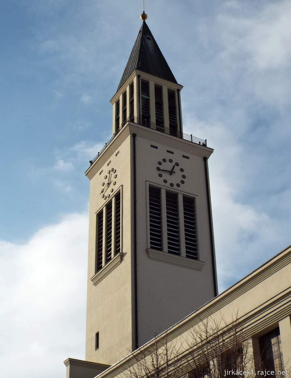 Nad hlavním vchodem se k nebi vypínala hranolová věž, vysoká 65 metrů zakončená ochozem, její horní užší část završovala stanová střecha. Věž byla členěna vertikálními okny a vždy jsme si na ní mohli díky ciferníkovým hodinám zkontrolovat správný čas. V dolní části věže naši pozornost pokaždé upoutalo bronzové sousoší sv. Cyrila a Metoděje od olomouckého sochaře J. Pelikána, ulité v již zmíněných formách, které někdo vhodně umístil do místnosti se schodištěm na ochoz. Na obou stranách chrámu jsme spatřili boční kaple a několik oken, přičemž některé měly obdélníkový tvar, jiné byly pro změnu kulaté. Všechny pouštěly světlo do chrámové lodi a když se do nich v podvečer opíralo sluníčko, zapadající za městem za obzor, byla to vždy velmi pěkná podívaná. Vypadalo to totiž, že v kostele někdo rozsvítil velmi silné žárovky, aby věřící dobře viděli na kněze před oltářem.