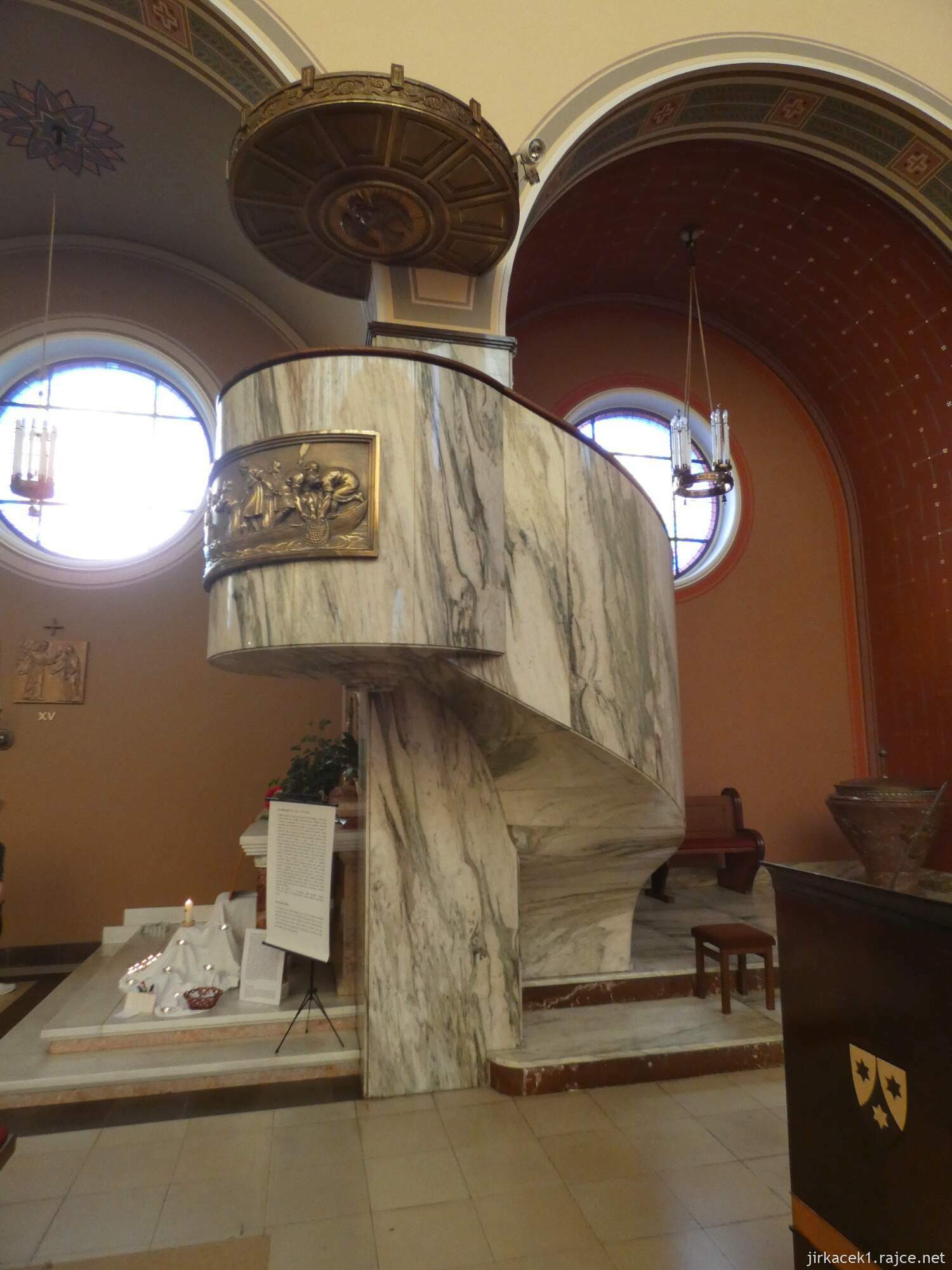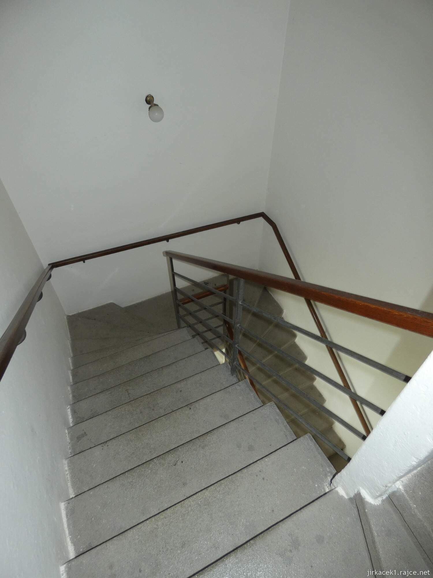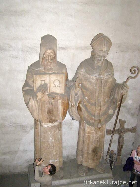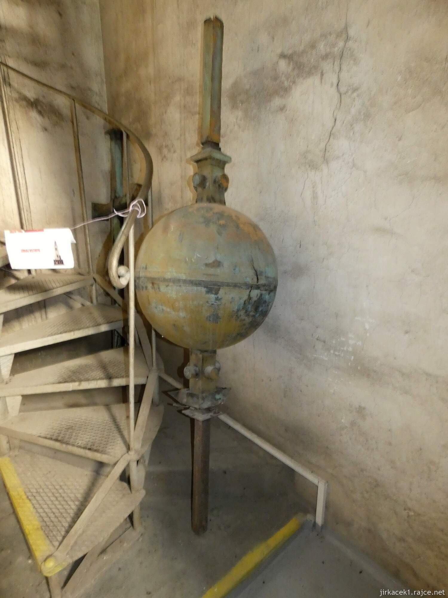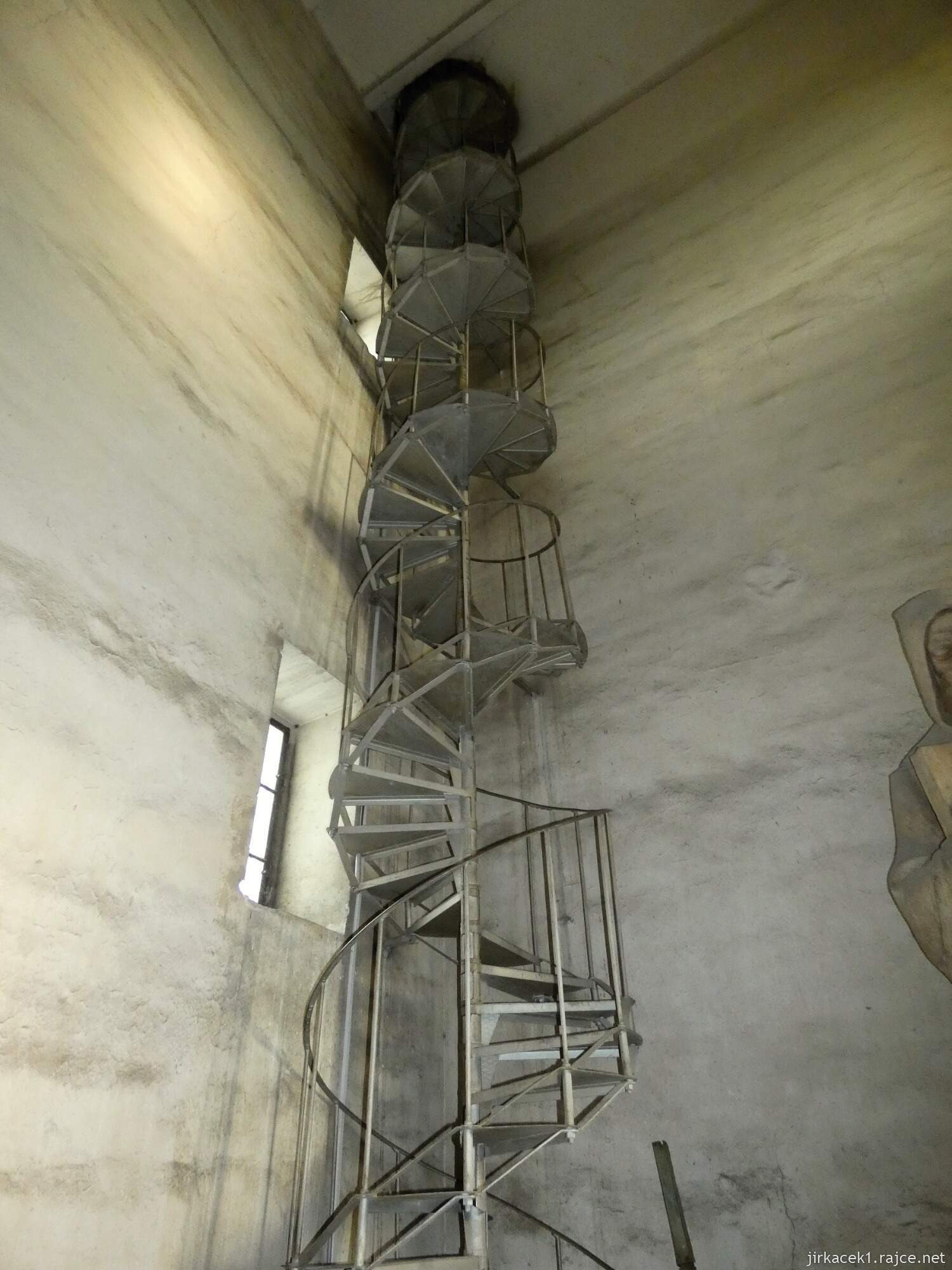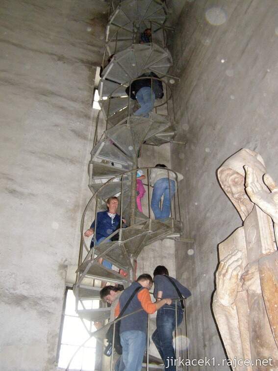 V místnosti jsme si ještě prohlédli srdce jednoho ze deseti zvonů, které původně visely na věži, ale za druhé světové války bylo devět z nich zabaveno pro potřeby zbrojního průmyslu. Teprve roku 1994 byly vysvěceny tři nové zvony - Nejsvětější Trojice, sv. Cyril a Metoděj a Panna Maria, které jsme o deset let později začali slýchávat i my poté, co jsme se do hejčínské čtvrti přestěhovali z jiné části Olomouce. Schodiště na ochoz byl tentokrát z bezpečnostních důvodů uzavřen, čemuž jsme se nedivili, jelikož prostor nahoře na věži nebyl nijak široký a snadno mohlo dojít k nějakému neštěstí. Místo toho, abychom se opět pokochali dalekými výhledy, jsme se tedy odebrali dolů po schodišti před kostel, počkali jsme na naše známé a pak jsme zamířili do přízemních interiérů chrámu.