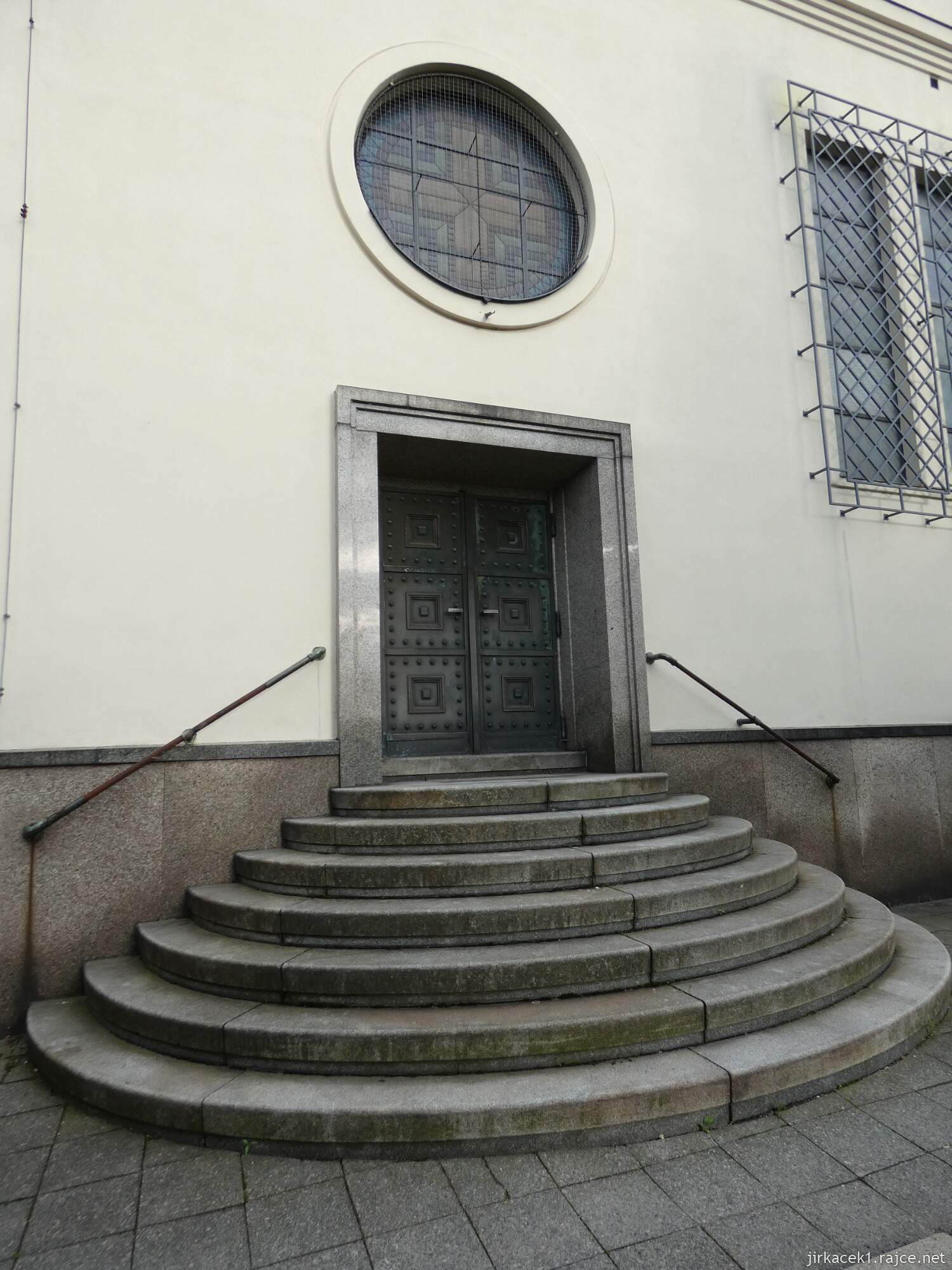 Jak už bylo napsáno, kostel sv. Cyrila a Metoděje na periferii Olomouce pro nás nebyl žádnou neznámou, přesto jsme se u něj občas zastavili, abychom si řádně prohlédli jeho exteriéry. Tradičně nejzajímavější byla přední část svatostánku, jehož hlavní vchod kryl portikus neboli sloupová vstupní síň, která poskytovala věřícím ochranu před nepřízní počasí, když třeba čekali na mši. Za šesticí hranolových sloupů jsme vždy našli kovaná dvoukřídlá vrata se šesti čtvercovými pláty, lemované profilovaným žulovým ostěním. Podobně vypadaly boční vstupy z obou stran lodi i vstup do krypty ze zadní strany, nicméně do sakristie se vstupovalo přes dřevěné dvoukřídlé dveře, přístupné po vnějším schodišti. Jednotlivé vstupy tak společně tvořily pěkně ucelený soubor, vhodně doplňující exteriér celé stavby.