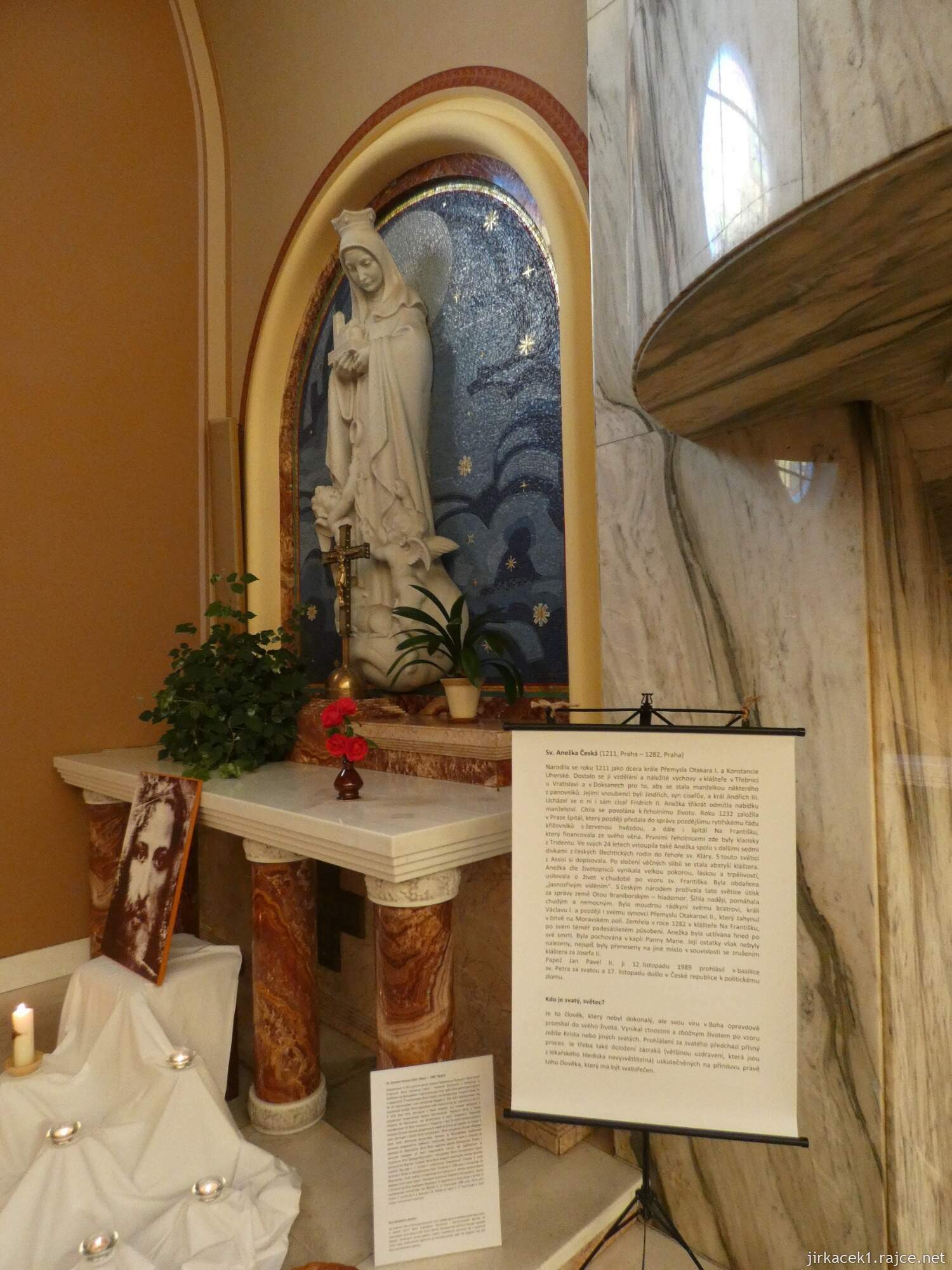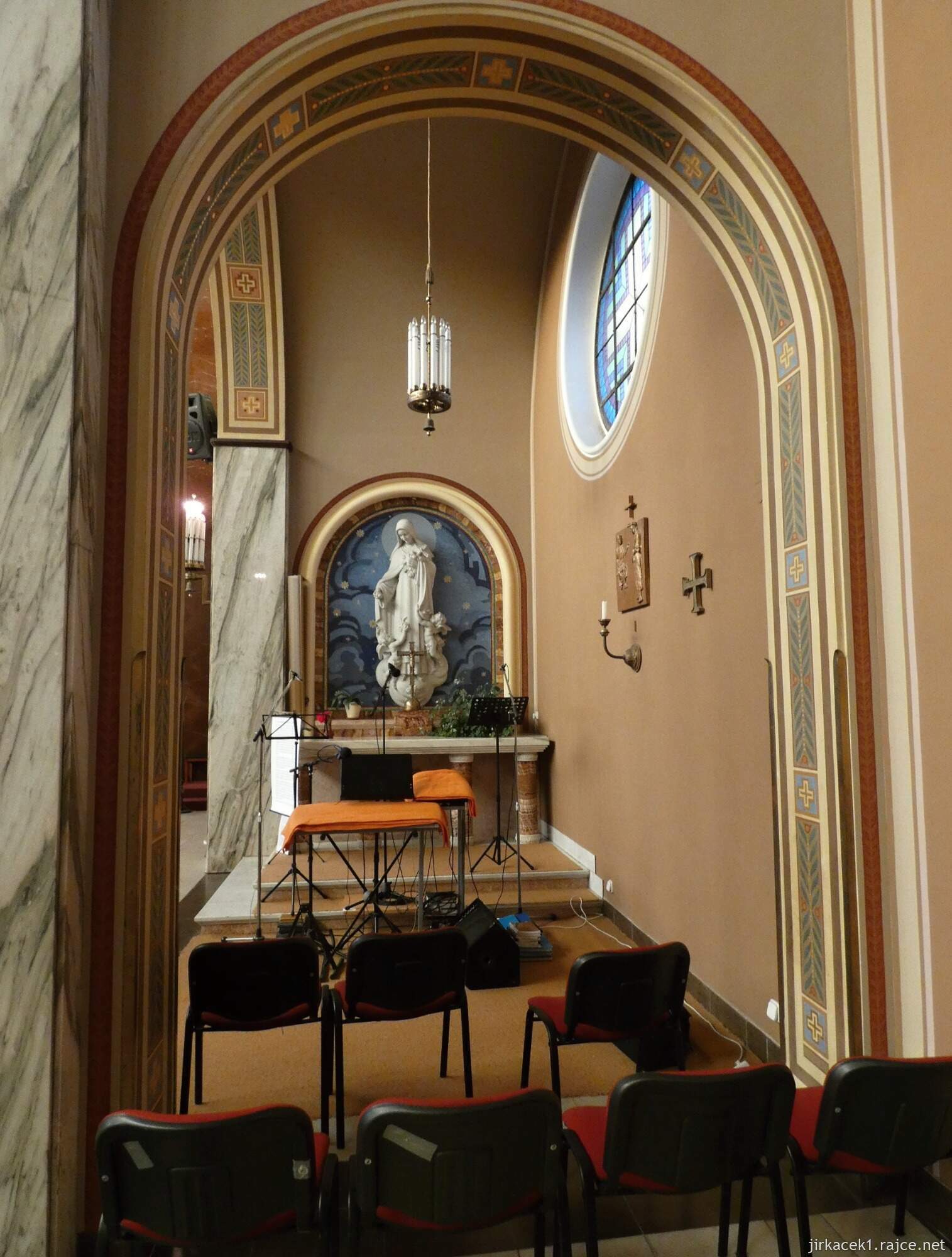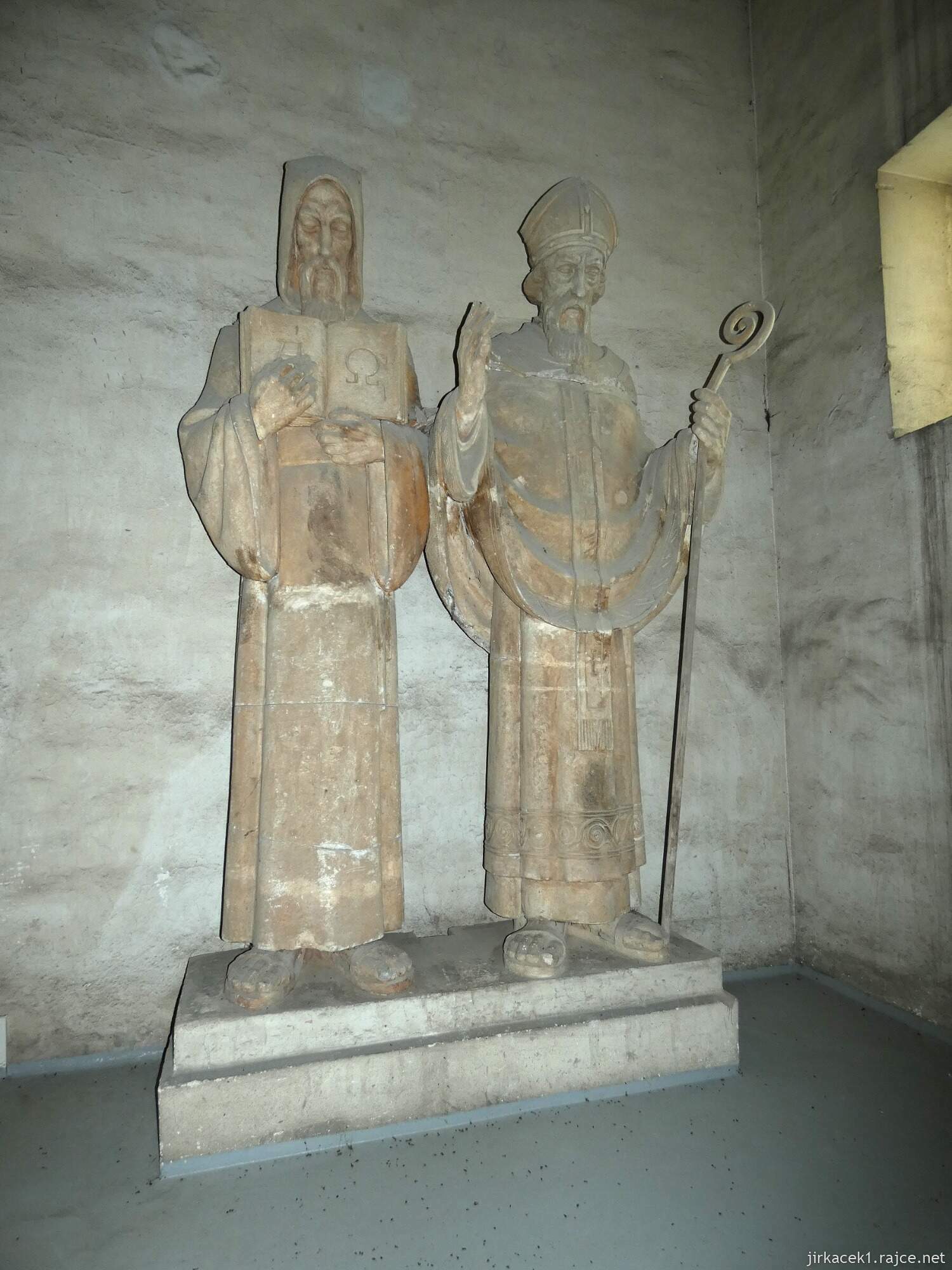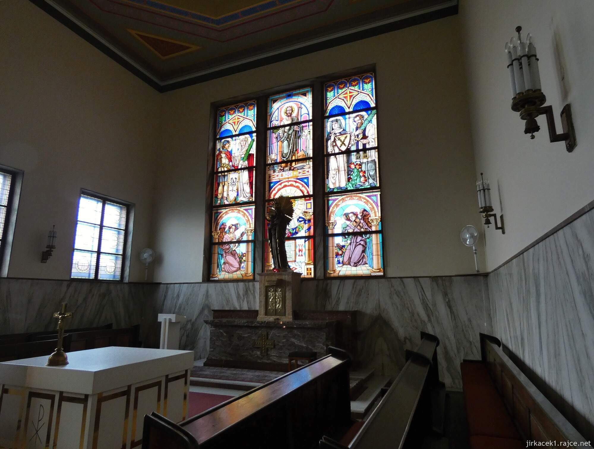 Právě on vytvořil monumentální bronzové sousoší sv. Cyrila a Metoděje na průčelí kostela, které jsme měli na očích, kdykoliv jsme okolo chrámu procházeli. Vedle hlavního oltáře se nacházel další oltář s bronzovým baldachýnem a pak jsme se již věnovali bočním oltářům. Postupně jsme si prohlédli boční oltář sv. Terezie Ježíškovy, nalevo sv. Anežky České a dále tři kaple - Boží hrob, Jesličky v zadní části a kapli Panny Marie za presbytářem. Právě do posledně jmenované kaple jsme následně vstoupili a ihned jsme si začali prohlížet barevné okno, na němž byli vyobrazeni sv. Ludmila a sv. Václav, sv. Josef, sv. Zdislava a sv. Jan Sarkander. Posledně jmenovaný světec byl také úzce spjat s Olomoucí, bohužel v tom negativním smyslu……
