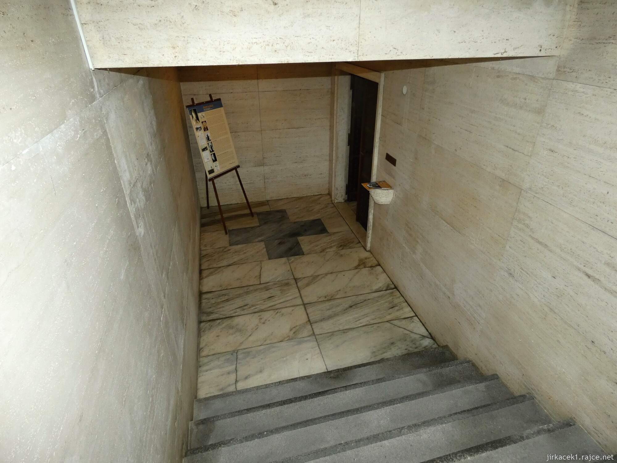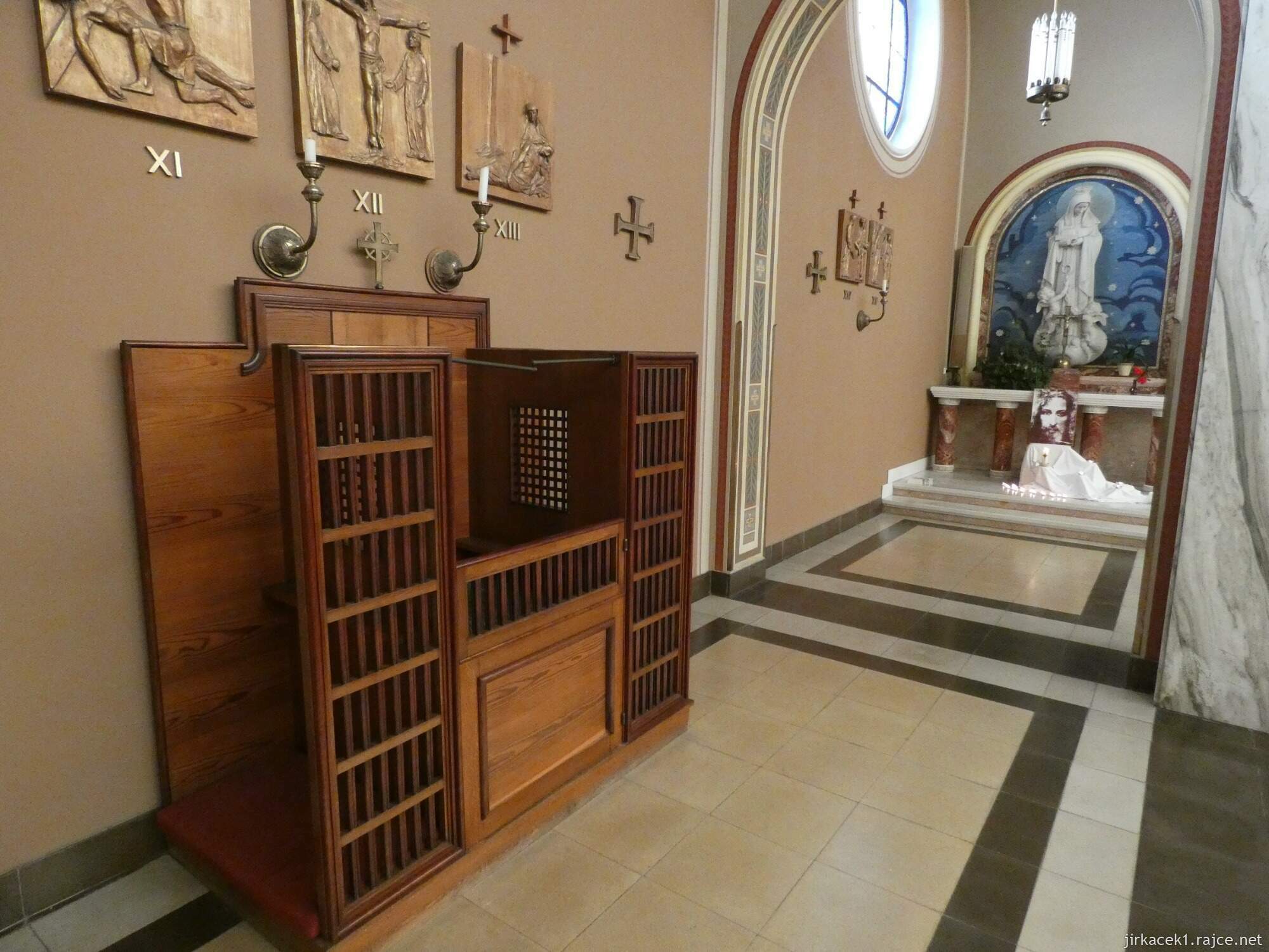 Následně jsme kolem zajímavé zpovědnice a hudební kruchtou s varhanami z krnovské dílny bratří Riegrů zamířili k východu a stanuli tak opět na denním světle. Pak jsme naše známé vzali dozadu k presbytáři a zachvěli jsme se znovu ocitli u kaple Panny Marie, ovšem tentokrát z její venkovní strany. Pod ní se nacházel další objekt našeho zájmu, jímž byla krypta s rakví arcibiskupa Leopolda Prečana. Za vstupním dveřmi jsme našli schodiště se stěnami obloženými všudypřítomným mramorem a když jsme po schodech sestoupili dolů, narazili jsme na panel s informacemi o životě zmíněného arcibiskupa. Dočetli jsme se, že právě on se největší mírou zasadil o výstavbu nového kostela na okraji Olomouce, v němž chtěl zřídit duchovní správu pro Řepčín, Hejčín, nově postavenou čtvrť Na Šibeníku, část Úřednické čtvrtě a Neředín.