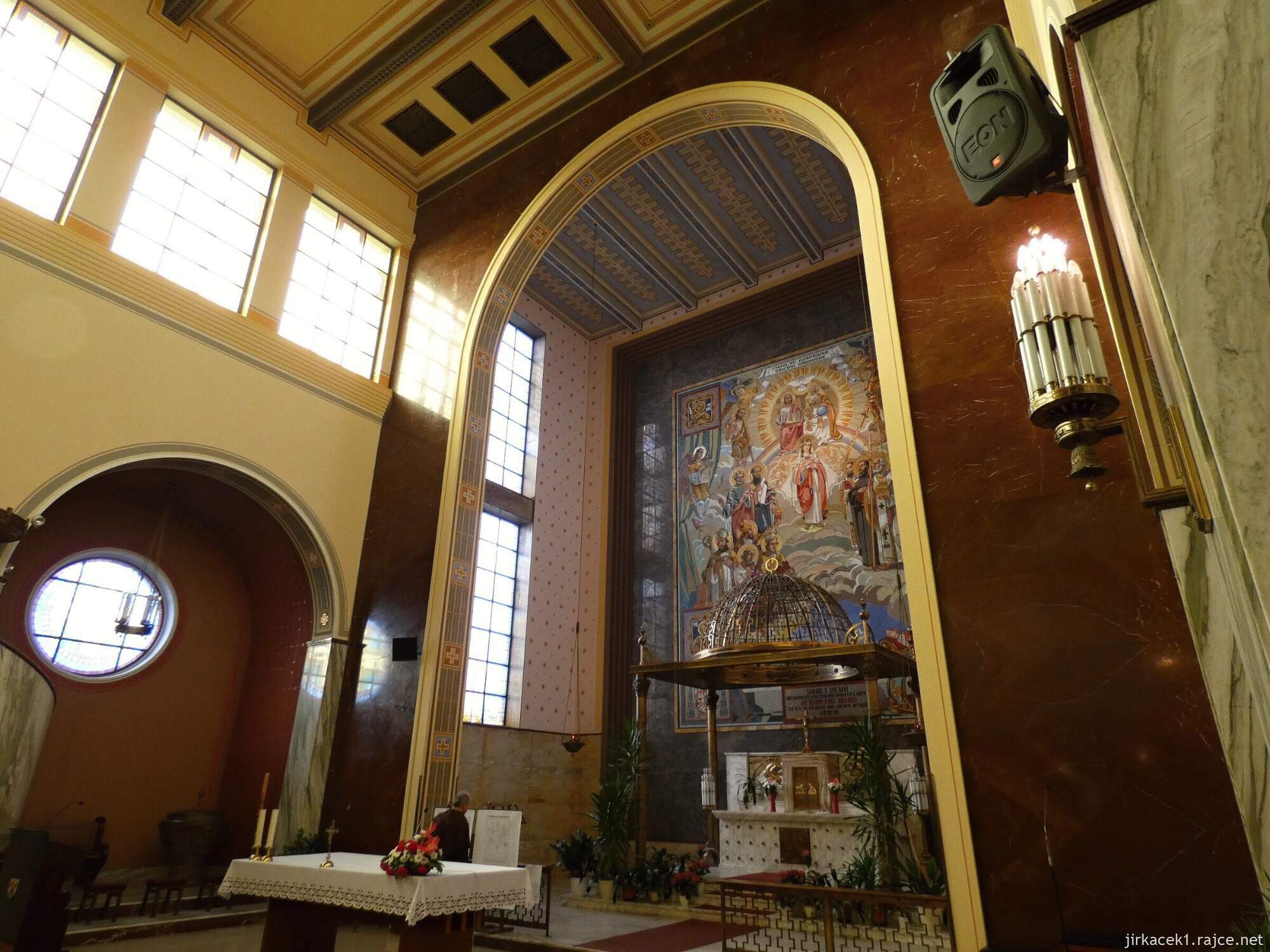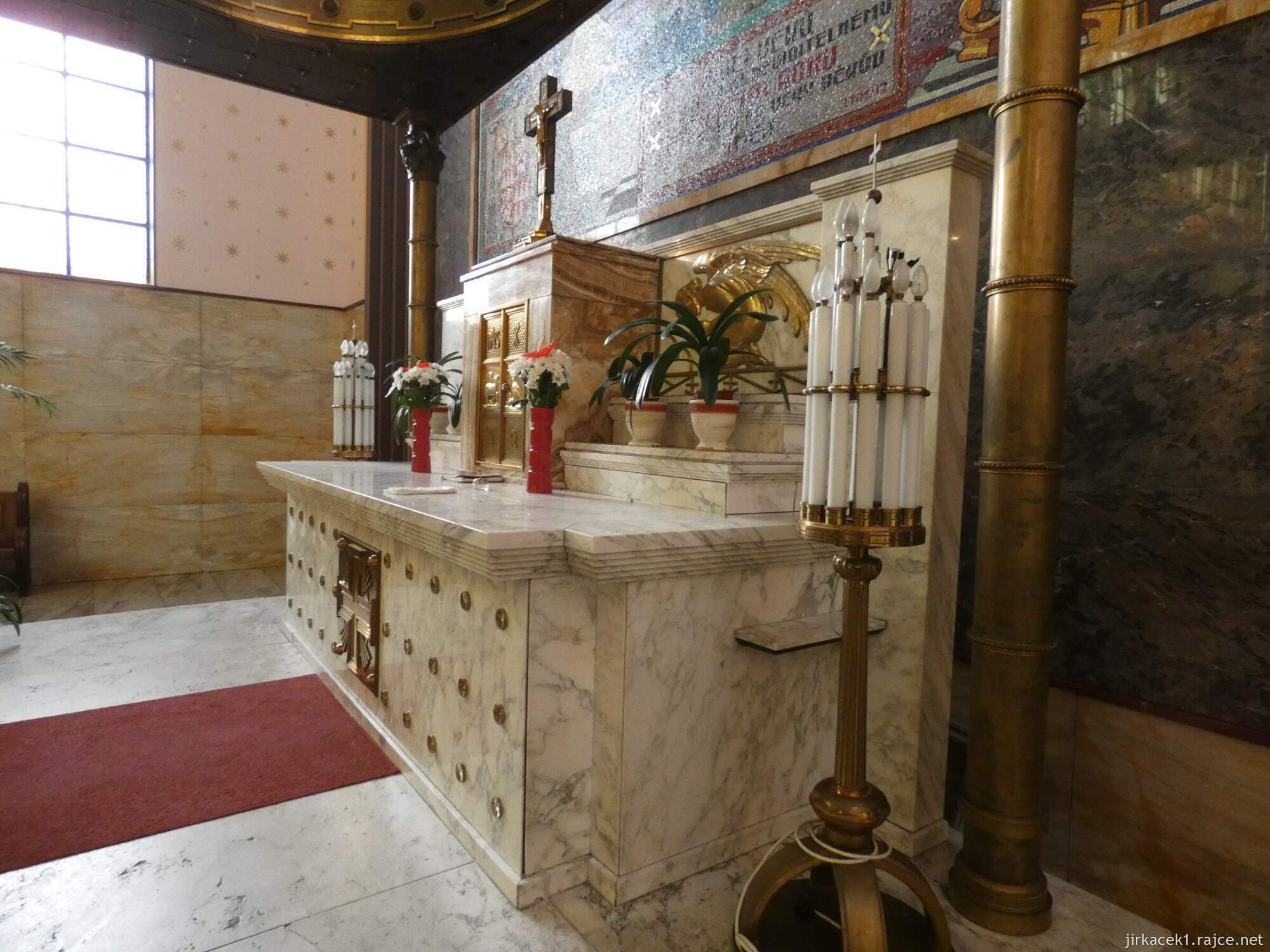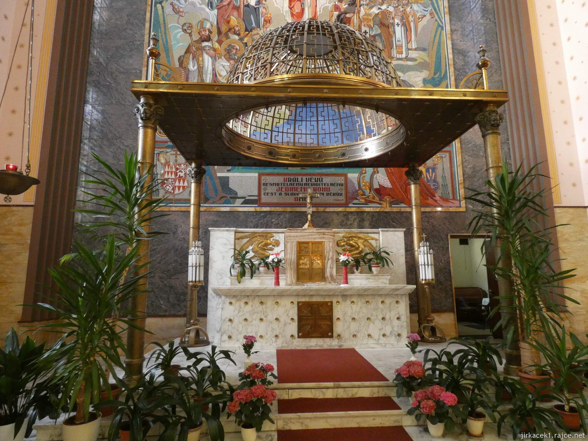Největší pozornost všech návštěvníků však logicky přitahoval hlavní oltář s mozaikovým obrazem o rozměrech 8,7 x 7,2 metry, jehož autorem je olomoucký malíř Jano Köhler. Údajně jej jako puzzle skládali čtyři italští mozaikáři z neuvěřitelných 630 tisíc kamenů a i díky jejich práci vznikl největší obraz tohoto druhu ve střední Evropě. Pozoruhodné dílo ztvárňovalo modlitbu Confiteor, česky Vyznávám se, používané během mše svaté k vyjádření lítosti nad hříchy, včetně prosby za jejich odpuštění. Na mozaice jsme viděli Nejsvětější Trojici, Pannu Marie, sv. Jana Křtitele a archanděla Michaela, dále tu byli čtyři největší učitelé křesťanského východu a vlevo dole čtyři učitelé církve západní. Dole klečel arcibiskup Leopold Prečan, který byl znázorněn v kardinálském hávu, ačkoliv se jím nikdy nestal.