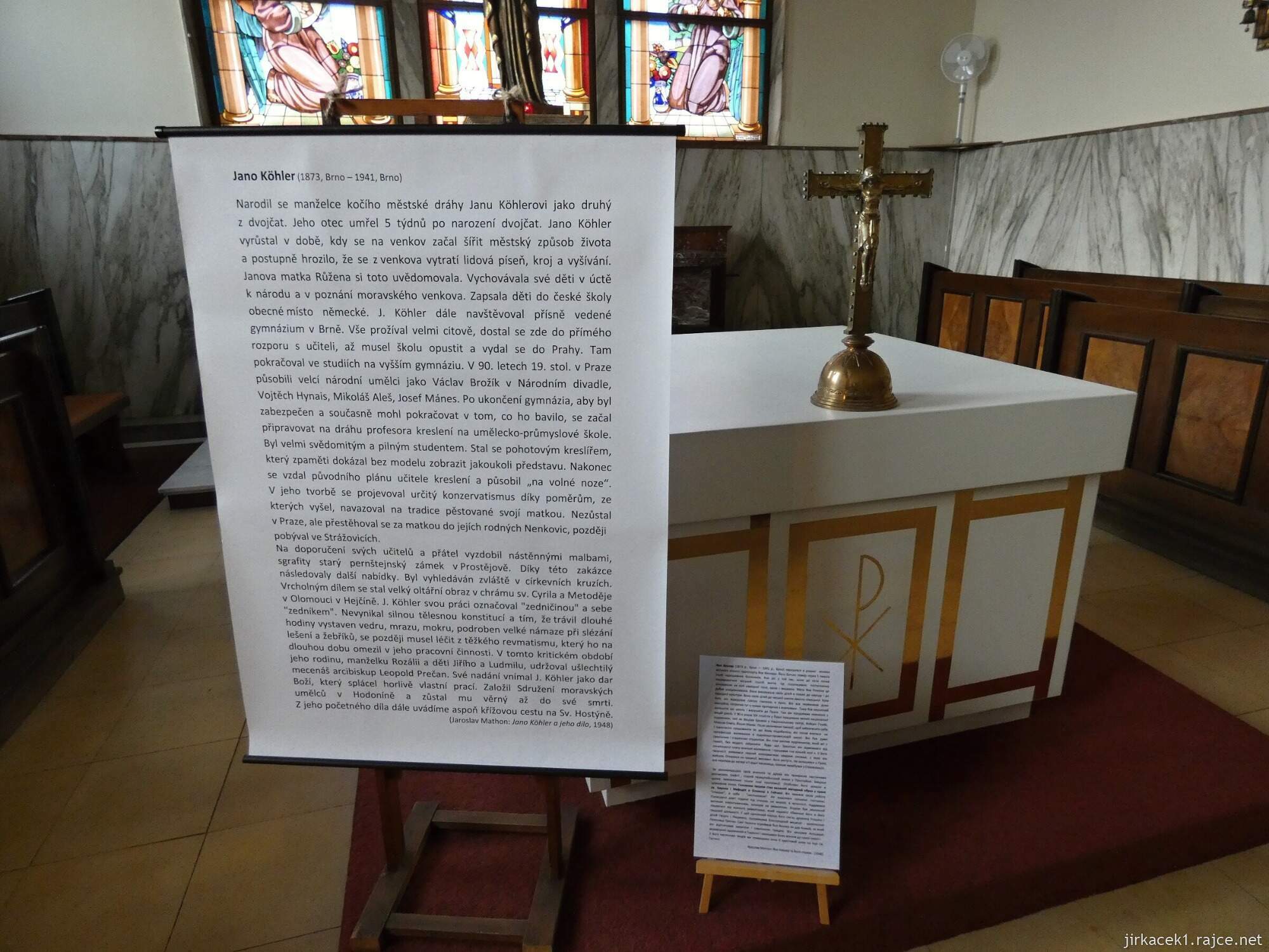 V kapli Panny Marie jsme narazili na tabuli, která nás informovala o průběhu života Jano Kohlera, s jehož dílem jsme se setkali na různých místech naší země. Viděli jsme například jeho sgrafita na prostějovském zámku, fresku sv. Cyrila a Metoděje na fasádě Jurkovičova domu v Luhačovicích, sgrafito Madona s dítětem v průčelí kostela Nanebevzetí Panny Marie a svatého Cyrila a Metoděje v Kyjově a také keramické mozaiky pašijových scén na Jurkovičově křížové cestě na Svatém Hostýnu. Tento moravský umělec se narodil a také zemřel v Brně a za svou čtyřicetiletou samostatnou výtvarnou kariéru vyzdobil bezmála 70 sakrálních a 55 světských staveb. Byli jsme rádi, že jsme mohli vidět jedno jeho dílo i takový kousek od našeho domova a když jsme si jej dostatečně prohlédli, kapli jsme opustili a vrátili jsme se do hlavní chrámové lodi.