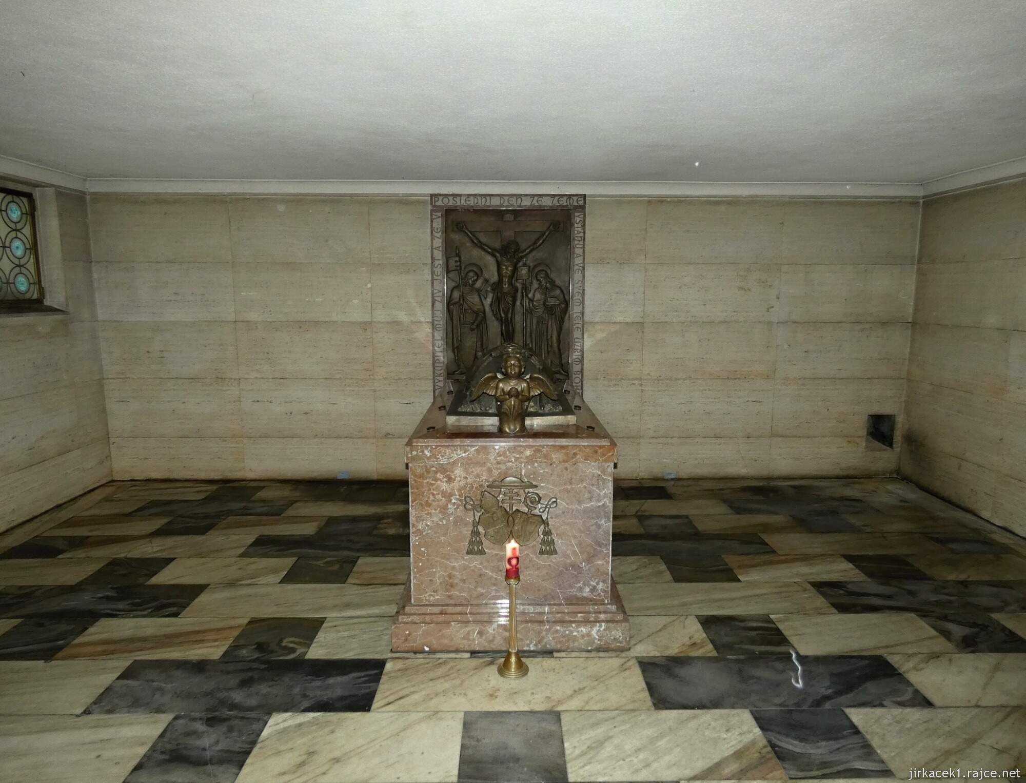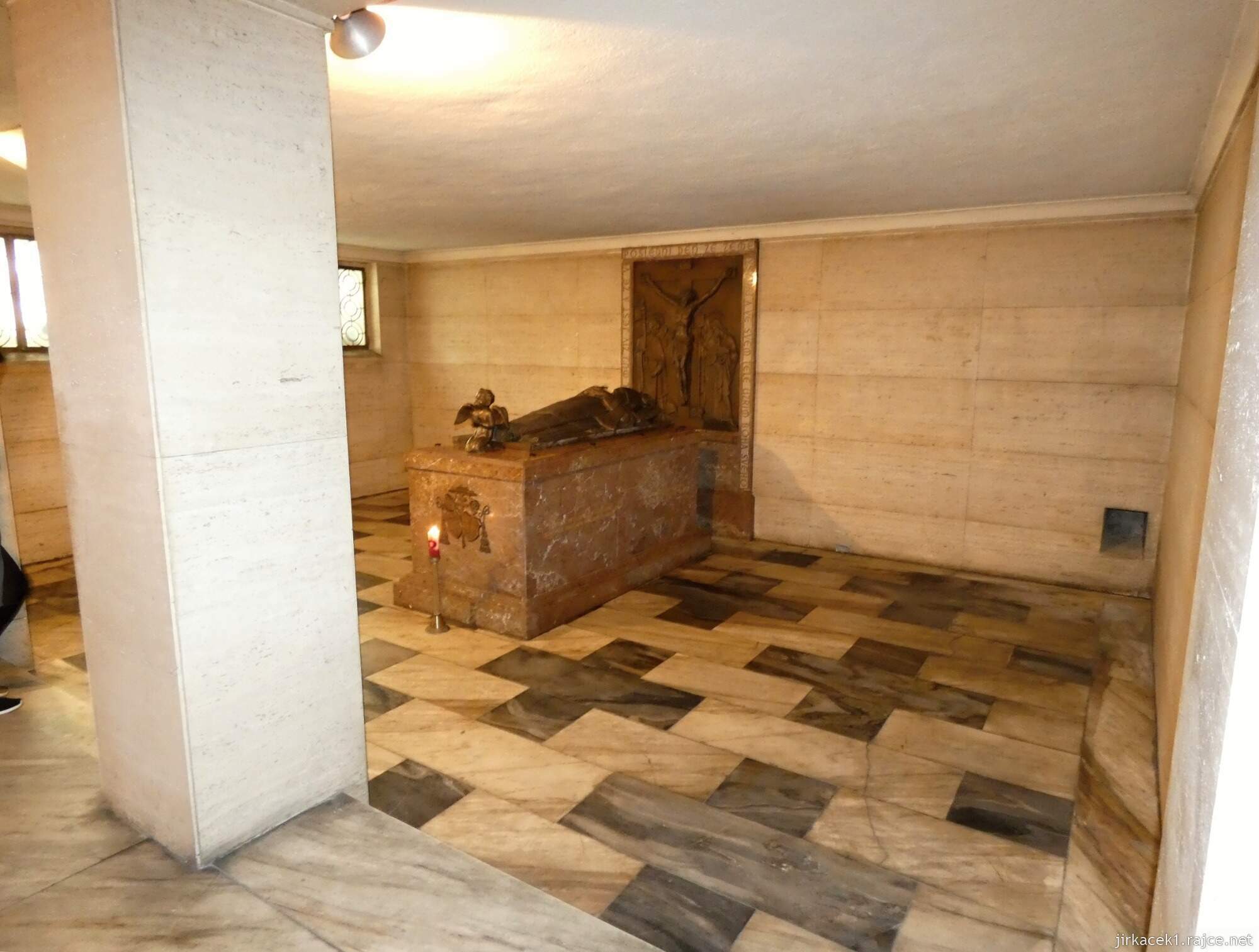 Zaujalo nás, že kostel vznikl na zelené louce a domy v jeho bezprostřední blízkosti byly postaveny později, což jsme si dokázali představit až po shlédnutí černobílých fotografií, pořízených při stavbě chrámu. Po přečtení informací na panelu jsme se přesunuli do sousední hrobky, v níž od roku 1947 na věčnost odpočíval Leopold Prečan. Na víku rakve jsme našli malého andílka a poměrně velkou podobiznu člověka, bez něhož by kostel sv. Cyrila a Metoděje v Hejčíně nevznikl. Na stěně za sarkofágem jsme spatřili reliéf se svatým Leopoldem, držící v ruce malý model hejčínského kostela, což dávalo najevo, jakou vážnost arcibiskup přikládal ke zdejšímu chrámu, v němž byl prý na vlastní přání také pohřben. Chvíli jsme před rakví postávali, snažili se ničím nenarušit komorní atmosféru v hrobce a potom jsme vyšli ven.