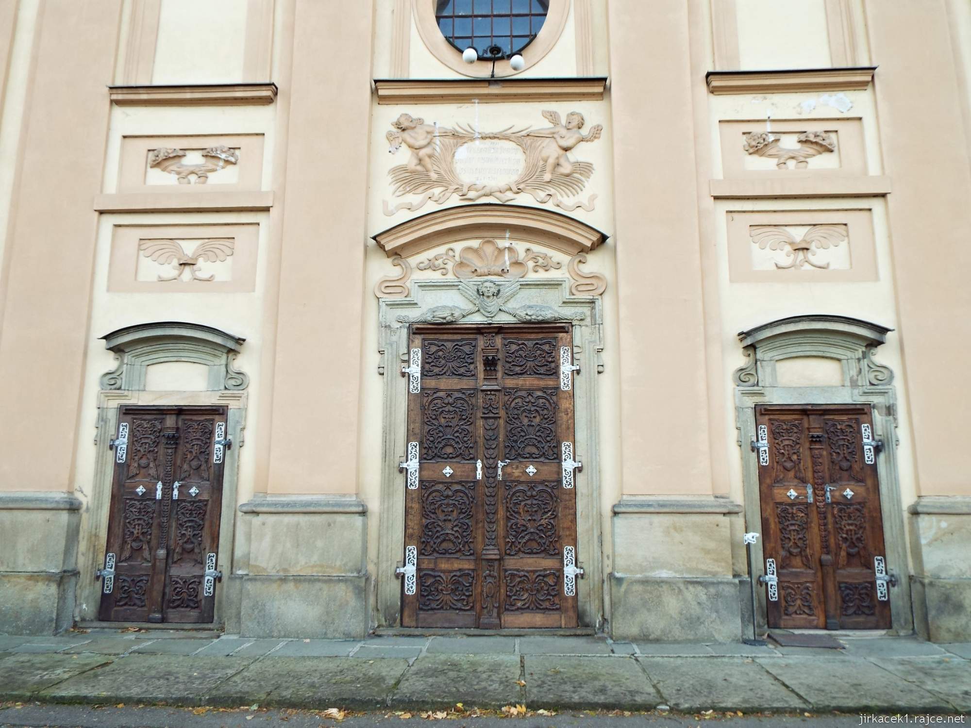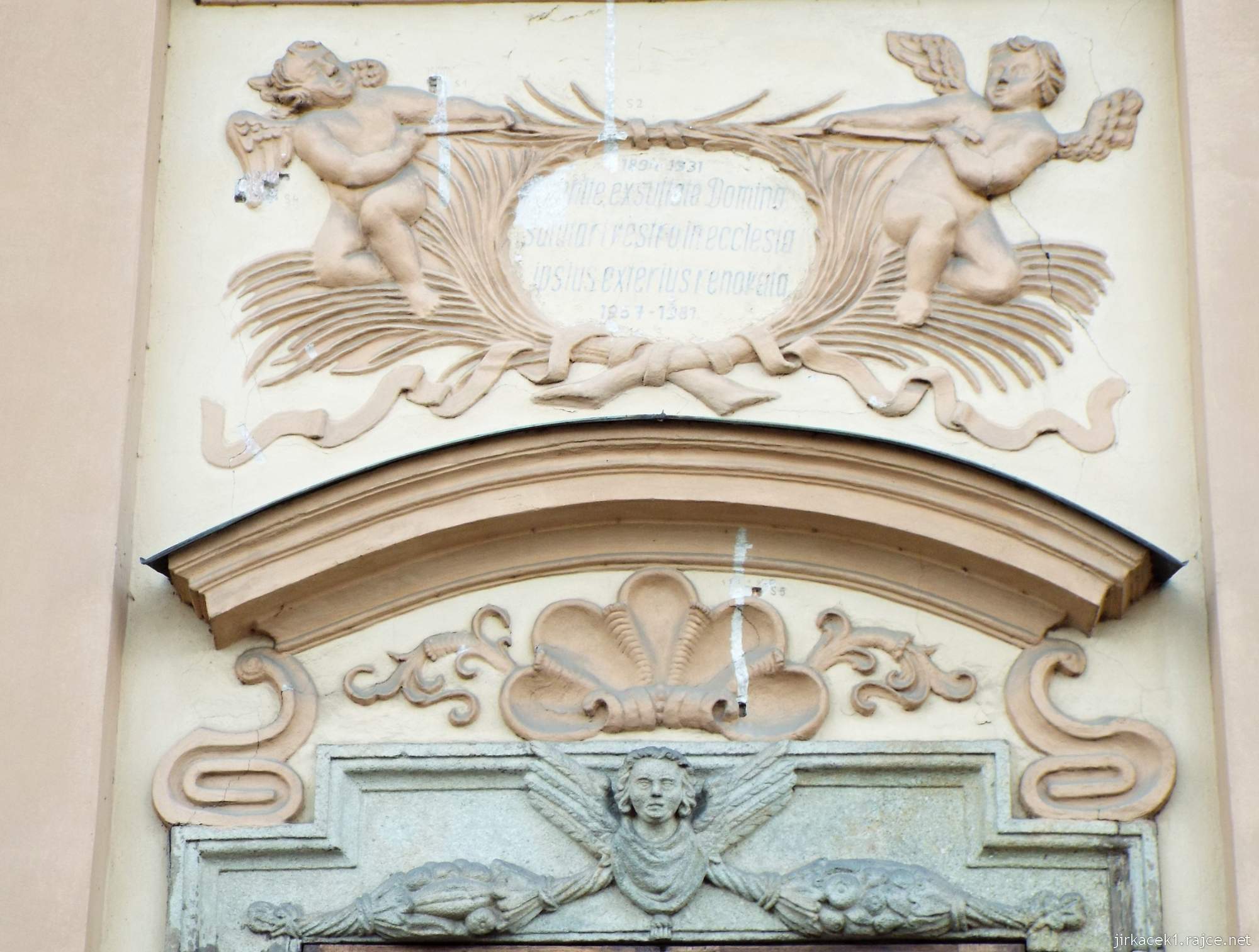 Ta byla pojmenována po Mariánském bratrstvu, založeném Hynkem Vitanovským roku 1665, ale u těch jsme už štěstí nezkoušeli a věnovali se další prohlídce bohatě štukovaného průčelí. Nad vchodem jsme uviděli hlavu andílka se štukovým zavěsem z listů, mušli a po stranách voluty. O něco výše se nad prohnutým klenákem vznášeli dva andílci, držící závěs s kartuší, na které jsme si přečetli latinský text se čtyřmi letopočty, oznamující data renovací a oprav kostela. Průčelí dále členilo několik kamenných soklú z pískovcových desek s římsou. Na nárožích jsme našli vždy dva pilastry s volutovou hlavicí a šátkem, další tři pilastry obklopovaly hlavní vchod. Naším očím neunikla ani okna se šambránami a volutami, pod nimiž se nacházely štukové květy, šátky a konzoly. Další dveře zdobily květy a ornamenty, připomínající korunu palmových listů.