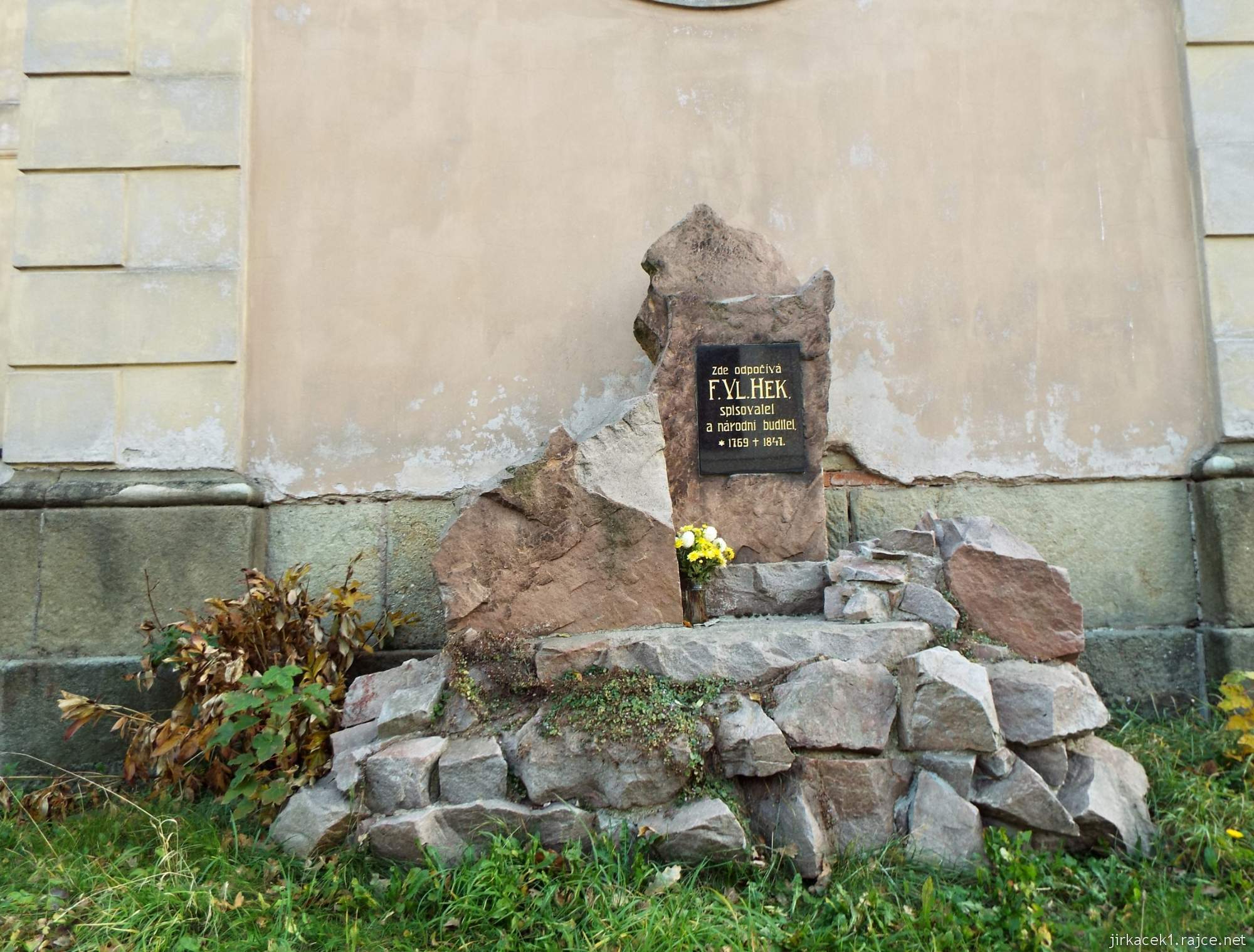 Zvonicové patro pak disponovalo půlkruhově zakončenými okny s dřevěnými dvoukřídlými okenicemi, za nimiž se ukrývaly zvony. Na střeše jsme spatřili dva kříže a pak jsme se šli podívat ke vchodu, který byl zavřený, ovšem nijak nás to nepřekvapilo. Na závěr jsme si prohlédli pomník u paty zvonice a který připomínal v Letohradě zemřelého vlasteneckého spisovatele a buditele z doby národního obrození F. V. Heka, zřízený okrašlovacím spolkem v Kyšperku v roce 1924. Náhrobek ze žulových kamenů a černou mramorovou deskou tehdy stával na hřbitově, který kostel obklopoval a byl později zrušen. Na desce jsme si přečetli vyrytý nápis Zde odpočívá F.Vl.Hek, spisovatel národní buditel. *1769 †1847 a potom jsme se seznámili s historií kostela sv. Václava, jenž byl postaven v letech 1680 - 1685 jako zámecká kaple ve stylu italského baroka.