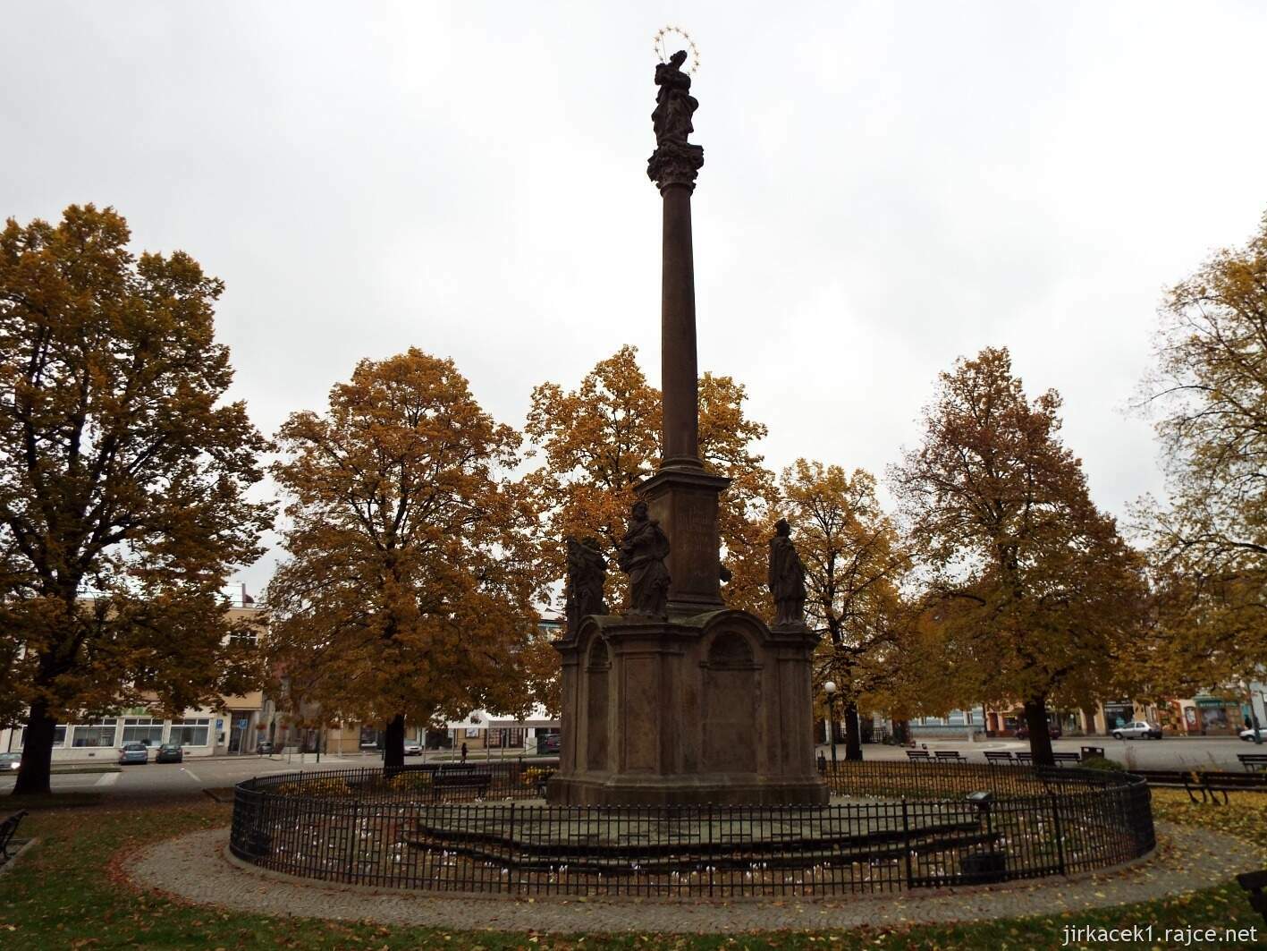 Od novodobé fontány jsme zamířili k mnohem starší památce, která se doslova tyčila uprostřed královského náměstí. Jednalo se o Mariánský či Morový sloup, který zde byl vystavěn jako upomínka na události z roku 1714. Tehdy byl uzavřen Rastadský mír s Francouzi po válkách o španělské dědictví a zároveň ve Vysokém Mýtě zabíjela morová nákaza, a tak byl sloup postaven také jako projev díků Panně Marii za pominutí moru. Díky tomu jsme tak shlédli 14 metrů vysoké pískovcové sousoší, na jehož vrcholu stála socha Neposkvrněné Panny Marie, v rozích jsme pak viděli sochy sv. Floriána, sv. Josefa, sv. Jana Nepomuckého a sv. Vavřince. Na štíhlém hranolovém sloupu jsme na stěnách objevili nápisy a kolem sousoší mladší železné zábradlí, které v 19. století nahradilo původní kamennou balustrádu.