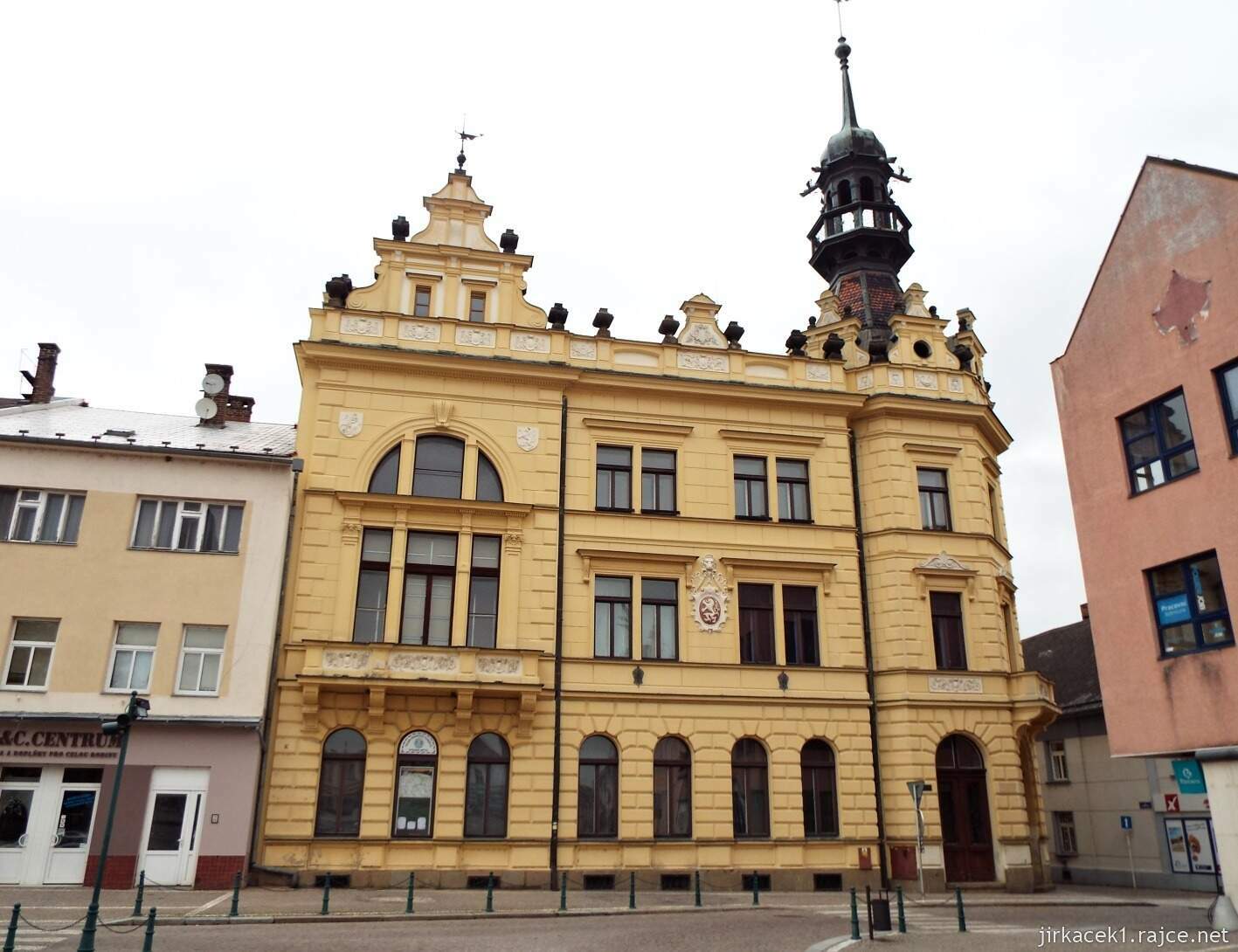 První na řadu přišla dominantní novorenesanční budova s věží, vyplňující severovýchodní kout náměstí. Byla postavená v roce 1902 na místě původního pivovaru jako sídlo okresního zastupitelství a pošty. Nároží objektu ve styku obou kolmých křídel tvořila polygonální osmiboká věž, ukončená bohatě tvarovanými novorenesančními štíty, zastřešená jehlancovou střechou krytou měděným plechem a ukončena osmibokou lucernou s ochozem a bání. Severní a západní průčelí byla zkrášlena třípatrovými štíty dělenými římsami a lisénami. Zaujalo nás, že slavnostní sál sloužil pro zasedání okresního zastupitelstva a byl vyzdoben secesními nástěnnými malbami Jana Doubka. Na pěti jeho lunetách tak byly zachyceny výjevy z minulosti Vysokomýtského okresu. Po zrušení okresu sloužil zasedací sál jako výstavní prostory Městské galerie Vysoké Mýto.