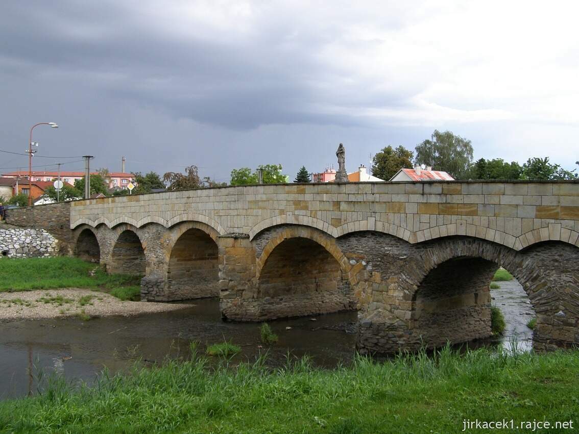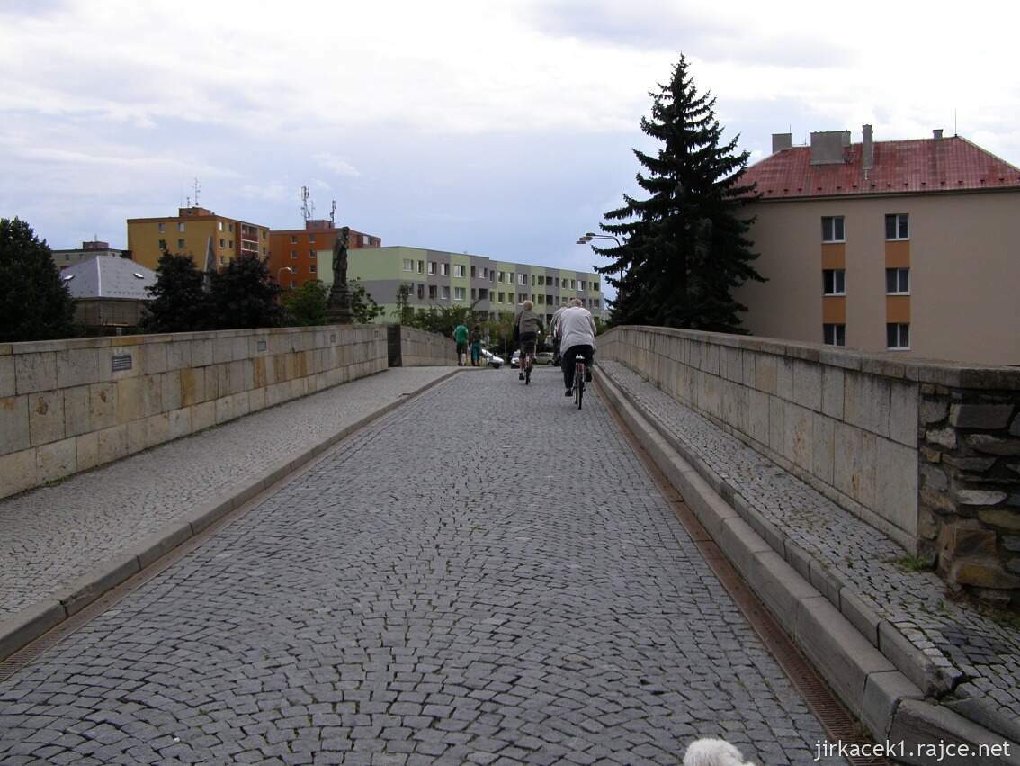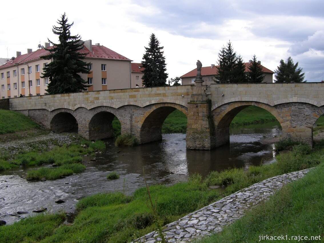 Na úplný závěr jsme si nechali druhou procházku po Svatojánském mostě, na němž se toho mezitím moc nezměnilo, pouze vody teklo v Moravě o poznání méně, což se však mělo brzy změnit. K jedné z nejkrásnějších litovelských staveb jsme přišli od pošty a velmi pomalým krokem jsme se znovu po pěti letech procházeli po nejstarším kamenném mostě na Moravě a zároveň třetím nejstarším v naší zemi. Jelikož kamenného krasavce se šesti oblouky neslo pět hranolových pilířů, stavěných poctivě našimi předky v letech 1590 – 1592, kráčeli jsme po něm naprosto bez obav. Uprostřed mostu jsme se zastavili, jelikož jsme zde narazili na barokní sochu sv. Jana Nepomuckého v životní velikosti, stojící na kamenném soklu s římsou, na jehož čelní straně jsme spatřili reliéf, znázorňující svržení světce z mostu.