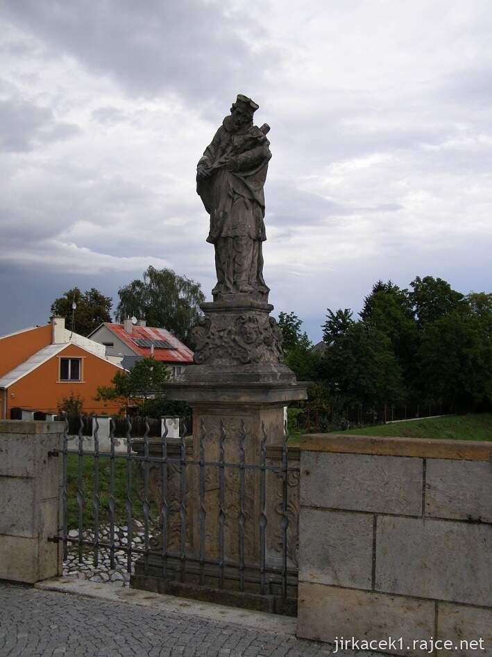Na nároží podstavce jsme našli hlavičky andělů a nad nimi jsme si konečně prohlédli esovitě prohnutou sochu našeho nejpopulárnějšího světce s biretem na hlavě a s křížem v náručí. Když jsme si sochu od umělce Jana Sturmera prohlédli, došli jsme na konec 57 metrů dlouhé stavby a sešli dolů na nábřeží, odkud jsme pořídili několik dalších fotografií. Pak jsme stejným způsobem učinili z opačné strany, z níž socha nebyla tak dobře vidět, ovšem ani podruhé jsme nevstoupil do stejné řeky a nesmočili nohy ve vodách Moravy. Namísto toho jsme se začali vracet po mostě na opačný břeh směrem k poště, což by nebylo možné, pokud by německá armáda zrealizovala svůj záměr vyhodit jej do vzduchu. Chtěli tak učinit roku 1945, kdy okupanti podminovali všechny litovelské mosty, ale naštěstí se delegaci zástupců města podařilo vojáky přesvědčit, aby historický objekt nezničili.