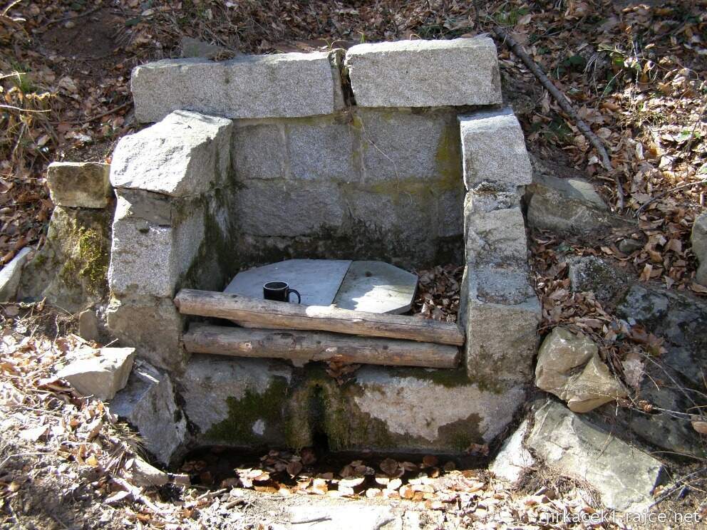 Nicméně se nám potvrdilo staré známé rčení, že všechno zlé je k něčemu dobré, protože jsme díky absenci porostu v okolí studánky objevili její druhou část. Při první návštěvě jsme totiž viděli jen její horní polovinu a vůbec jsme si nevšimli, že se o pár metrů níže, ve svahu nad cestou, nacházela druhá kamenná zídka. Nejprve jsme ovšem prozkoumali horní půlku studánky, taktéž tvořenou kamennou zídkou, na níž byly postaveny hrníčky. Pod zídkou se nacházela kruhová nádoba s vodou, jež byla minule zakrytá, a i když jsme ji tentokrát jsme našli otevřenou, neměli jsme odvahu si v ní ani opláchnout ruce. Když jsme se otočili, spatřili jsme druhou půlku studánky, která vypadala hodně podobně, ale na rozdíl od její sestry ze zdi trčela trubka, takže to vypadalo, jakoby se jednalo o sourozenecký pár.