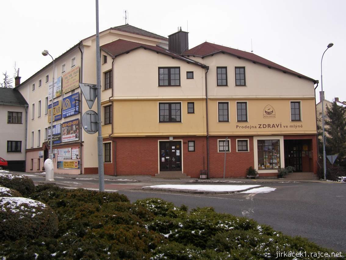 Pak jsme park i zámek opustili a zamířili k bývalému vodnímu mlýnu na břehu Tiché Orlice. Když jsme přešli most přes řeku, tak jsme vzápětí dorazili ke čtyřpatrové budově se secesními prvky z roku 1916, která vznikla po požáru, jenž o rok dříve zničil starý mlýn, elektrárnu i sousední pilu. Mlýn jsme si nejprve prohlédli z jeho přední části, ve které se nacházela prodejna se zdravými potravinami, které jsme si prohlédli za výlohou.