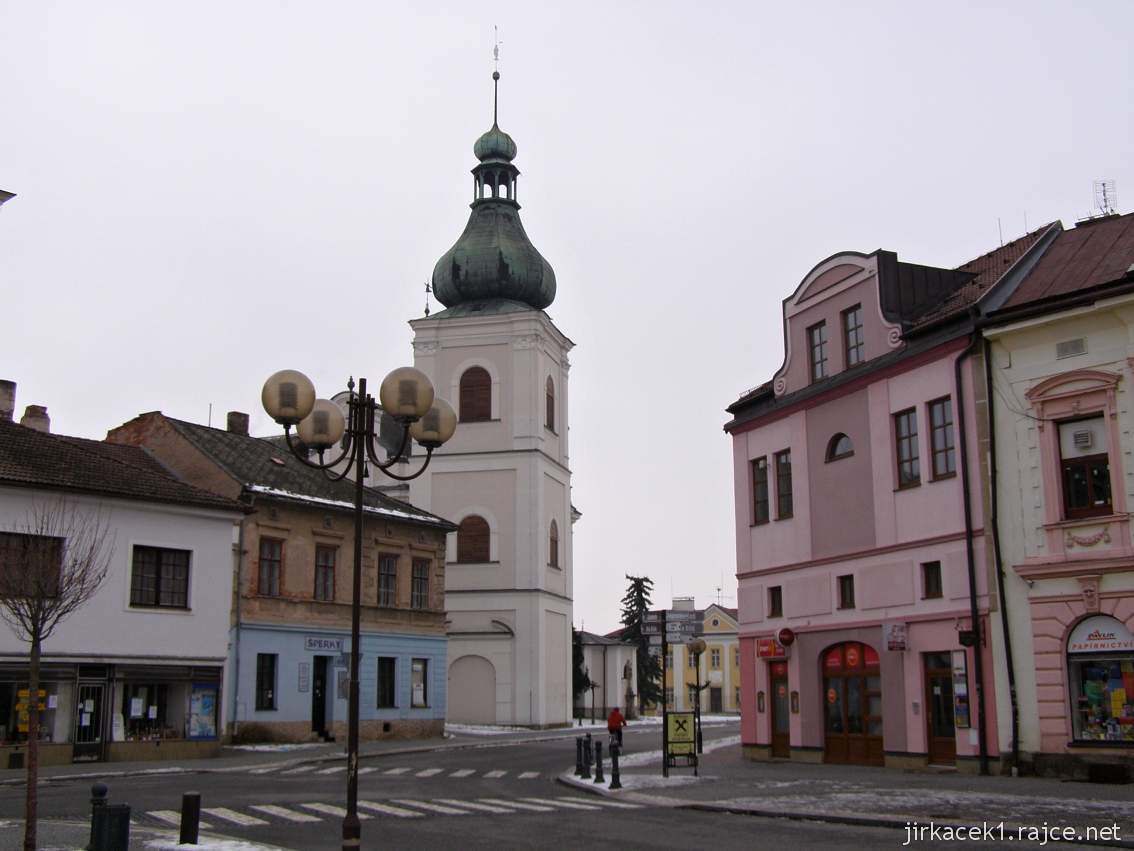 Potom jsme se krátce zastavili u rozcestníku naproti obchodní akademie a následně jsme již Tyršovo náměstí opustili. Pěšky jsme zamířili k nedalekému kostelu sv. Františka Serafínského a brzy jsme k němu dorazili. Jako první nám však padla do oka bílá samostatně stojící třípodlažní barokní zvonice s bání z let 1702 - 1703 od Mikuláše Rossiho, jejíž fasádu zdobily lizénové rámy a v nejvyšším patře pilastry.