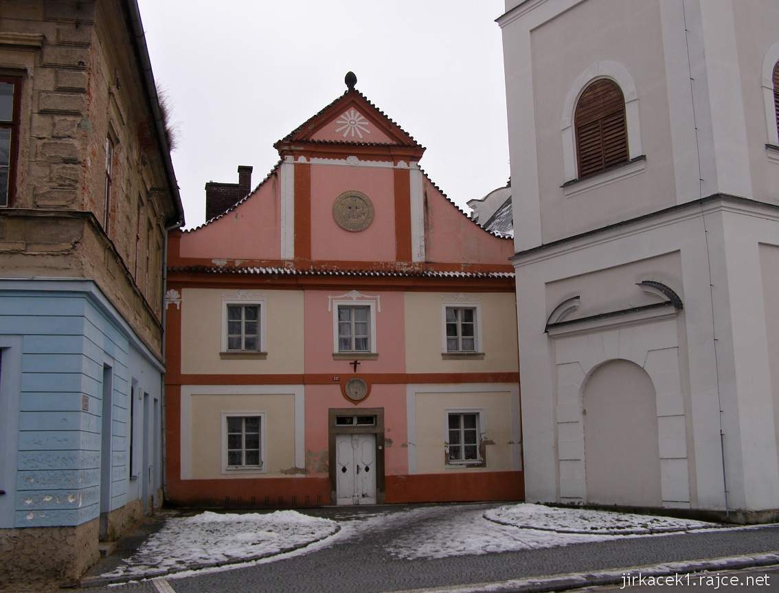 Vedle zvonice nás zaujal barevný domek z roku 1750, v němž býval špitál a v době naší návštěvy v něm sídlil Klub seniorů. Červenou fasádu tohoto domu zdobily bílé doplňky, například lizény a rámy okolo oken. Ze středu domu mělce vystupoval rizalit, v němž se také nacházel vchod do budovy. Nad dřevěnými dveřmi jsme uviděli plastický starší znak města Chocně od J. Paukerta z roku 1922.