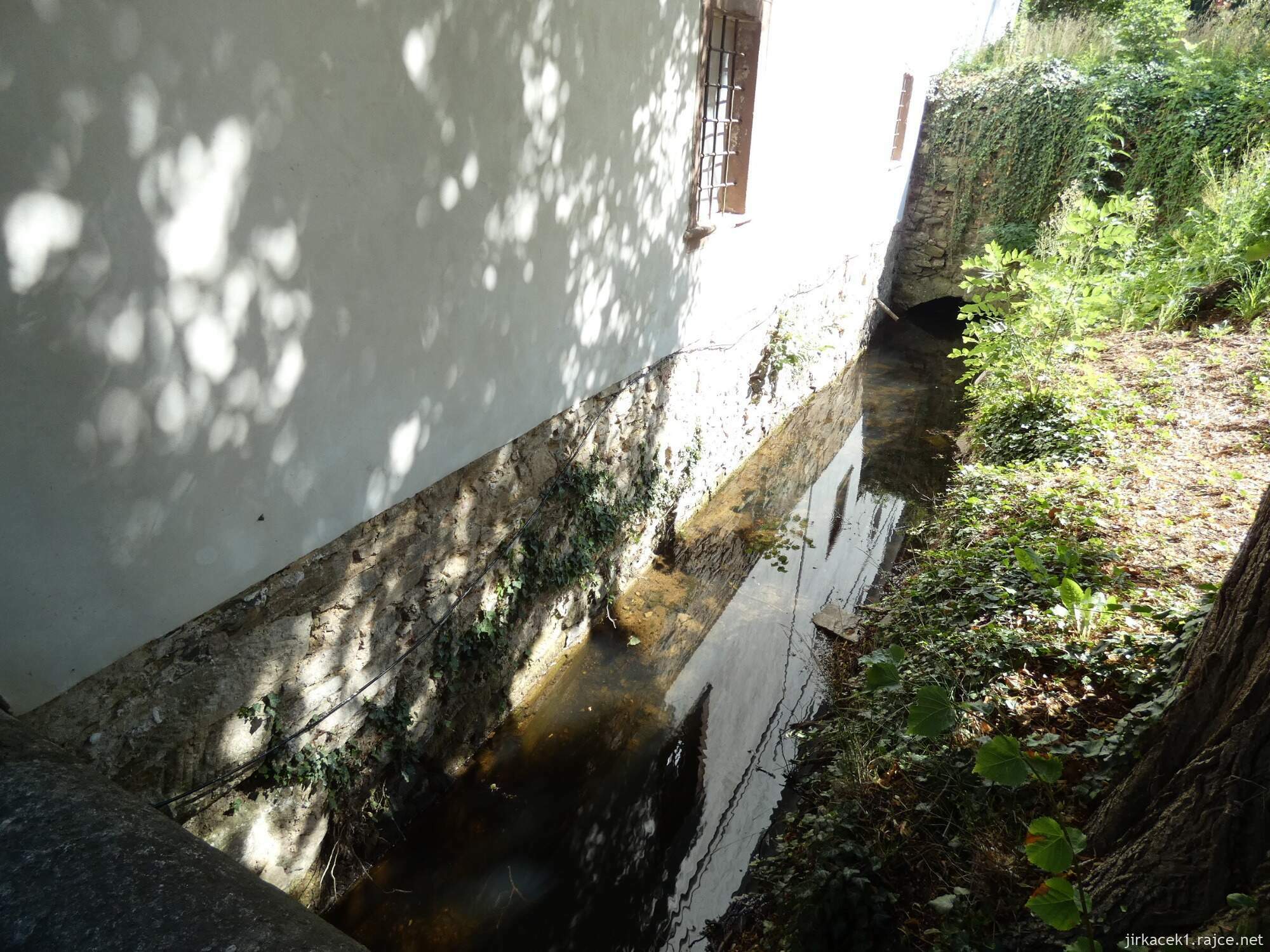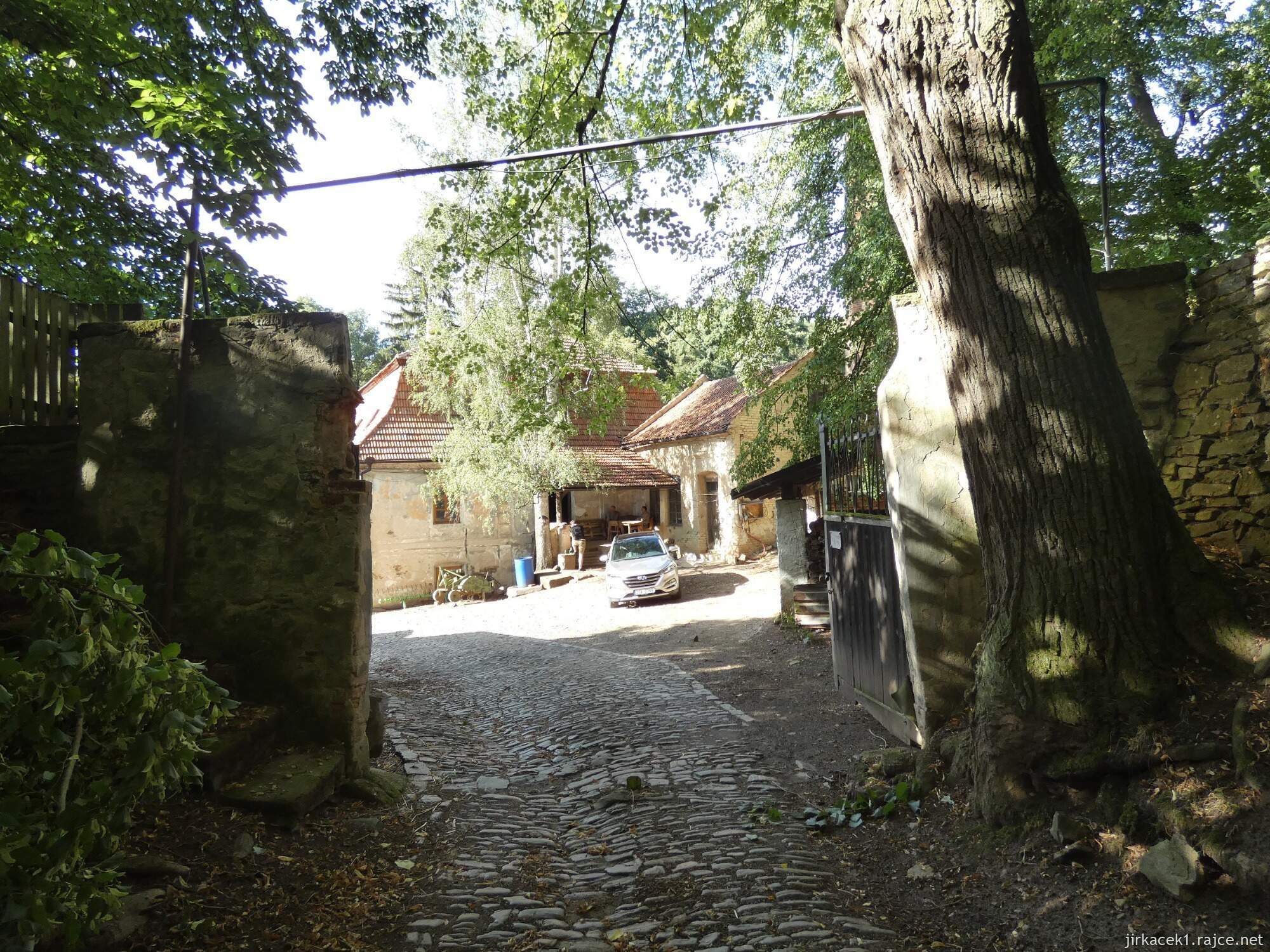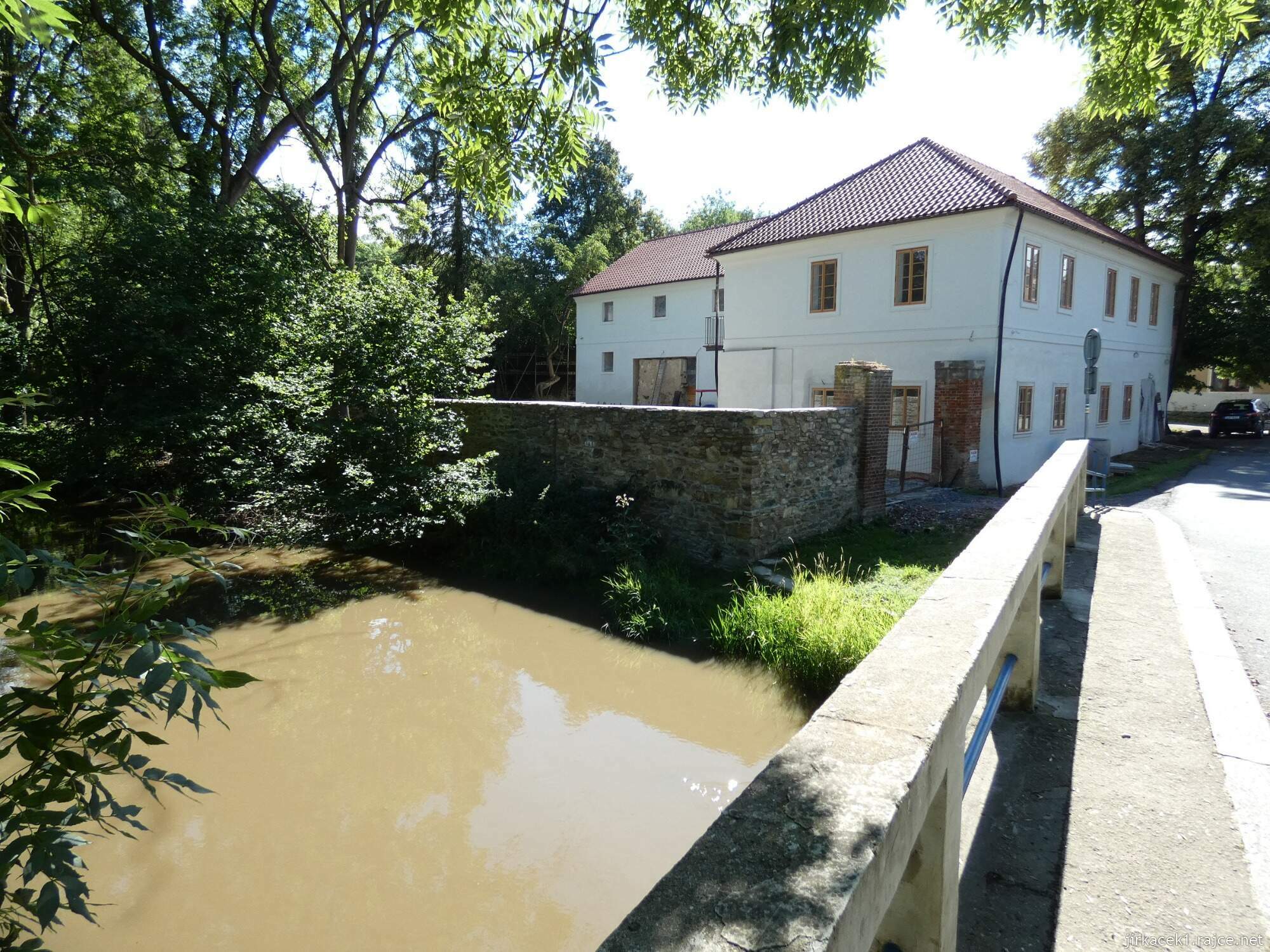 Vzájemná blízkost obou mlýnů nás docela překvapila, nicméně vysvětlení bylo jednoduché. Oba totiž patřily do majetku cisterciáckého proboštství v Kouřimi, o čemž svědčí zápisy v listinách z roku 1407. I když mlýn od svého založení změnil podobu z dřevěného domku na klasicistní kamennou budovu, kterých v naší zemi stojí bezpočet, stejně si zasloužil právem naši pozornost a rádi jsme si jej prohlédli. Kromě samotné budovy z 19. století, rozdělené na obytnou část a mlýnici, jsme u boční strany našli zbytek náhonu, takže pro nás nebyl problém určit místo, kde se kdysi s pomocí vodstva říčky Výrovky točilo mlýnské kolo. Navíc se dům v době naší návštěvy opravoval a jeho bělostná fasáda zářila jako hvězda na nebi. Naproti vjezdu na nádvoří mlýna jsme narazili na obvodové zdi z kamene, které vypadaly jako hradby.