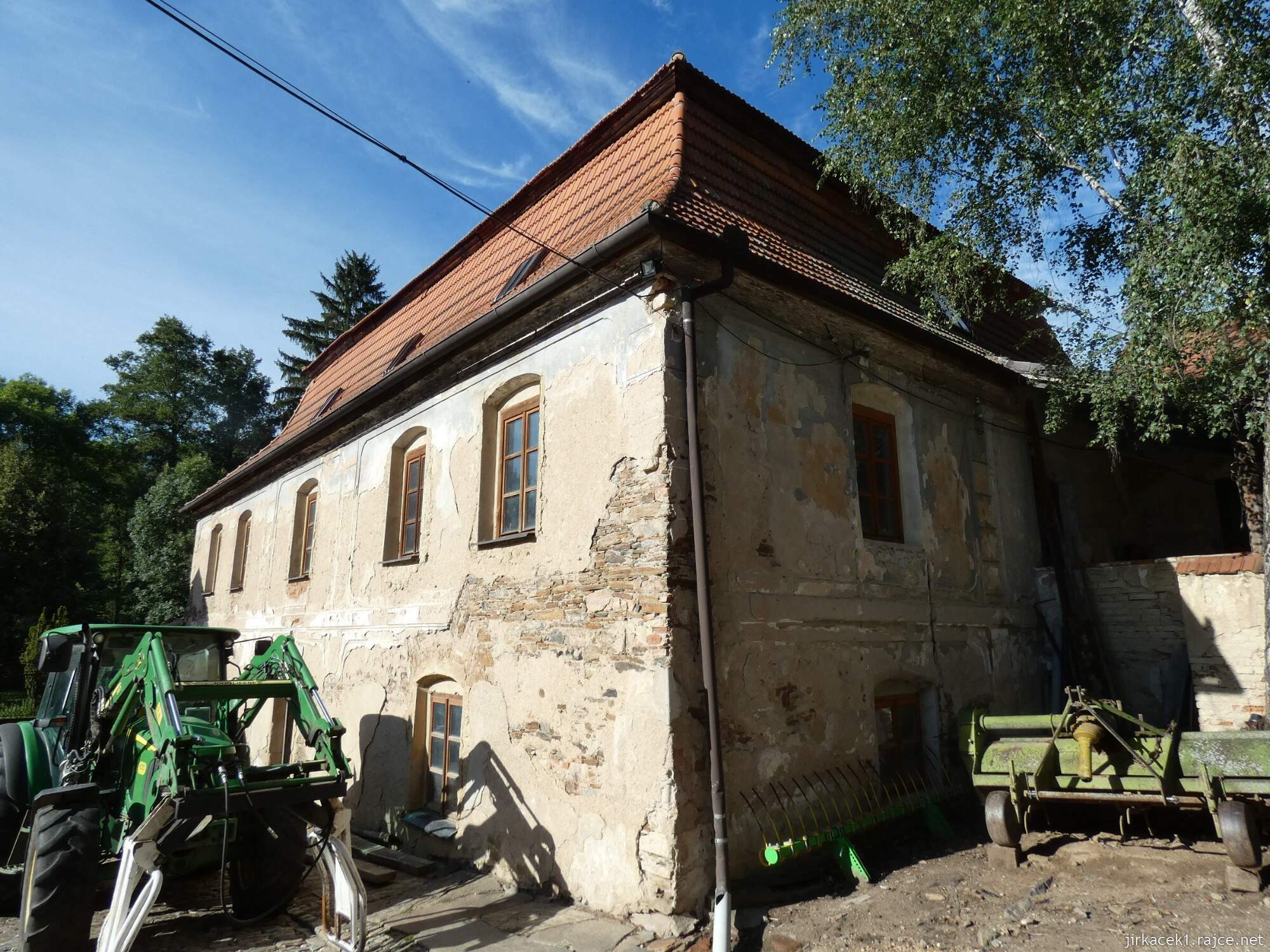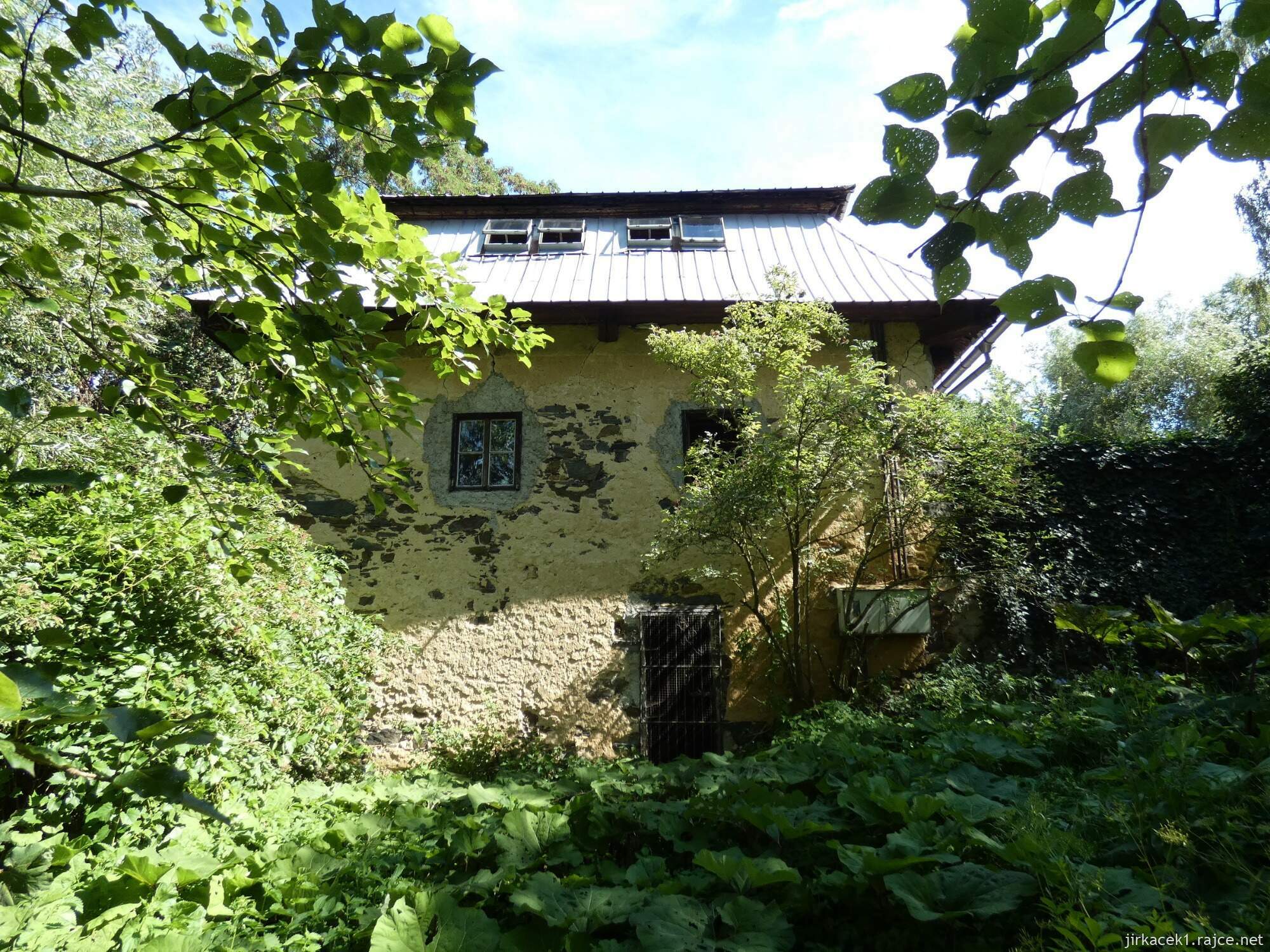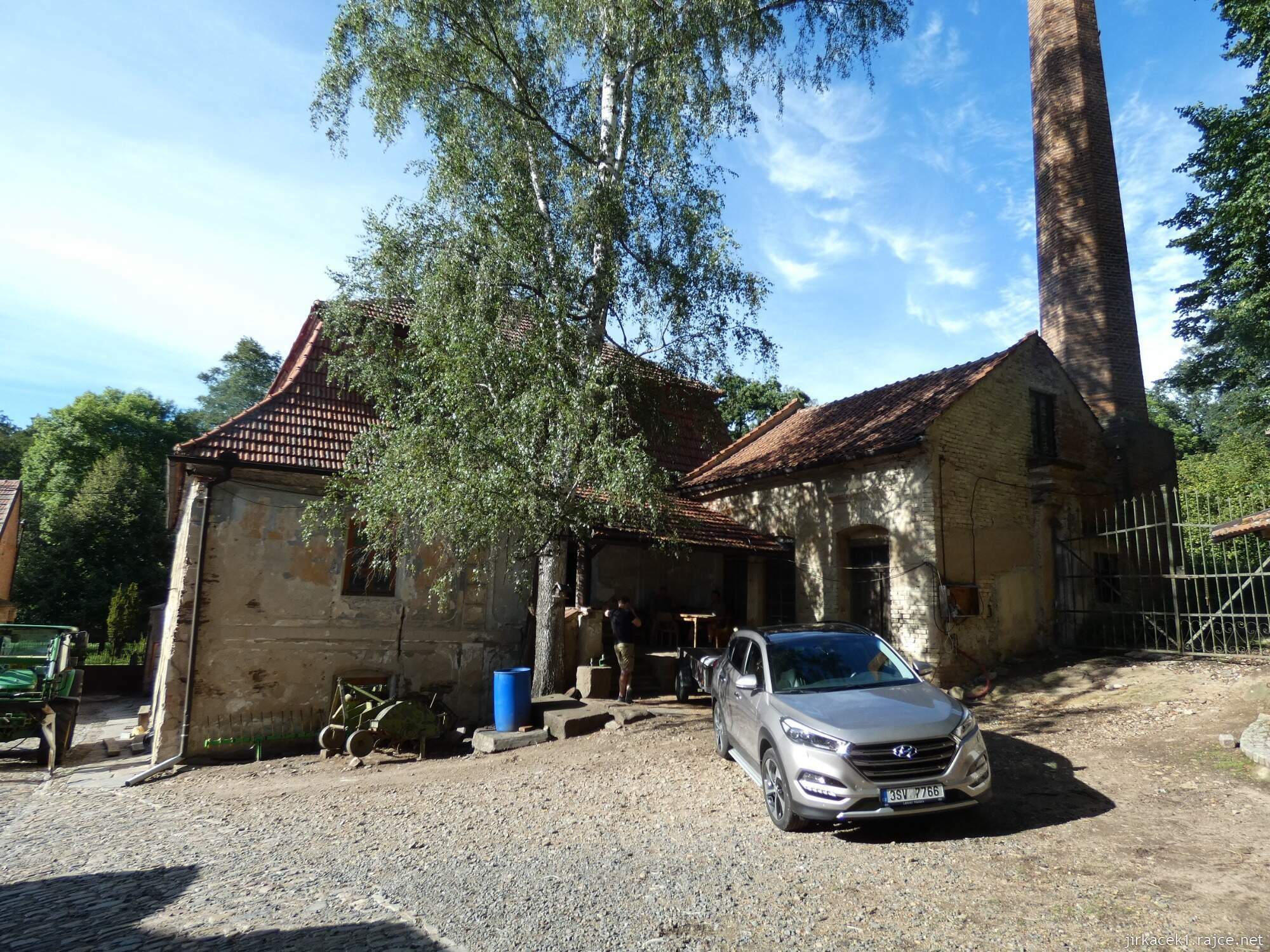 Autem jsme totiž zastavili na okraji silnice přímo nad mlýnem a výhled na něj nám dokonale zastínily stromy. Oč méně jsme z klapáče viděli, paradoxně o to více jsme z něj slyšeli. Na zahradě u mlýna se totiž konalo nějaké rodinné setkání, neboť naše uši zachytily tlumený rozhovoru dospělých a halasný křik většího počtu dětí. Evidentně se všichni dobře bavili a jelikož jsme nechtěli rušit jejich zábavu či je při tom dokonce fotit, na obhlídku mlýna jsme vůbec nevyrazili. Pouze jsme se šli podívat na přilehlý rybník, který poháněl vodní kolo na svrchní vodu, jež se zde točilo ještě pár let po druhé světové válce. Z vodního kola se ovšem dochovala pouze hřídel a transmise, vedoucí do přilehlé stodoly, kde poháněla zemědělské stroje a mlýn byl stejně jako většina jiných adaptován na bydlení.