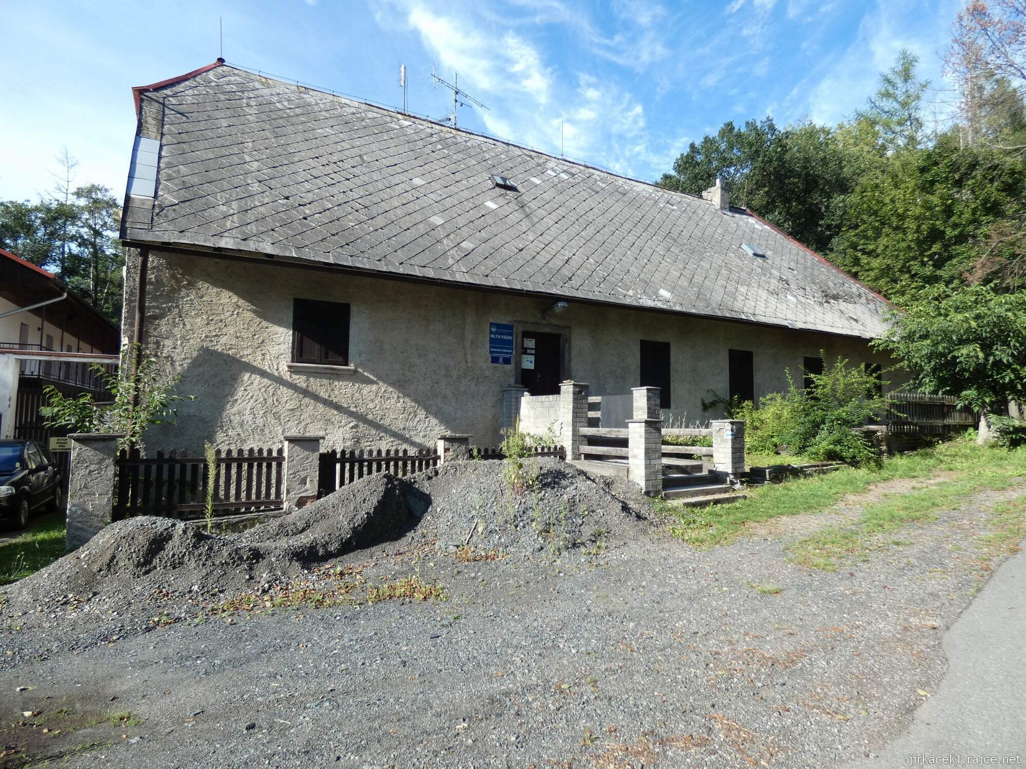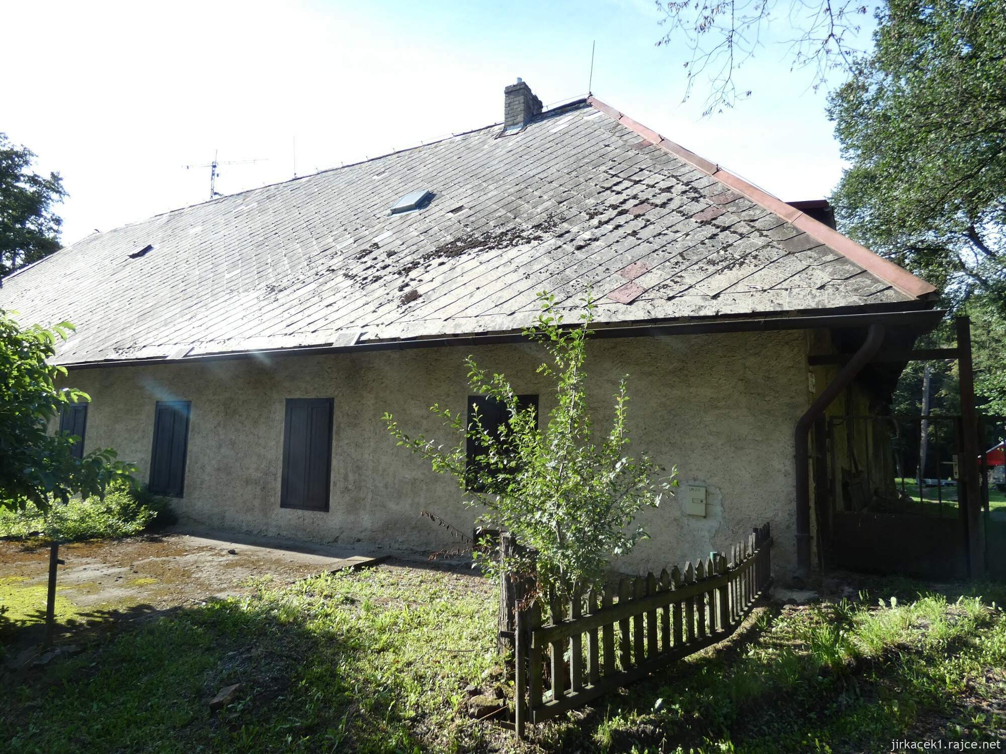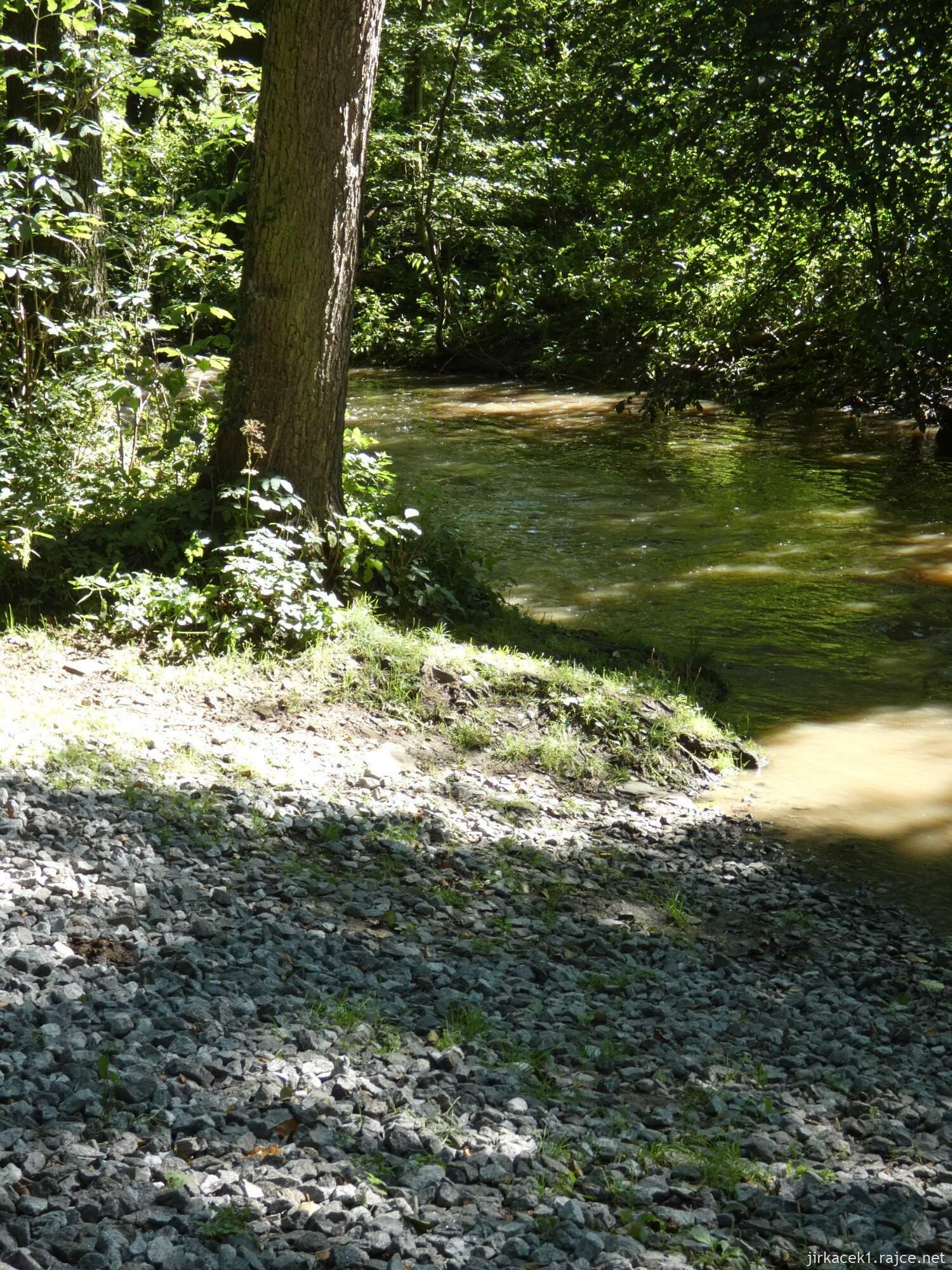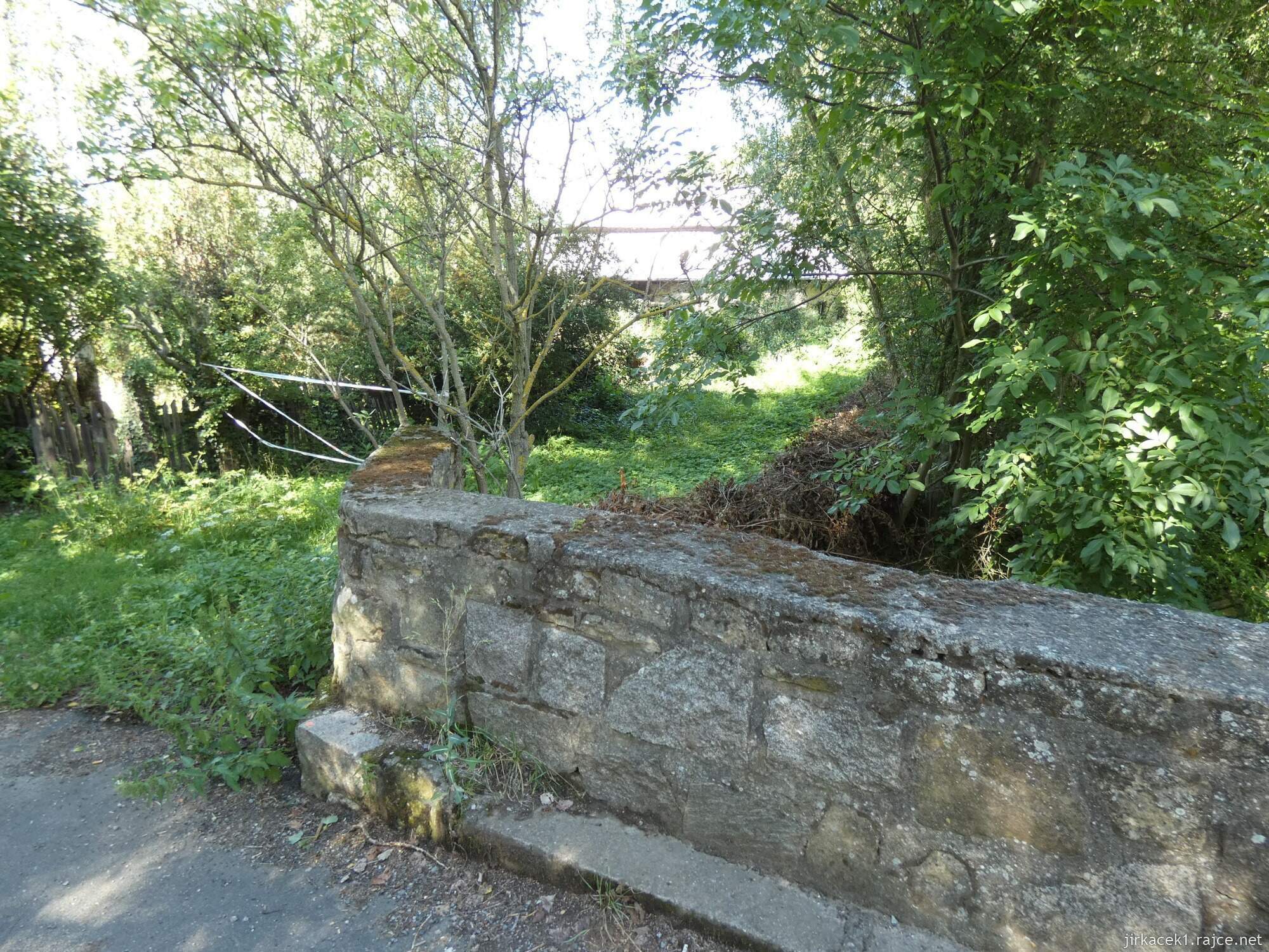 Autem jsme totiž zastavili na okraji silnice přímo nad mlýnem a výhled na něj nám dokonale zastínily stromy. Oč méně jsme z klapáče viděli, paradoxně o to více jsme z něj slyšeli. Na zahradě u mlýna se totiž konalo nějaké rodinné setkání, neboť naše uši zachytily tlumený rozhovoru dospělých a halasný křik většího počtu dětí. Evidentně se všichni dobře bavili a jelikož jsme nechtěli rušit jejich zábavu či je při tom dokonce fotit, na obhlídku mlýna jsme vůbec nevyrazili. Pouze jsme se šli podívat na přilehlý rybník, který poháněl vodní kolo na svrchní vodu, jež se zde točilo ještě pár let po druhé světové válce. Z vodního kola se ovšem dochovala pouze hřídel a transmise, vedoucí do přilehlé stodoly, kde poháněla zemědělské stroje a mlýn byl stejně jako většina jiných adaptován na bydlení.