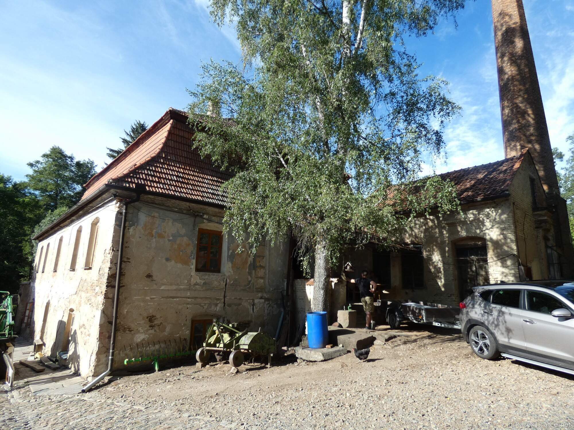 Kráčeli jsme po louce kolem několik desítek metrů vzdálených budov, z nichž se později vyklubaly budovy v mlýnském areálu. To jsme však zjistili až poté, co jsme se vrátili k autu a rozhodli se zajít pro radu do zmíněného areálu. Když jsme přišli ke vstupní bráně, vylekal nás štěkot psů, ale šelmy byly naštěstí zavřené v kotci a vzápětí nás uklidnil pohled na trojici mužů, sedících na terase domu. Zvědavě si nás prohlíželi a v očích se jim zračila otázka, co tady děláme. Rádi jsme jim vysvětlili důvod naší návštěvy a muže, z něhož se vyklubal majitel pozemku, jsme poprosili o možnost prohlídky a svolení s pořízením fotografií. Souhlas jsme dostali, ovšem dovnitř domu jsme vpuštěni nebyli, což jsme docela chápali. Byli jsme rádi za to, že jsme se mohli projít alespoň po nádvoří.