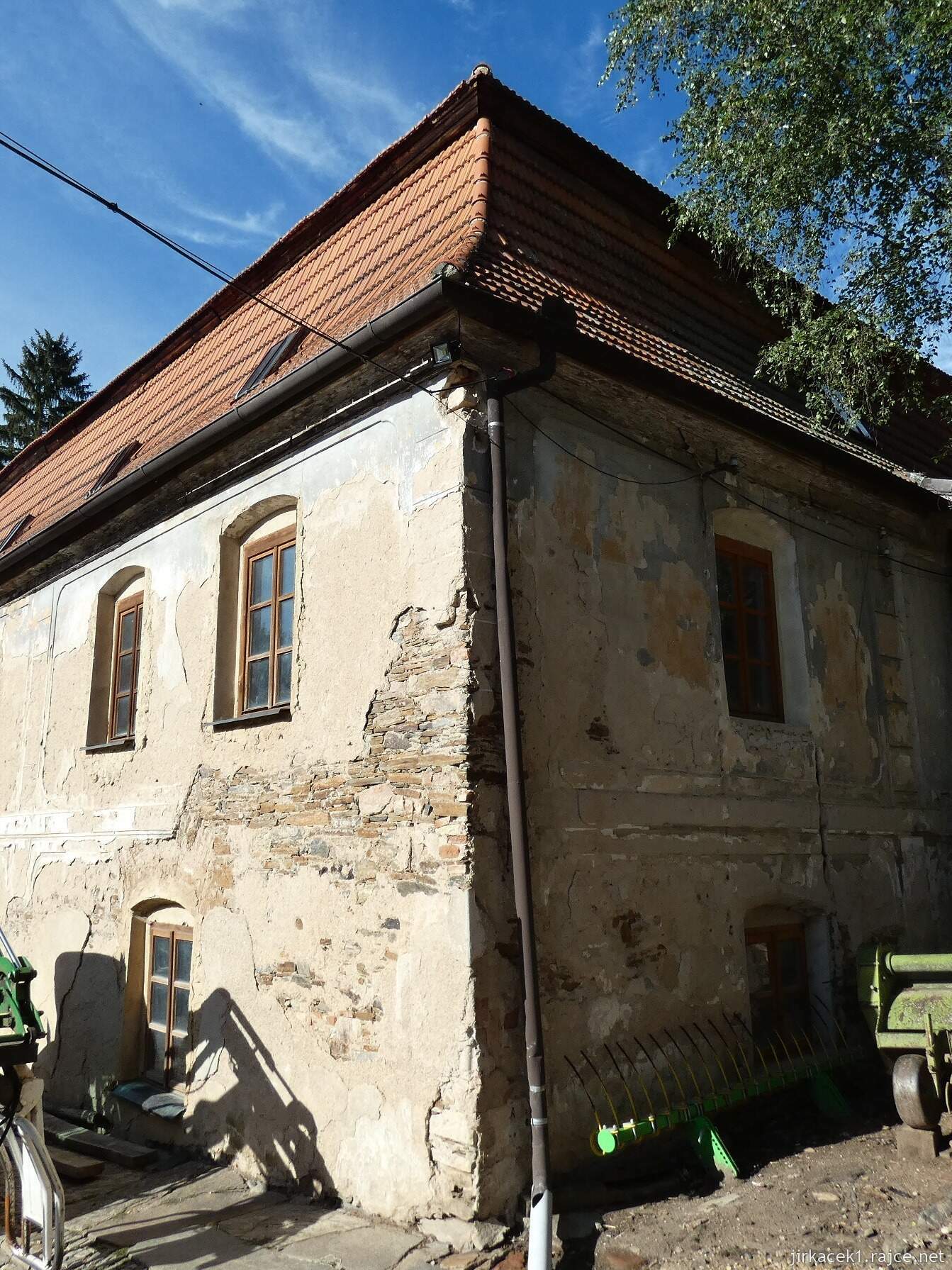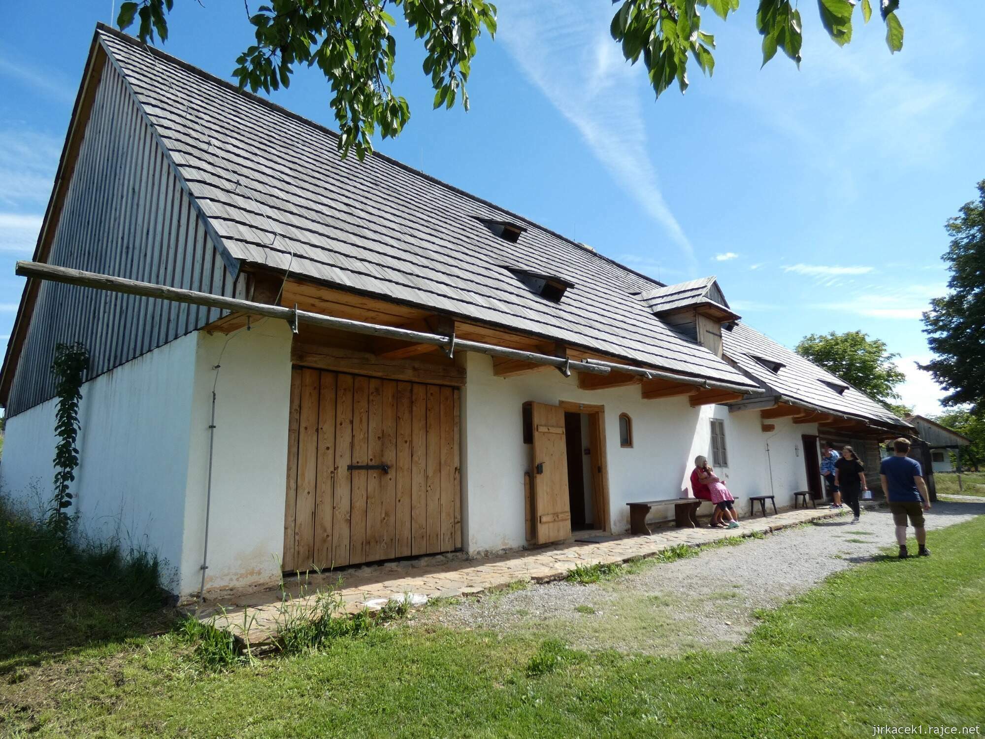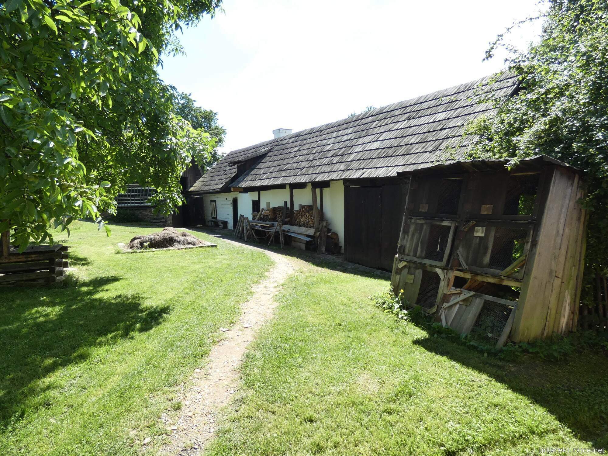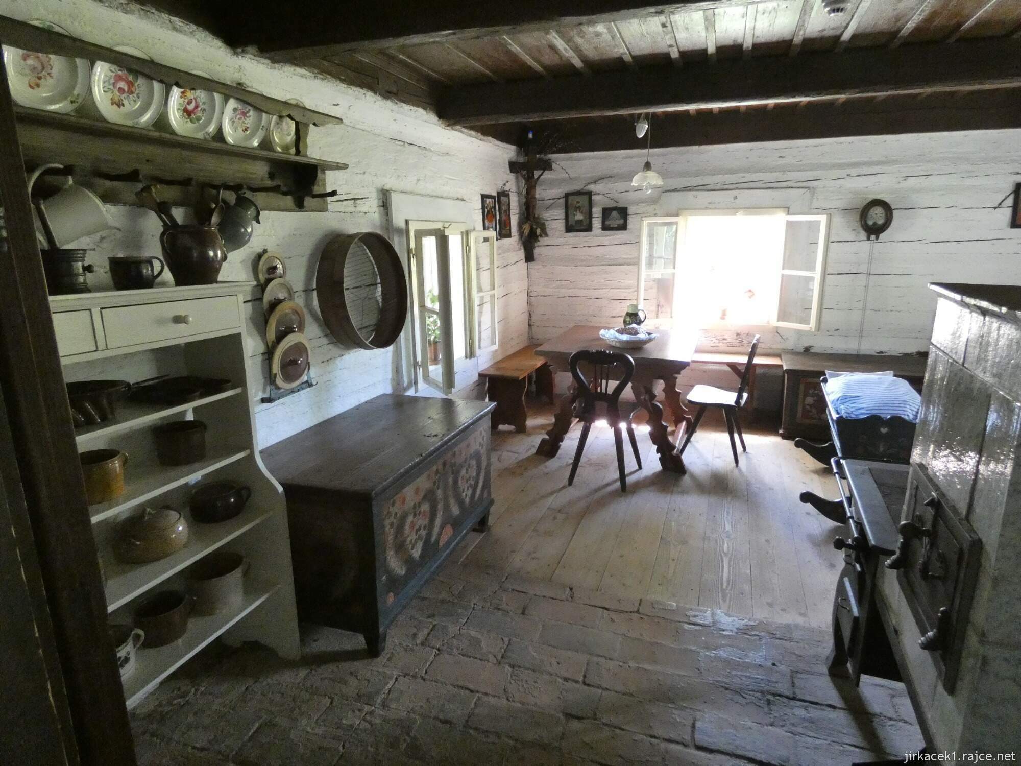 Místnost obývalo až sedm členů domácnosti, což jsme si nedokázali moc představit, i když na tehdejší poměry to nebylo až tak moc lidí. Světnici vytápěla chlebová pec s později přistavěným kachlovým sporákem, kromě kterého jsme zde našli postýlku, kolíbku, malovanou truhlu a různé nádobí na policiích či stole. Pak jsme se podívali do drobné síně, v níž nás zaujala zděná černá kuchyně, kterou jsme vždy v různých objektech po České republice rádi obdivovali. Následně jsme se věnovali hospodářské části vlastního domu, která se skládala z chléva, přístupného nejen ze zápraží, ale i přímo ze síně, což bylo praktické řešení při každodenní obsluze zde chovaného dobytka a malého chléva, kde jsme spatřili kóje pro zvířectvo a malý vozík.