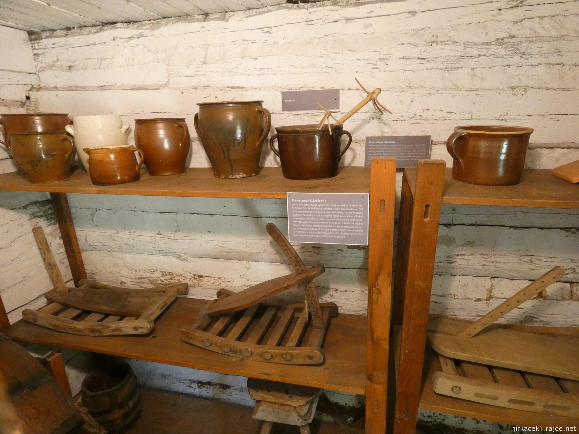 Další naše kroky vedly k přistavěnému roubenému patrovému špýcharu s krátkou pavláčkou a zděným sklepem. Po pár schodech jsme vystoupali nahoru a vešli dovnitř sýpky, v níž jsme si pohlédli několik předmětů z domácnosti drobného chalupníka na konci 19. století. Viděli jsme další malovanou truhlu s keramickými nádobami, dřevěnou lavici, různé džbery a na stěnách visely známé zemědělské nástroje v čele s cepem, pilami či síty. Dále jsme zde našli tabuli s informacemi o životě lidí kolem řeky Želivky, která hrála důležitou roli při obsazování zdejší zvlněné krajiny. Dočetli jsme se, že kromě zemědělství se lidé živili vorařstvím, lesním pracemi a prací ve mlýnech či pilách, kterých bylo na řece dost. Teprve o mnoho let později se část z nich při průmyslové revoluci přemístila do pivovaru nebo lihovaru.
