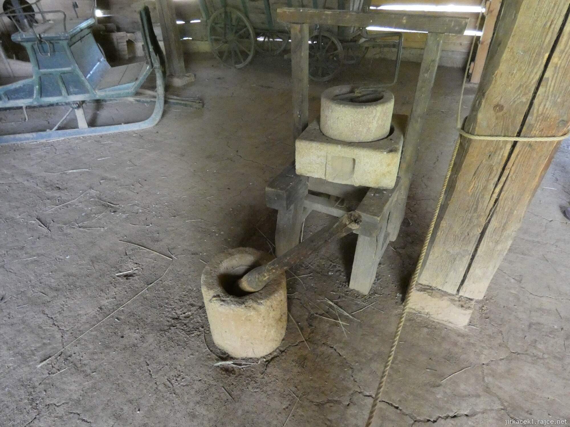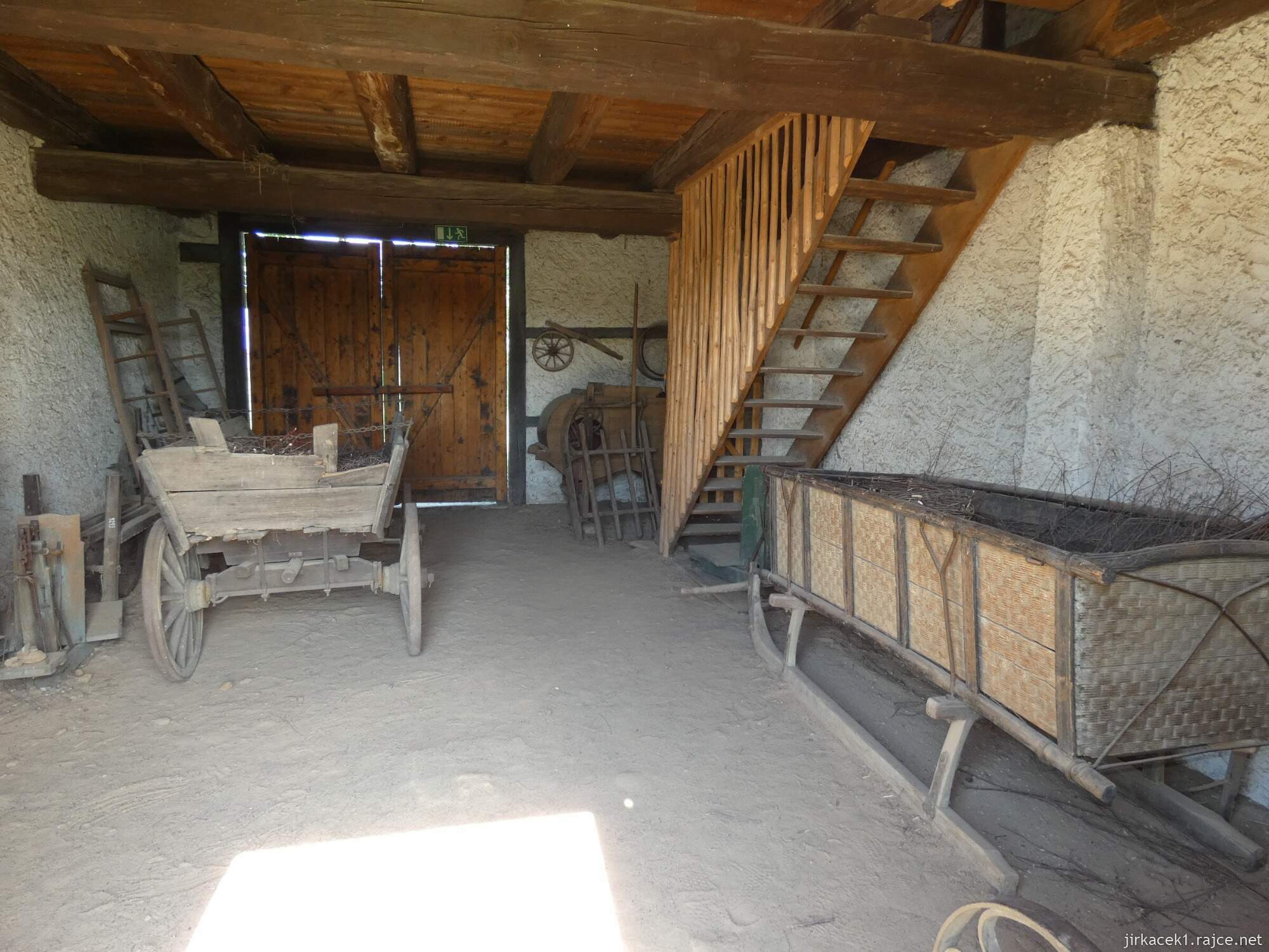 V kolně stál dřevěný povoz a sáně, dále decimálka a pár zemědělských nástrojů. Spatřili jsme také schody do nižšího patra, kde bývala uskladněná sláma a pak jsme nahlédli do sousedního chléva. V něm byl malý řebřiňák, trakař, malé necky a velké troky na prase, dále na zdi visely postroje pro koně a v koutech jsme si všimli prostorů pro ustájení drobnějšího zvířectva. Původně se však na místě chléva nacházela spíž a v další části pak pravděpodobně bývala řemeslnická dílna. Více jsme toho v částečně hrázděném domě neviděli a tak jsme sestoupil po kamenných schodech dolů na štěrkovou cestu a zamířili k o něco nížeji umístěné stodole z poloviny 17. století, která se v kouřimském muzeu ocitla roku 1972 jako úplně první památka lidové architektury.