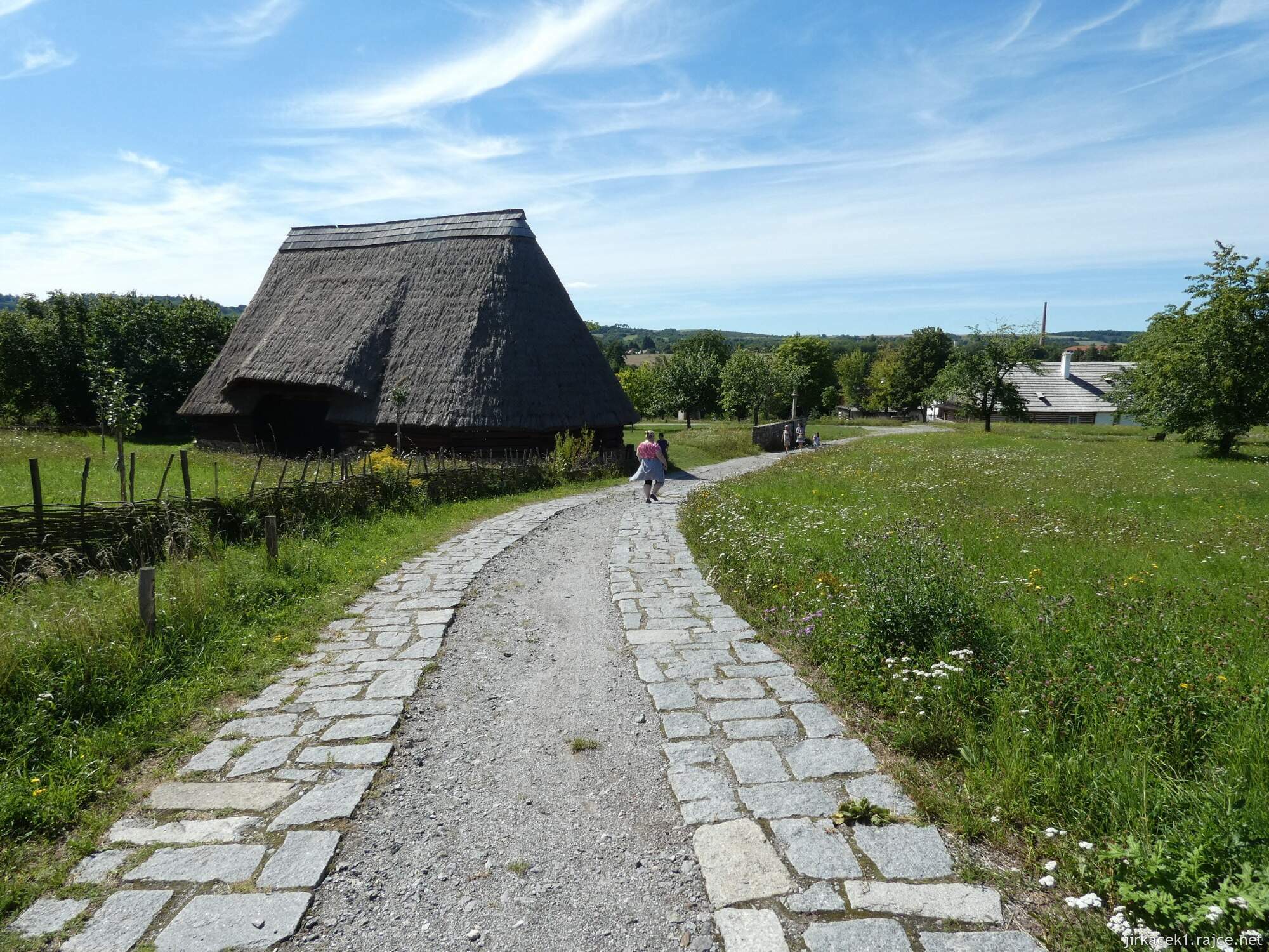 Podívali jsme se do rozlehlé světnice, kde jsme našli spoustu stolů s dřevěnými vyřezávanými lavicemi, takže jsme měli dojem, že jsme se octili ve staré dobré hospodě. Nenašli jsme zde však žádný výčep a ani nás neobletoval tlustý hostinský se šibalskýma očima, dychtící vymámit z nás nějakou zlatku za korbel pěnivého moku z nedalekého pivovaru či za poctivou domácí polévku a nějaký ten kus žvance. Rychle jsme tedy místnost se zelenými kachlovými kamny opustili a pak jsme využili nabídky přilehlé menší světničky, kde provozovatelé skanzenu zařídili bezplatné WC, za což jim velmi děkujeme. Nic nám nebylo, ale pak nám hned bylo lépe ! S lepším pocitem jsme tedy část skanzenu ze třemi památkami nad sebou opustili, vyšli ven na štěrkovou cestu a zamířili jsme dolů k jedné církevní stavbě.