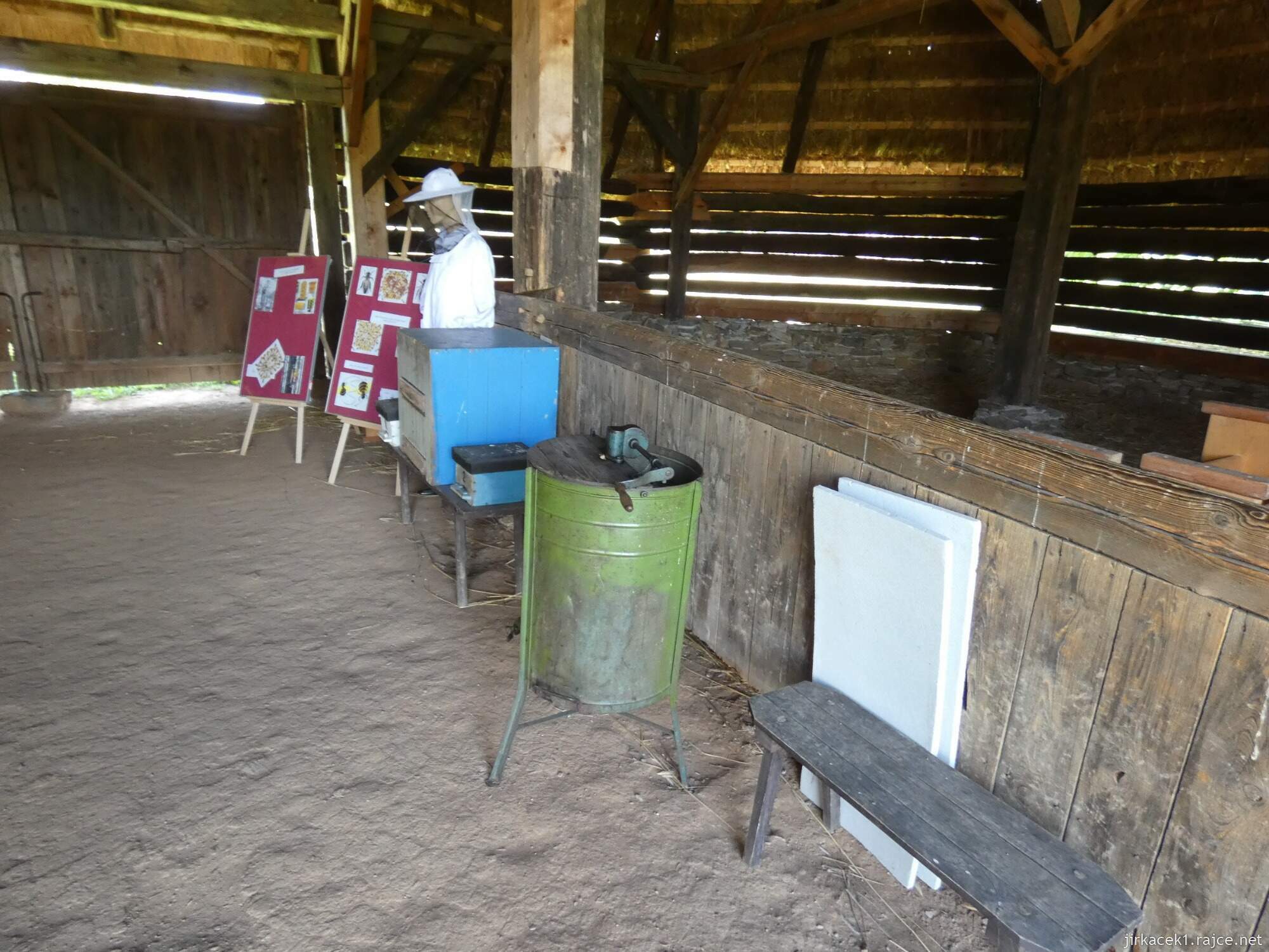Na jednom z trámů jsme našli malovaný letopočet z doby vzniku stavby v polovině 17. století a pak jsme se již věnovali včelaři, který ve stodole rozbil svůj stan. Vypadalo to, že o užitečném okřídleném hmyzu ví snad úplně všechno, neboť trpělivě odpovídal na všetečné dotazy návštěvníků, postávajících před pultíkem se včelími produkty. Vedle jsme pak sestry slavné včelky Máji mohli vidět na vlastní oči, neboť včelař si sebou vzal malý úl. Naproti pultík jsme pak našli figurínu včelař, vybaveného různými ochrannými pomůckami, medomet pro vytáčení medu ze včelích plástů pomocí odstředivé síly a také pár barvených obrázků s jasně daným tématem. Když jsme si vše prohlédli, obrovské stodole jsme ukázali záda a vyšli ven na světlo boží. S vírou pak souvisela poslední zajímavost, kterou jsme ve skanzenu viděli.