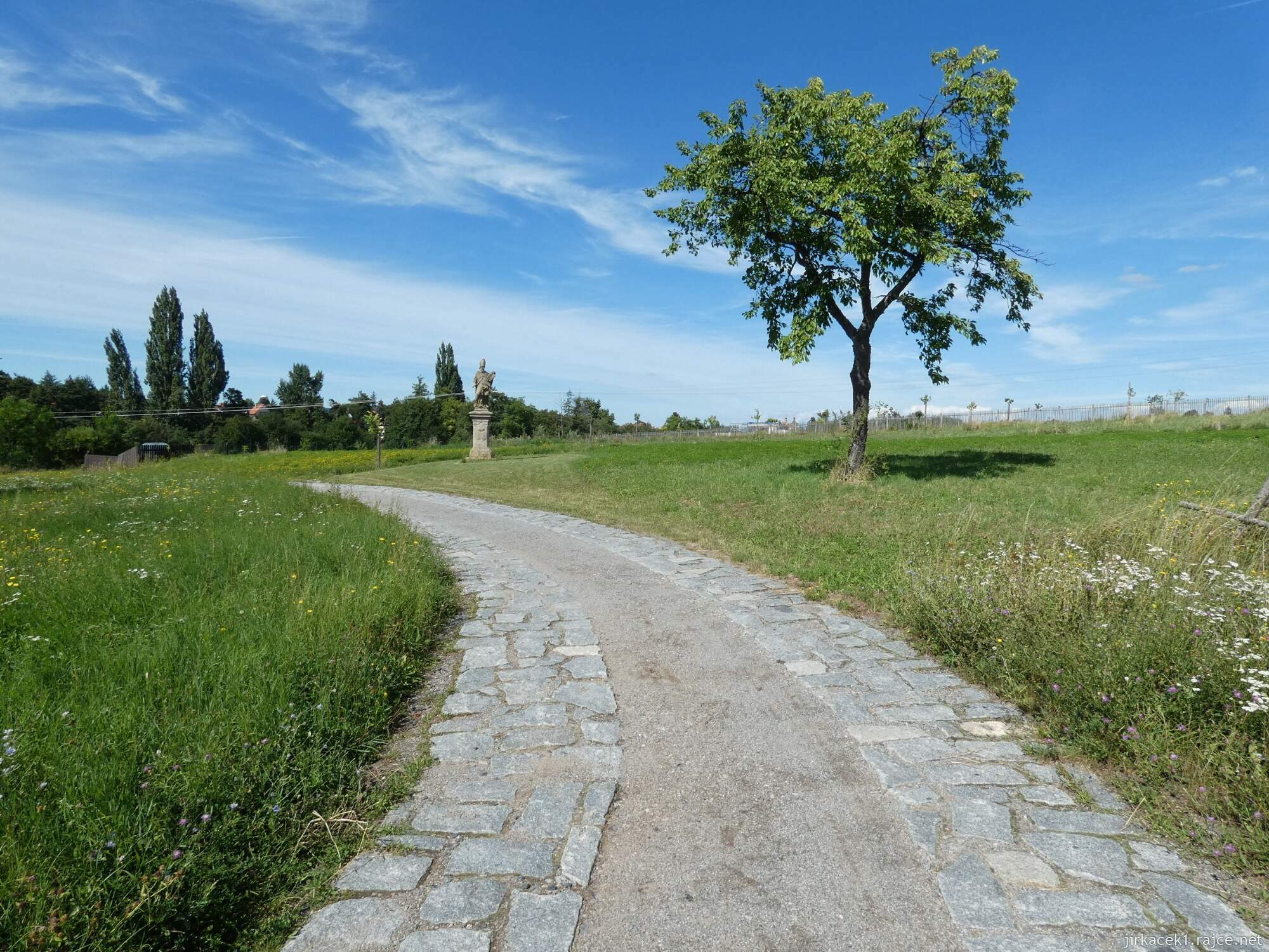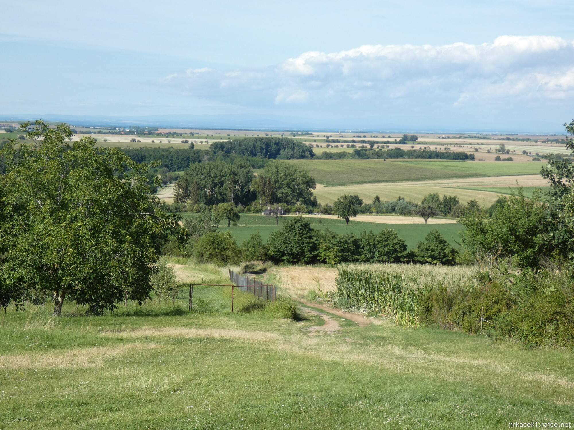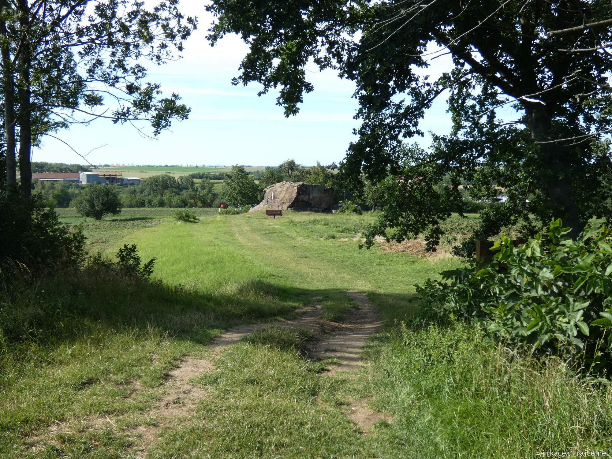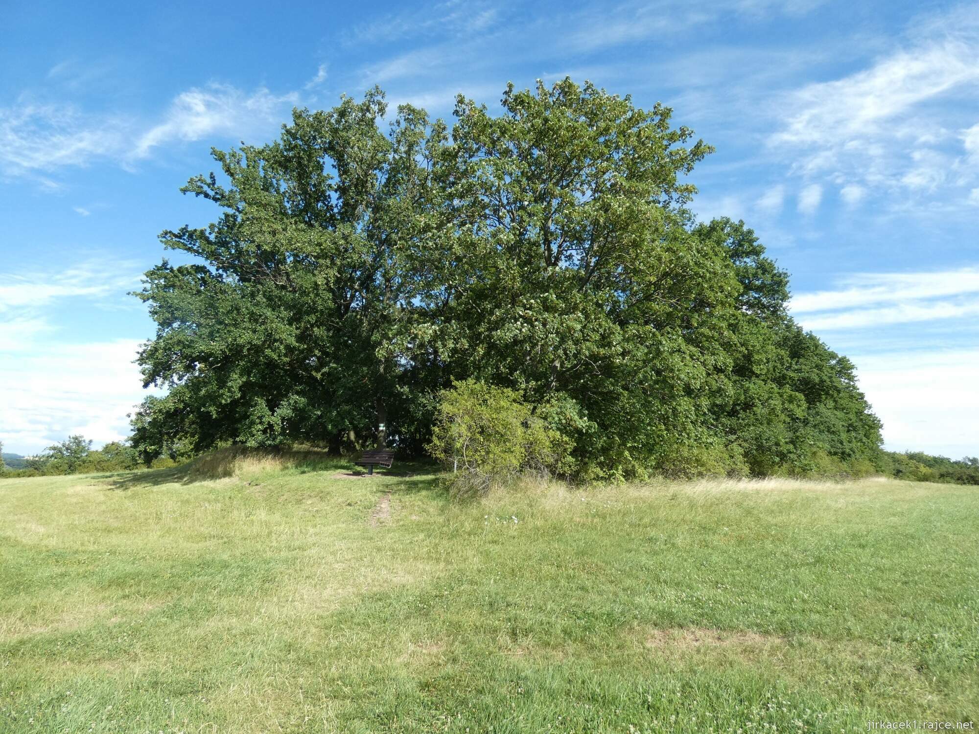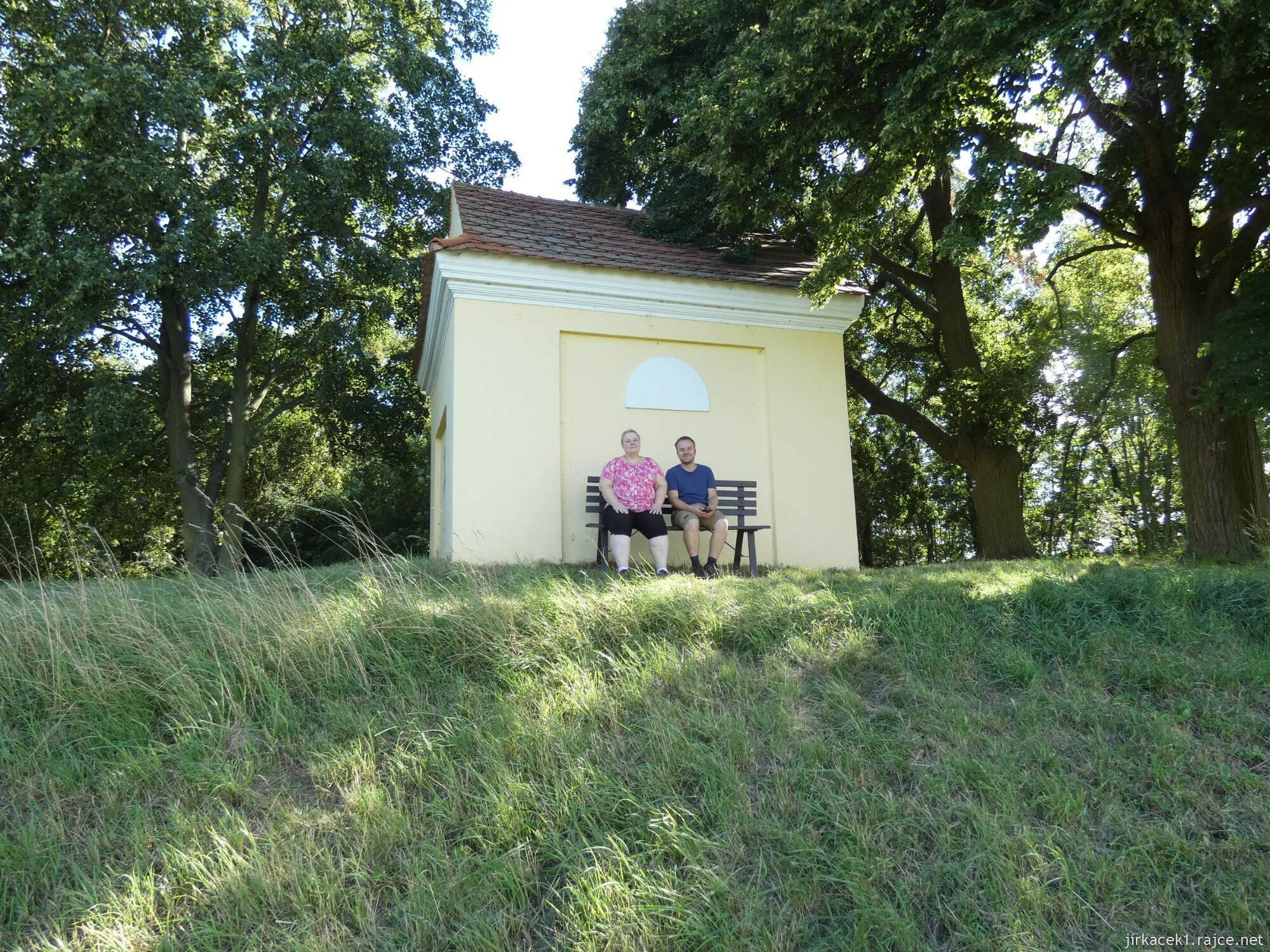 Na bočních stranách interiéru pak byly další menší malby, jež však byly po 160 letech už hodně zašlé a potřebovaly by brzkou obnovu. Když jsme si vnitřek stavby prohlédli, šli jsme se posadit na lavičku, umístěnou vhodně k boku kaple, odkud se nám naskytl krásný výhled do kouzelné polabské krajiny. Kromě úchvatných pohledů do dálav jsme si nezapomněli prohlédnout ani část hradiště, které se kdysi rozprostíralo dole pod námi směrem k Lechovu kameni. Na lavičce jsme poseděli několik minut a i když jsme občas museli zahnat nějaký ten poletující hmyz, který sem nalákala opojná vůně lipových květů, výhledem jsme se kochali vcelku poklidně a tak jsme se spokojeně mohli vydat na další cestu. Jakmile jsme opustili stín lipového hájku, setkali jsme se s otočnou lavičkou, jejíž nabídku k posezení s výhledem jsme odmítli.
