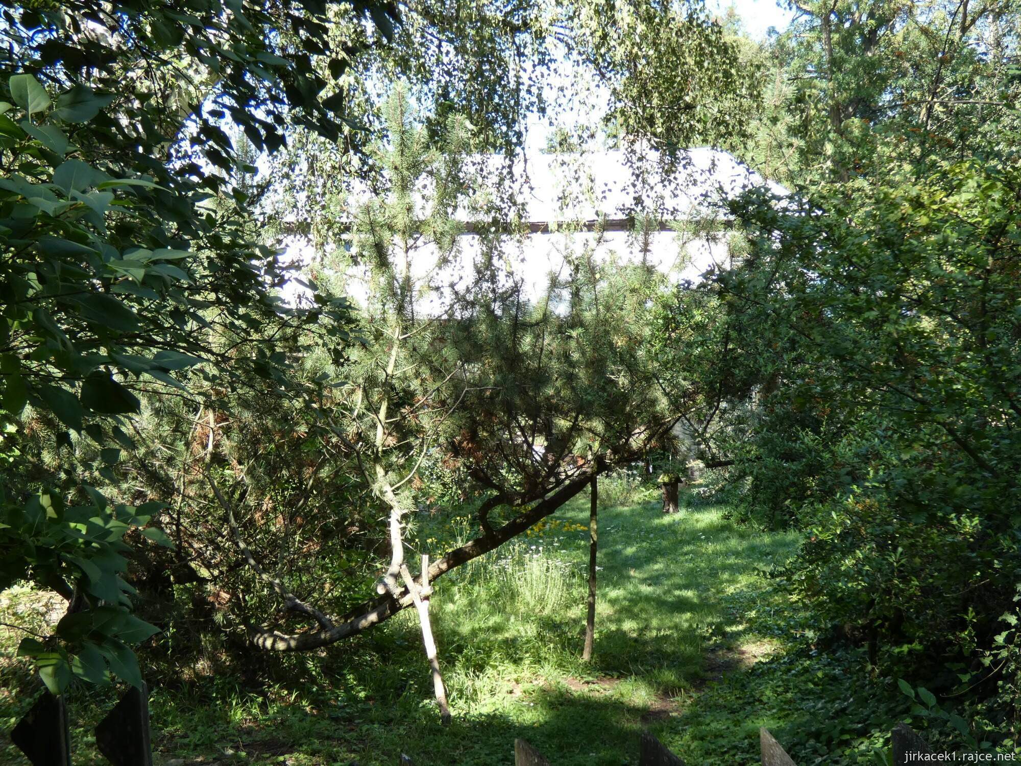 Konkurenční turisté odešli, kozy zůstaly stát na místě a toho jsme využili a začali jsme je krmit. Natrhali jsme šťavnatou travičku a mlsná zvířata nám ji brzy začala žrát z ruky, o čemž jsme natočili video, které si můžete pustit zde. Zatímco opodál se pasoucí ovce asi ani nenapadlo, že by se k hodování mohly připojit, trojice nenažraných koz stupňovala svoje požadavky. Po chvilce nás krmení přestalo bavit a ke zklamání přežvýkavců jsme pokračovali v cestě vzhůru. Plot ohrady nás dovedl k druhému, mnohem zdobnějšímu oplocení pozemku, na němž se nacházel další památečný dům, pocházející z osady Kamenná z Jílového u Děčína. Ten vypadal zcela jinak než chalupy, které jsme dosud ve skanzenu viděli, jelikož budova byla v přízemí roubená, hospodářství zděné a horní část hrázděná.