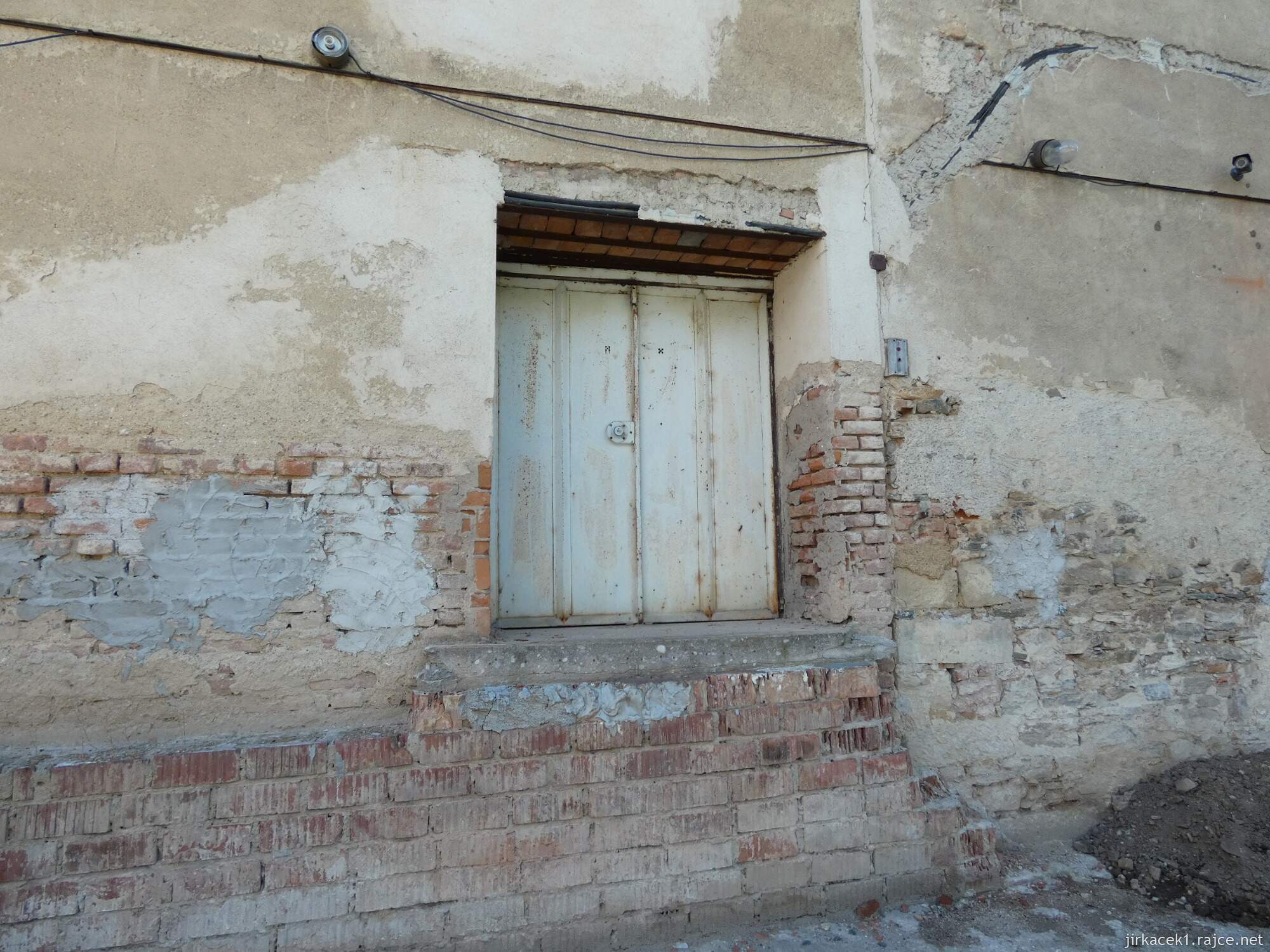 Chvíli jsme hleděli do potoka Střebovka, jehož vodstvo pohánělo mlýnské stroje na zpracování obilí a pak očima hledali budovu mlýna, ale ten byl z mostu vidět stejně mizerně a tak jsme se brzy po silnici vydali směrem k parkovišti. Po levé ruce jsme minuli bývalý rybník a současné koupaliště v jednom a vzápětí jsme odbočili doprava. Kráčeli jsme kolem fotbalového hřiště po sotva viditelné stezce v trávě, která nás po několika metrech přivedla k boční straně mlýna. Mezi křovinami a stromky, několik metrů za kobercem lopuchů, jsme konečně spatřili celou část jedné strany klapáče. A když jsme po stezce ještě trošičku popošli, zahlédli jsme i část zadní stěny. Dole pod okny jsme uviděli zamřížované dveře, jimiž pravděpodobně byly vydávány pytle s moukou zákazníkům.