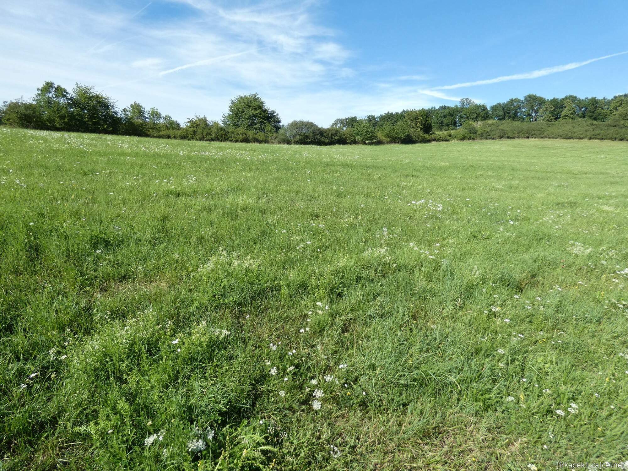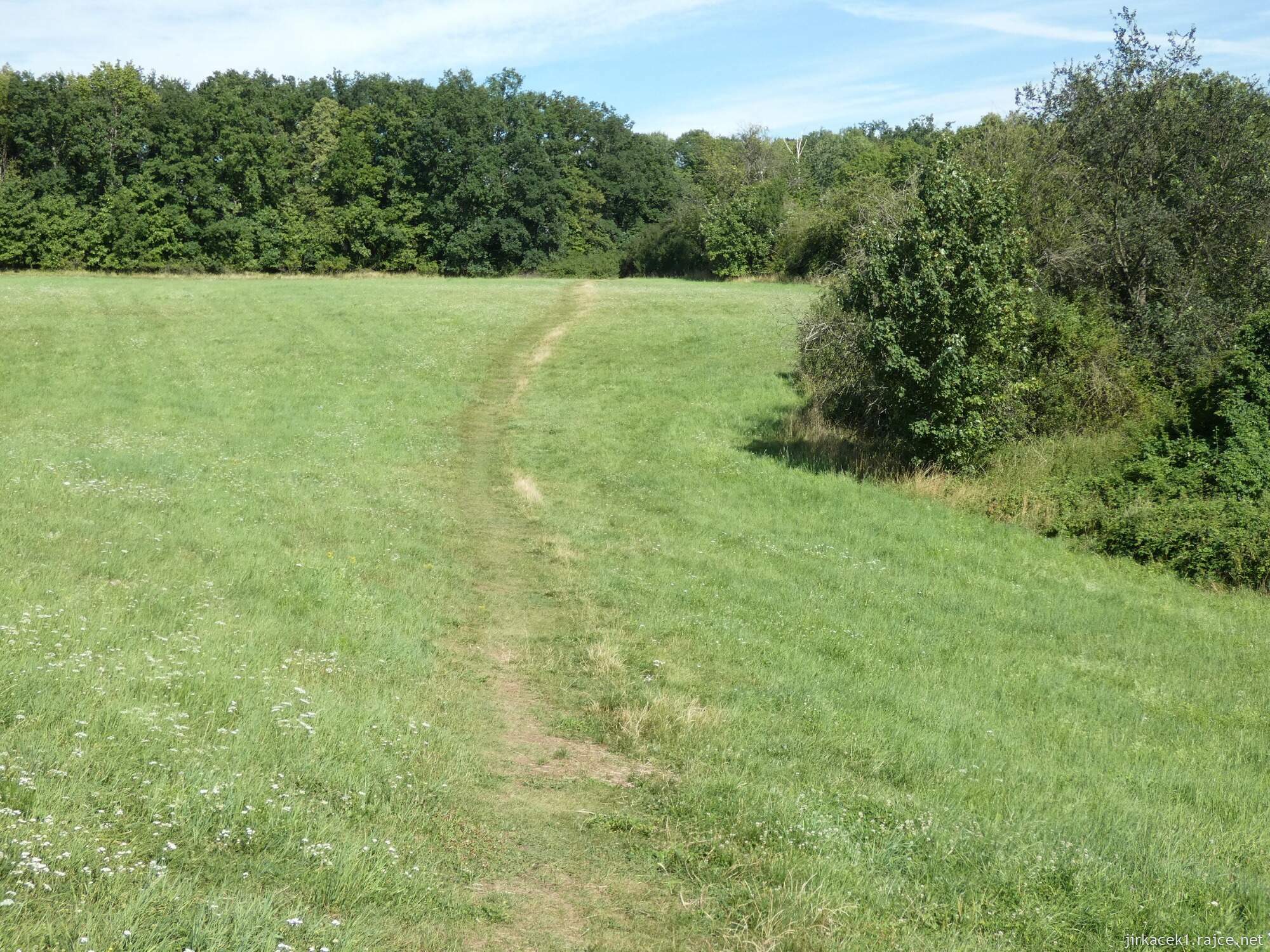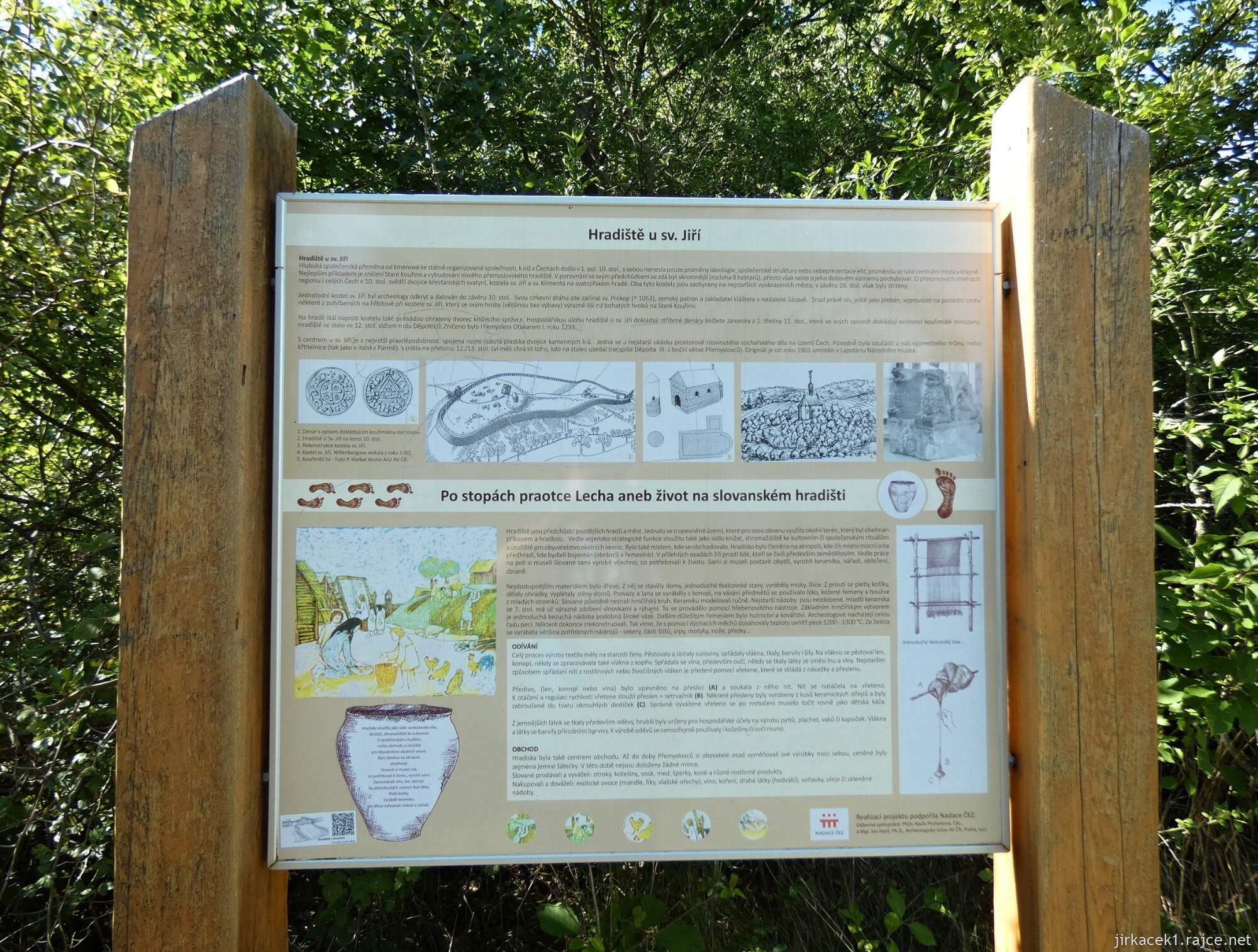 Rozdělili jsme se v místě, kde se stezka obloukem stáčela doleva a definitivně tak opustila tok Výrovky. Zabočili jsme tedy vlevo a pak jsme museli zvládnout menší výstup, během něhož se k nám lovec vrátil. Po 50 metrech jsme dorazili na okraj rozlehlé louky a zároveň jsme vstoupili na území staroslovanského hradiště Stará Kouřim. Vzápětí jsme se zastavili u první informační tabule, která nás ovšem tak trochu uvedla v omyl, protože se na ní psalo o hradišti u svatého Jiří. To se nacházelo na druhé straně říčky Výrovky a v podstatě jsme kolem něho před chvílí procházeli. Navíc jsme se nacházeli na okraji staroslovanského hradiště, které zde existovalo od konce osmého až do počátku desátého století, zatímco hradiště u svatého Jiří bylo postaveno ve strategické poloze na ostrožně mezi potoky Střebovka a Výrovka až na konci 10. století.