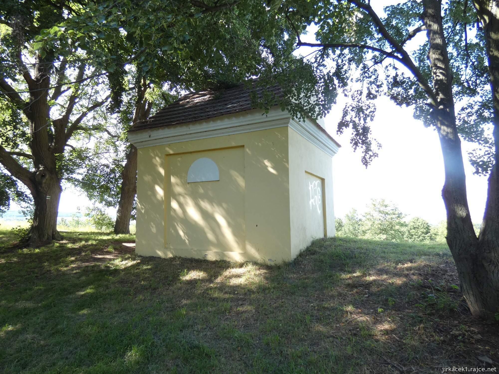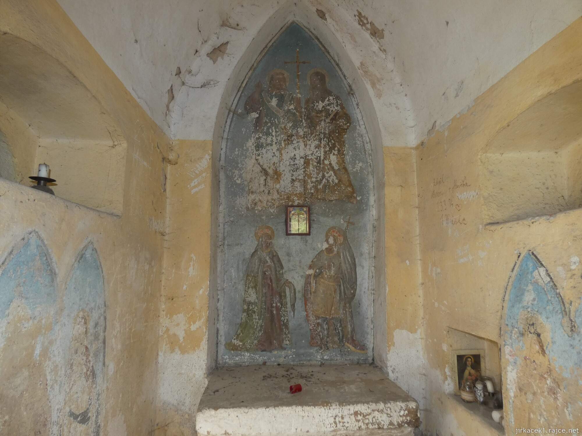 Nejprve jsme viděli zadní část kapličky se čtvercovým výklenkem, na kterou se bohužel podepsal nějaký pomatený sprejer, ale jinak na ní nebylo nic zajímavého. Pak jsme prozkoumali obě boční stěny, které měly naprosto identickou podobu. Hladkou fasádu žluté barvy narušily opět výklenky, do nichž architekt tentokrát umístil bílé půlkruhové tvary, které nám trochu připomínaly ležící měsíc. Následně jsme se přesunuli k přední straně kapličky, na níž jsme nad korunní římsou spatřili trojúhelníkový štít bez další výzdoby. Pod ním se nacházely vstupní dveře, které sice byly zavřené, ale pře mříže se nám podařilo nahlédnout dovnitř. V interiéru kapličky jsme v pseudogotickém oblouku uviděli nástěnné malby z roku 1863 od Josefa Mrkvičky, jež představovaly české zemské patrony v čele se svatými Cyrilem a Metodějem.