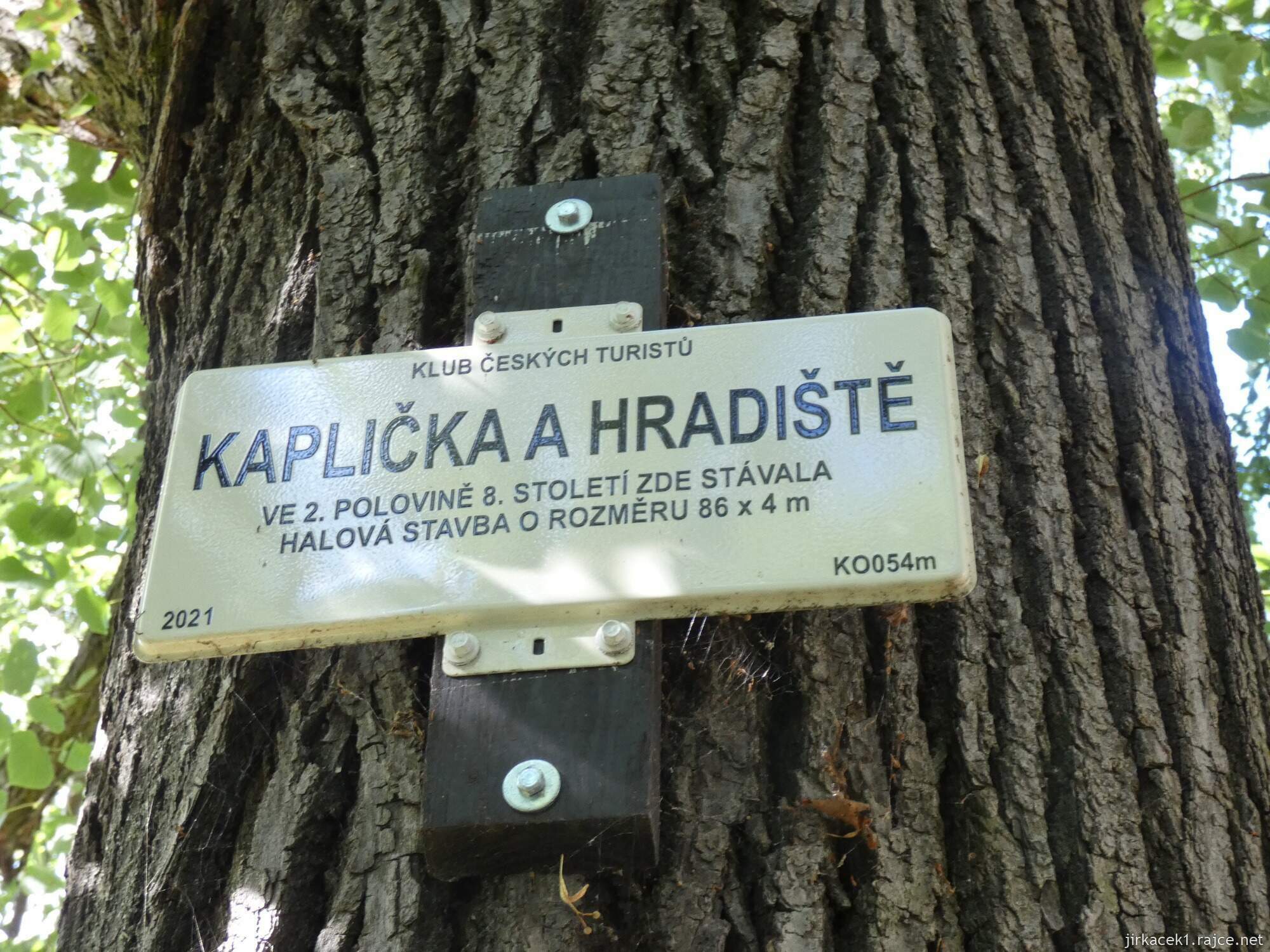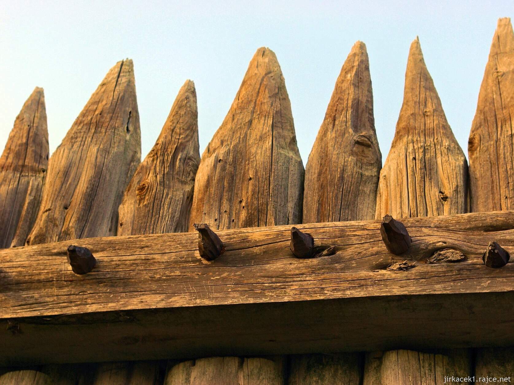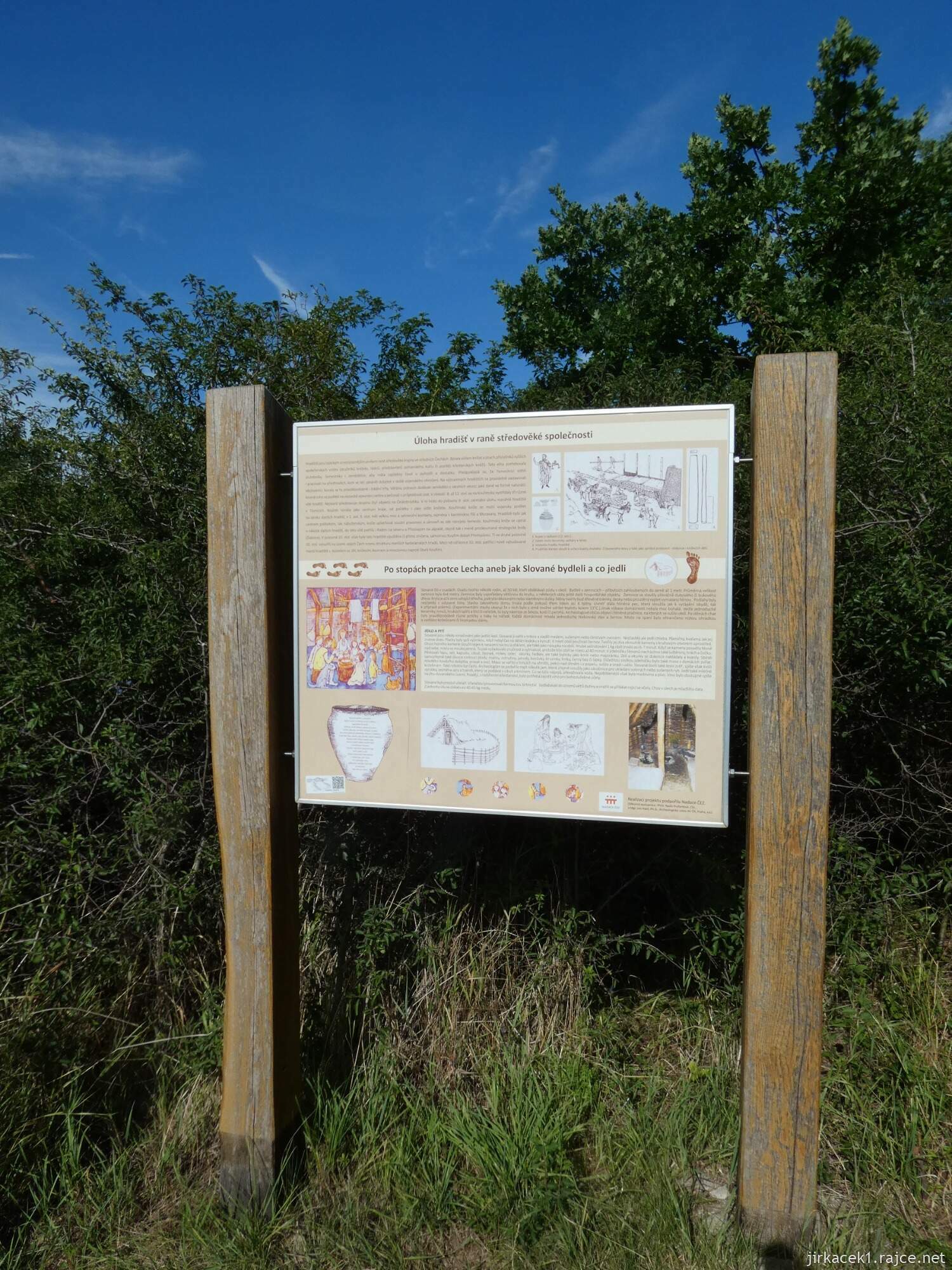 Dozvěděli jsme se, že na nejvyšším místě staroslovanského hradiště byly archeologickým průzkumem odkryty zbytky unikátní dřevěné halové stavby z 9. století o impozantním půdorysu asi 90 x 9 metru. Docela nás překvapilo, že se dodnes nepodařilo uspokojivě objasnit, k jakému účelu hala sloužila, než byla v první polovině 10. století zničena požárem. Zřejmě se v ní shromažďovala místní vojenská posádka nebo obyvatelé hradiště, které bylo stejně jako ostatní, předchůdcem středověkých hradů. Cedule nám dále prozradila, že bychom zde našli kovárnu, hrnčírnu, dílny kovolitců, šperkařů, zbrojířů, výrobců dřevěného nádobí či nábytku a varnu piva. Slované prý na polích pěstovali žito, oves, proso, len, luštěniny, ječmen a pšenici a ovocné stromy jako jabloně, třešně, hrušně a slívy se dokonce pokoušeli šlechtit.