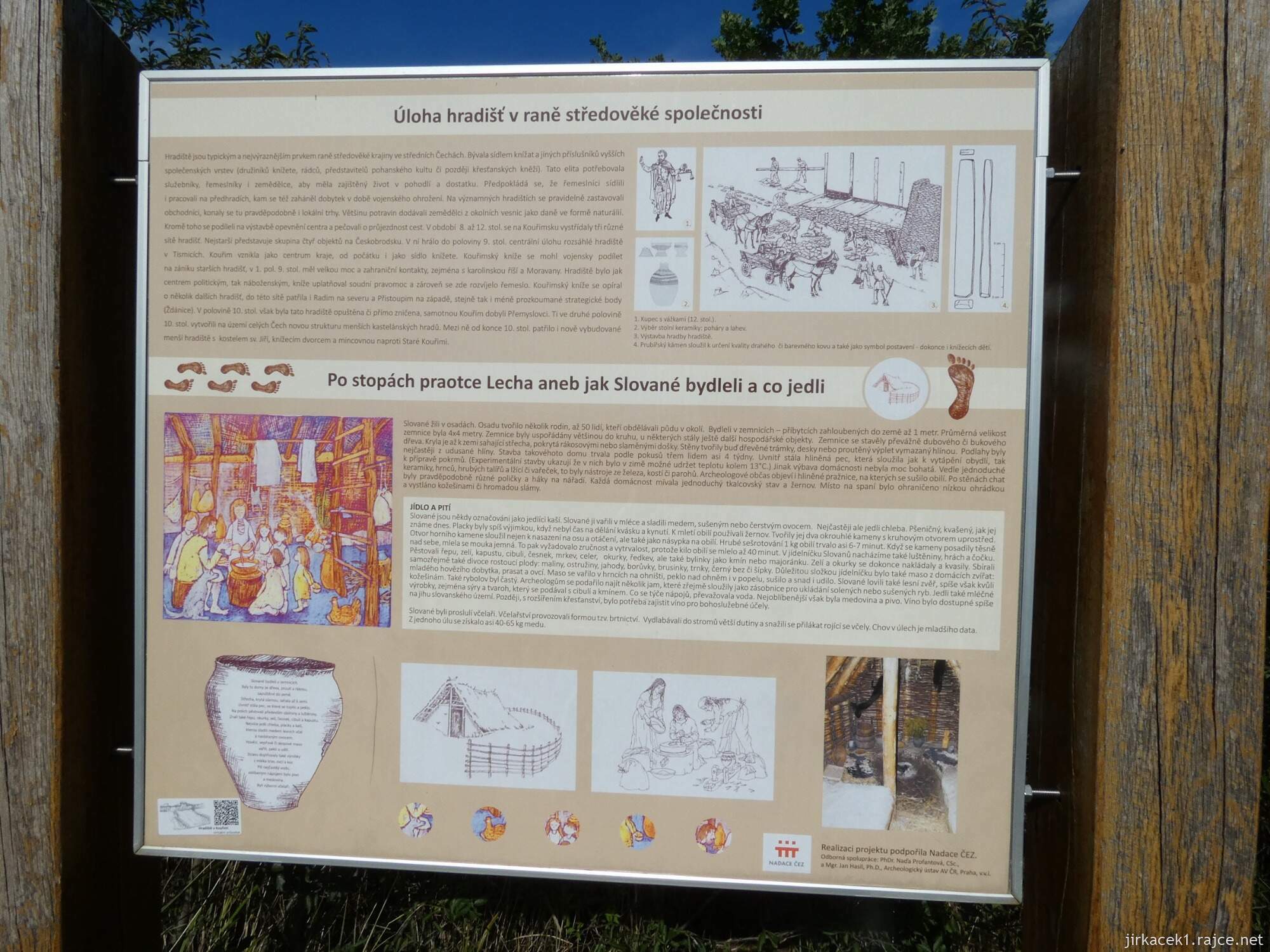 Po 110 metrech jsme došli k další tabuli naučné stezky, z níž jsme se dozvěděli spoustu zajímavých faktů o úloze hradišť ve středověku. Už jsme věděli, že odtud vládla knížata, bylo zde ubytované vojsko, konala se tady shromáždění či trhy a že se sem uchylovali obyčejní lidé v případě nebezpečí. Jednalo se hlavně o zemědělce, kteří knížeti odváděli daně v podobě naturálií a kromě toho se podíleli na výstavbě budov a opravách cest. V kouřimském hradišti od počátku vládl kníže, který měl v první polovině 9. století velkou moc. Udržoval čilé kontakty s Velkomoravskou a Karolínskou říší na západě středověké Evropy. Dozvěděli jsme se také, že Slované žili v osadách, kterou tvořilo většinou asi 50 lidí, obývajících do kruhu seřazené zemnice, tedy příbytky z bukového nebo dubového dřeva, zahloubené asi metr do země.