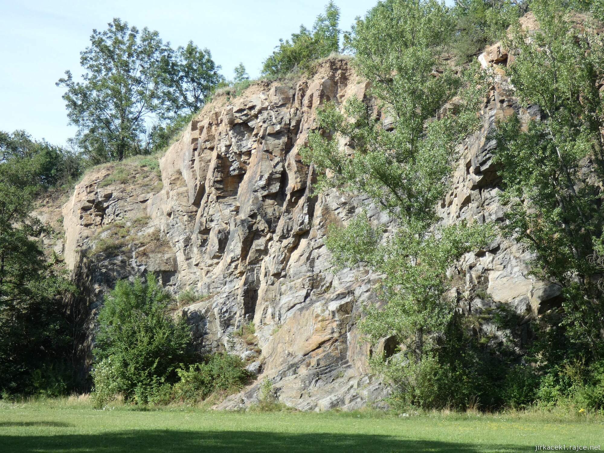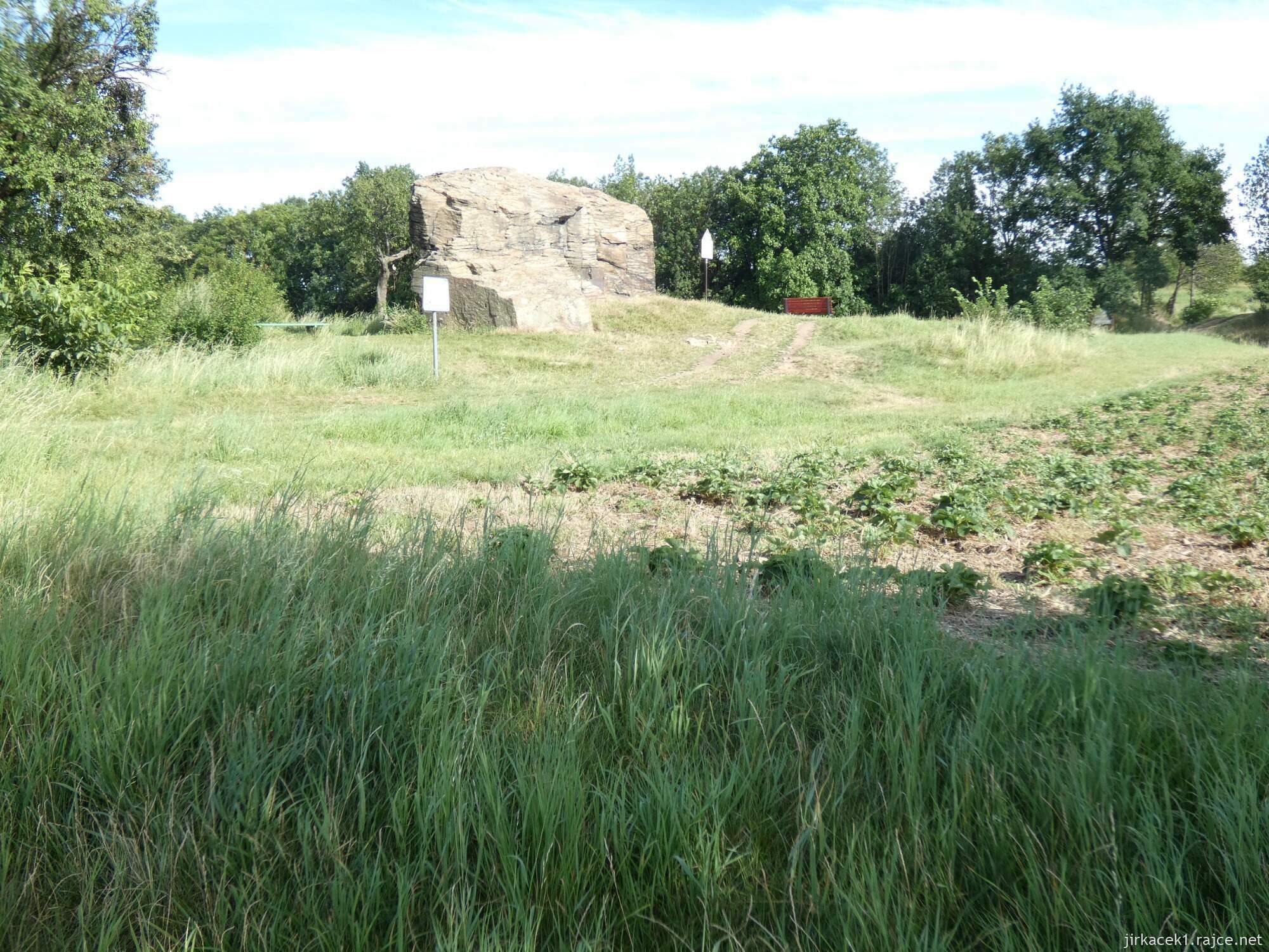 Nicméně ještě než jsme k rulové skalce přišli, zastavili jsme za bránou u chytré cedule, která nám odhalila tajemství opevnění Staré Kouřimi. Hradiště bylo největší raně středověkou fortifikací v Čechách, když její rozloha činila závratných 47 hektarů a její stavitelé dokonale využili okolní terén, který byl obehnán příkopem a hradbou. Tu představovala nasucho kladená kamenná zeď, jež byla běžně vysoká kolem tří metrů a kterou zpevňovaly dřevěné rošty a komory, do nichž se posléze nasypala zemina. Tím byla hradba zafixována a také se po ní mohli pohybovat obránci, takže nám bylo jasné, že dobyvatelé neměli věru nijak jednoduchou práci. A když jsme si k výšce hradby přimysleli hloubku příkopu, útočníci museli počítat s překonáním až desetimetrových překážek, co čehož bychom se nám rozhodně nechtělo.