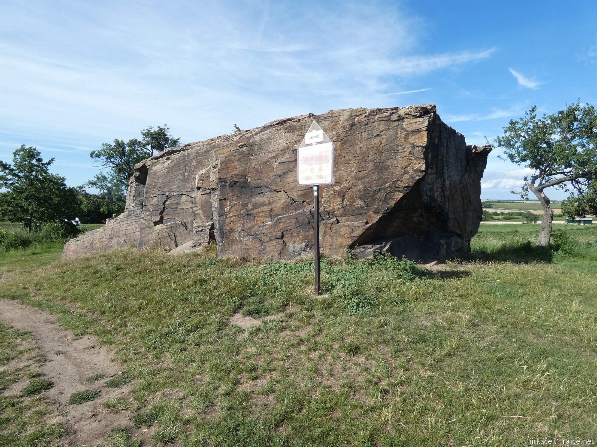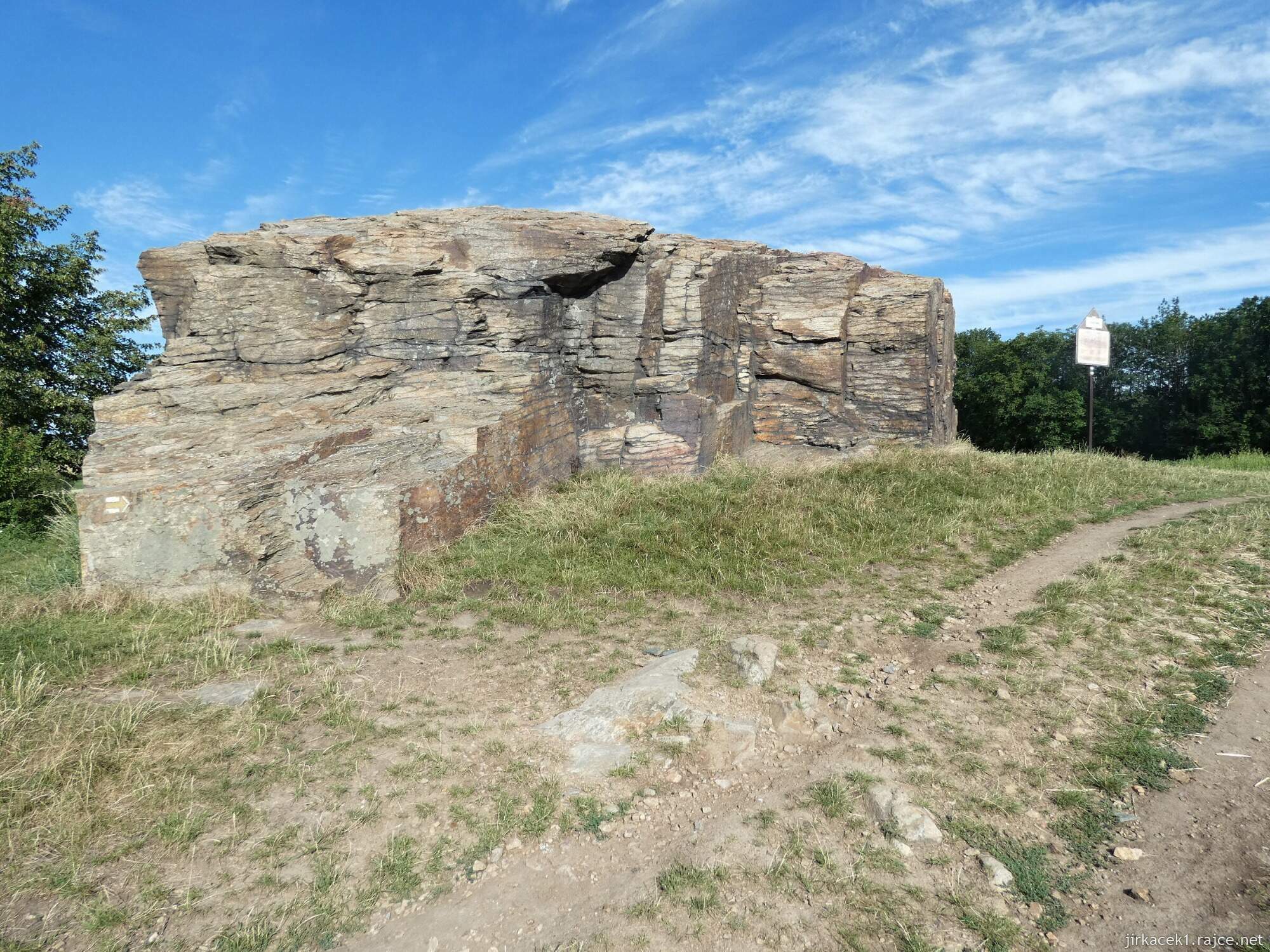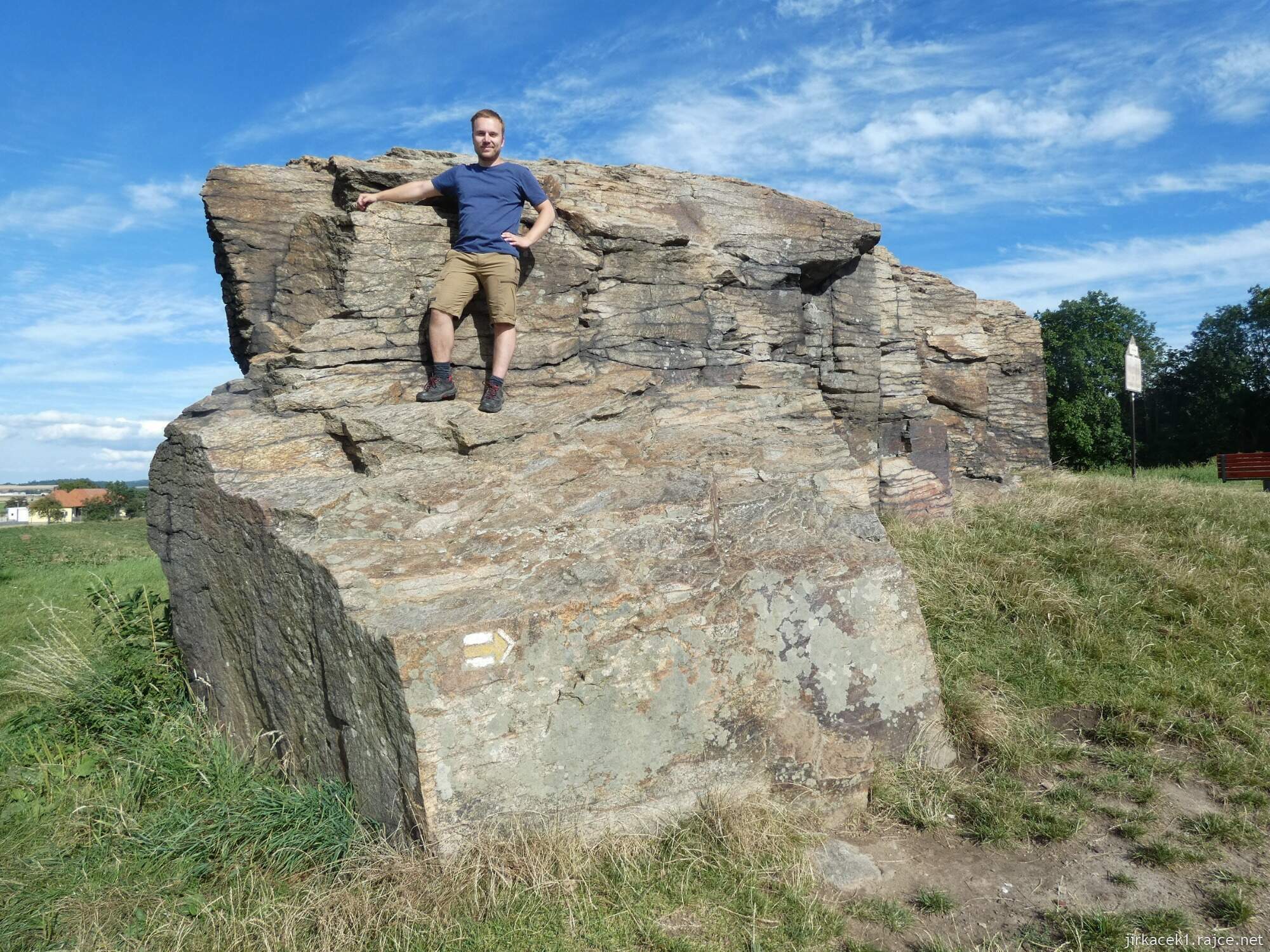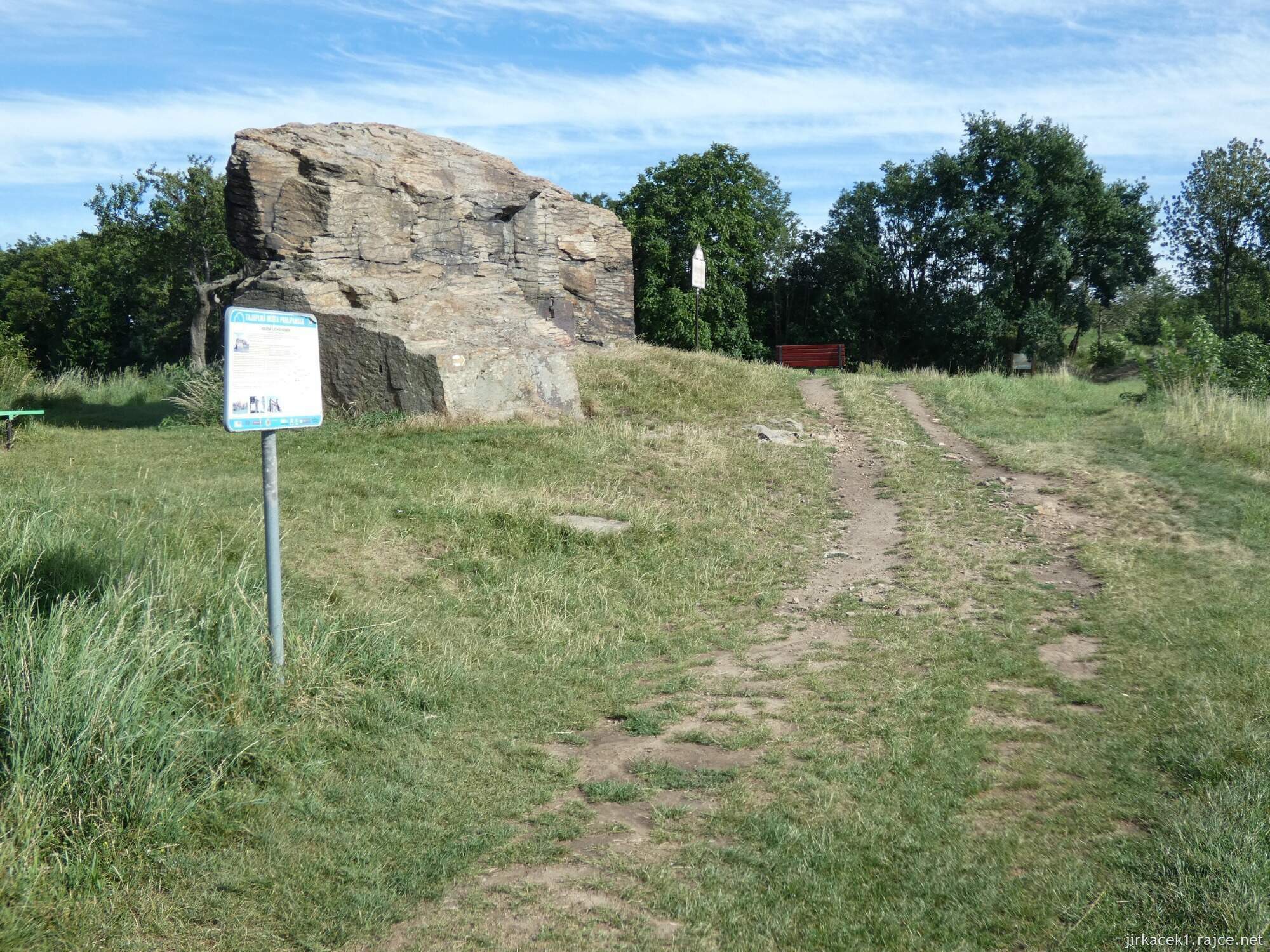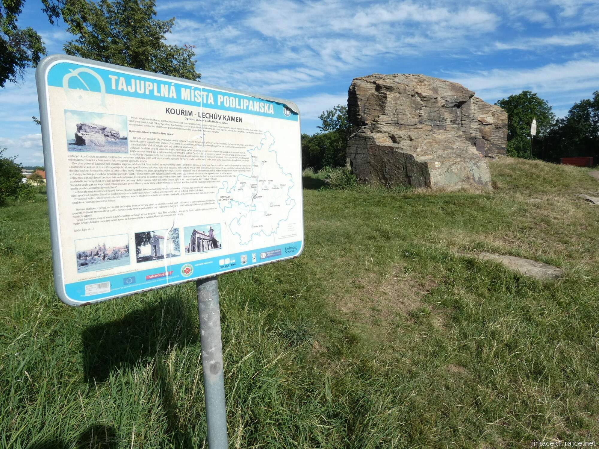 Dále jsme se dozvěděli několik čísel. Hradiště bylo na severovýchodní straně opevněno třemi pásy valů, z nichž nejníže položený val má délku 1320, střední 820 a vnitřní 400 metrů. Poté jsme již prostory hradiště opustili a vydali se ke kýženému kusu skály, k němuž jsme po několika desítkách vteřin přišli. Nebylo to k němu totiž daleko a vtipně řečeno, ležel co by kamenem dohodil od vnějšího valu slovanského hradiště. Byl to zvláštní pohled na tento obrovský kámen, který jakoby sem spadl z nebe. Široko daleko okolo se nenacházel žádný další podobný skalní útvar, což v našich myslích vzbuzovalo fantastické myšlenky o jeho původu. K objasnění záhady jsme využili chytré cedule, která stála přímo u rulové skalky a jali se louskat text na tabulce. Dozvěděli jsme se, že název kamene byl odvozený od mýtického slovanského knížete Lecha, bratra praotce Čecha.