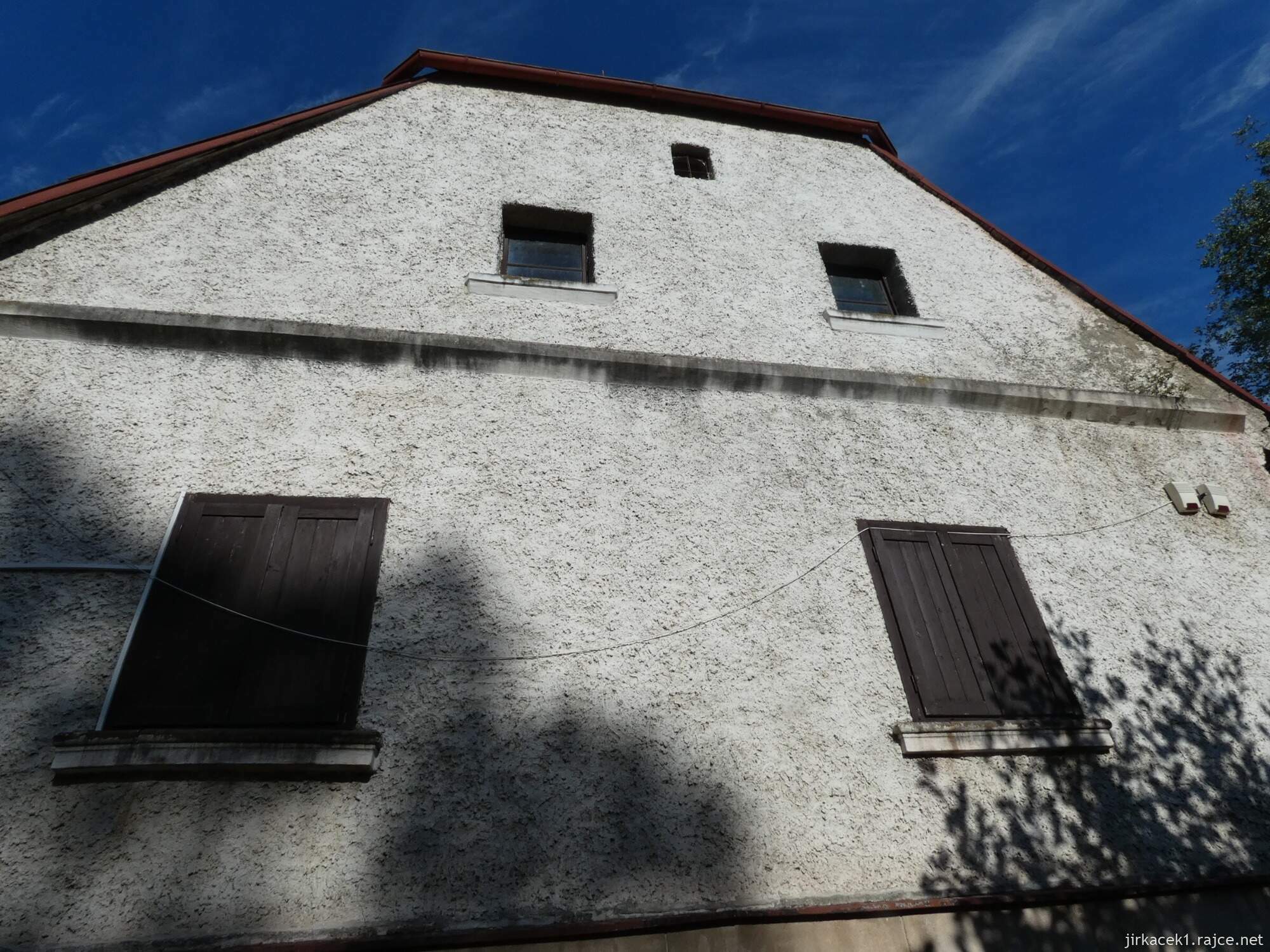 Vždyť jsme mohli odtáhnout s nepořízenou či dokonce se štěkající smečkou za zády překonat světový rekord v běhu na 200 metrů, což byla přibližně vzdálenost od mlýna k našemu autu. Tři muži se opět ponořili do rozhovoru, z něhož jsme je vyrušili a my jsme zahájili obhlídku budov v areálu. Postupně jsme shlédli vlastní mlýn s mansardovou střechou, v němž se dochovalo jeho kompletní umělecké složení, které původně poháněla dvě vodní kola doplněná třetím kolem pro pohon pily. Roku 1918 nainstaloval mlynář Beyšovec dvě Francisovy turbíny, které významně zvýšily výrobní možnosti mlýna. Z mlýnice bývala pekárna, pro jejíž potřeby byl zakoupen nedochovaný parní stroj a postaven vysoký komín, který čněl k nebi jako mrakodrap. Bohužel zanikla i pila, ale zato jsme si prohlédli hospodářský dvůr s kolnou, stodolou a chlévy.