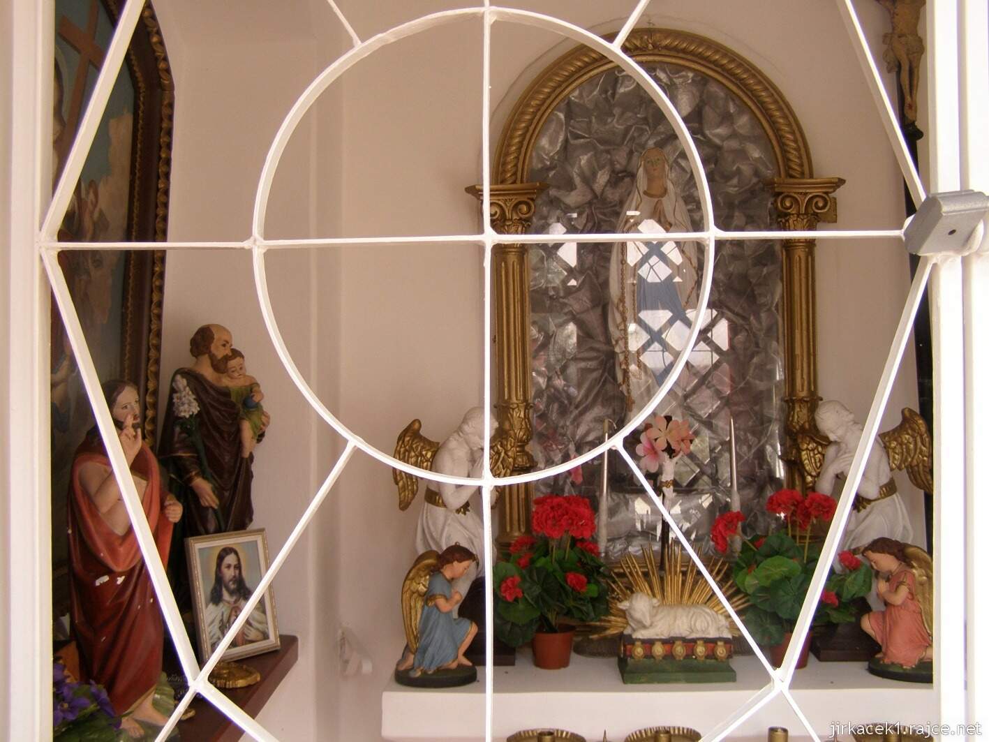 Uvnitř jsme spatřili sochu Panny Marie Lurdské nad oltáříkem, na němž se nacházelo několik sošek andělů, ležící beránek se svatozáří a květinová výzdoba. Nalevo do oltáře jsme pak našli sošky Ježíše Krista a vedle sv. Josefa s bílou lilií a malým Ježíšem v náručí. Na závěr jsme uvnitř kapličky shlédli svatý obrázek a na zdi visící kříž s Kristem a poté jsme se šli podívat na druhou boční stranu svatostánku. Ta byla opět bez okénka a žádný výrazný prvek jsme nenašli ani vzadu na plochém presbytáři. Více jsme toho na kapličce vidět nemohli, ovšem oblast Zámostí jsme ještě neopustili.