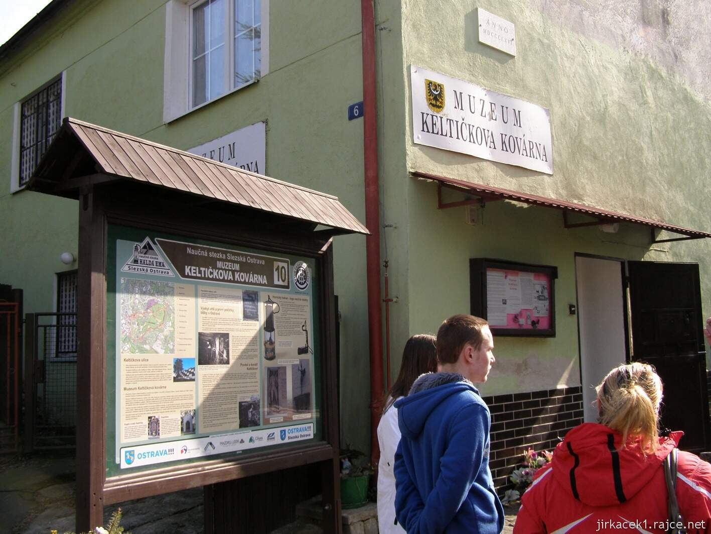 Další fakta na tabuli nás informovaly o výskytu a těžbě uhlí v Ostravě, také o samotném muzeu a na závěr jsme se seznámili s již zmíněnou naučnou stezkou. Po načerpání informací z tabule jsme zavolali na telefonní číslo majitele a zakladatele muzea pana Svatopluka Chodura, s nímž jsme si domluvili prohlídku o den dříve. Když jsme tomuto slezskému patriotovi oznámili, že jsme již před budovou kovárny, zanedlouho se otevřely dveře a přišel nás přivítat rázovitý muž, který se nás s radostí zhostil a před muzeem nám pyšně vyprávěl o postavě Jana Keltičky, o nálezu uhlí v Ostravě a podal nám také spoustu dalších zajímavých informací. Bylo na něm vidět, že je na vybudování muzea náležitě hrdý a také že mu Ostrava přirostla k srdci.