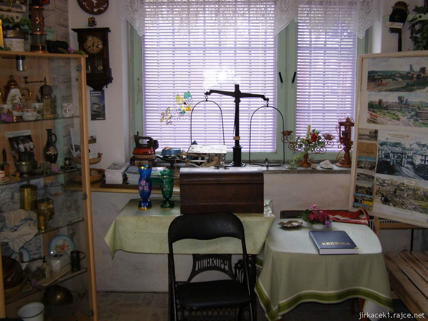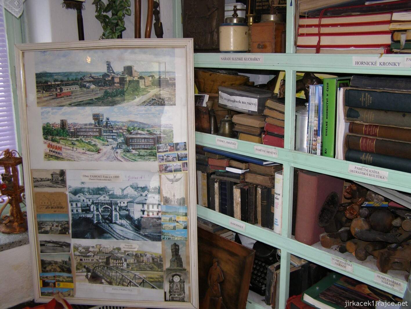 Nezapomněl nás rovněž upozornit na malou kapličku v plotě, kterou on sám nechal roku 2005 zhotovit a jako správný krajan ji zasvětil patronce Slezska svaté Hedvice. Na závěr venkovní exkurze nám ukázal památník věnovaný nálezci uhlí Janu Keltičkovi v podobě čedičového bazaltu, který pan Chodur nechal zavěsit na fasádu domu roku 2002. Podle jeho slov tímto počinem vzdal poctu černému zlatu, národnostním kulturám i obětem dolování v tomto slezském kraji a protože se v regionu Ostravy prolínala národnost slezská, polská a německá, nesl bazaltový památník nápis v těchto jazycích. Potom jsme se už konečně vydali do útrob domu, kde se na nevelké ploše nacházelo okolo 2000 exponátů, které jsme si postupně prohlédli v 8 vitrínách a další koutech a zákoutích muzea.