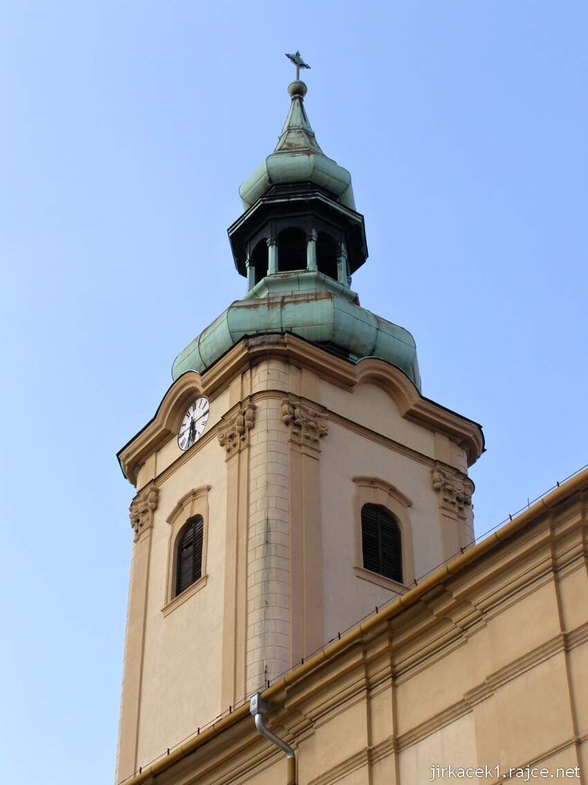 Francouzský stříbrný povoz jsme zaparkovali přímo u svatostánku a následně jsme se vydali na jeho obhlídku, kterou jsme zahájili na čelní straně kostela. Nad námi se tyčila hranolová věž s oblým nárožím, jenž byly ozdobeny pilastry s patkou. Na každé straně věže s cibulovou bání a lucernou jsme našli okno s půlkruhovým záklenkem, za nimiž se skrývalo zvonicové patro, kde se kdysi nacházely čtyři zvony, které zničil požár roku 1845. Kdybychom měli rentgenové oči, mohli bychom za okenními žaluziemi vidět čtveřici nových zvonů, přičemž dva byly pořízeny hned roku 1845, třetí byl koupen o osm let později a v roce 1877 byl do věže zavěšen čtvrtý zvon.