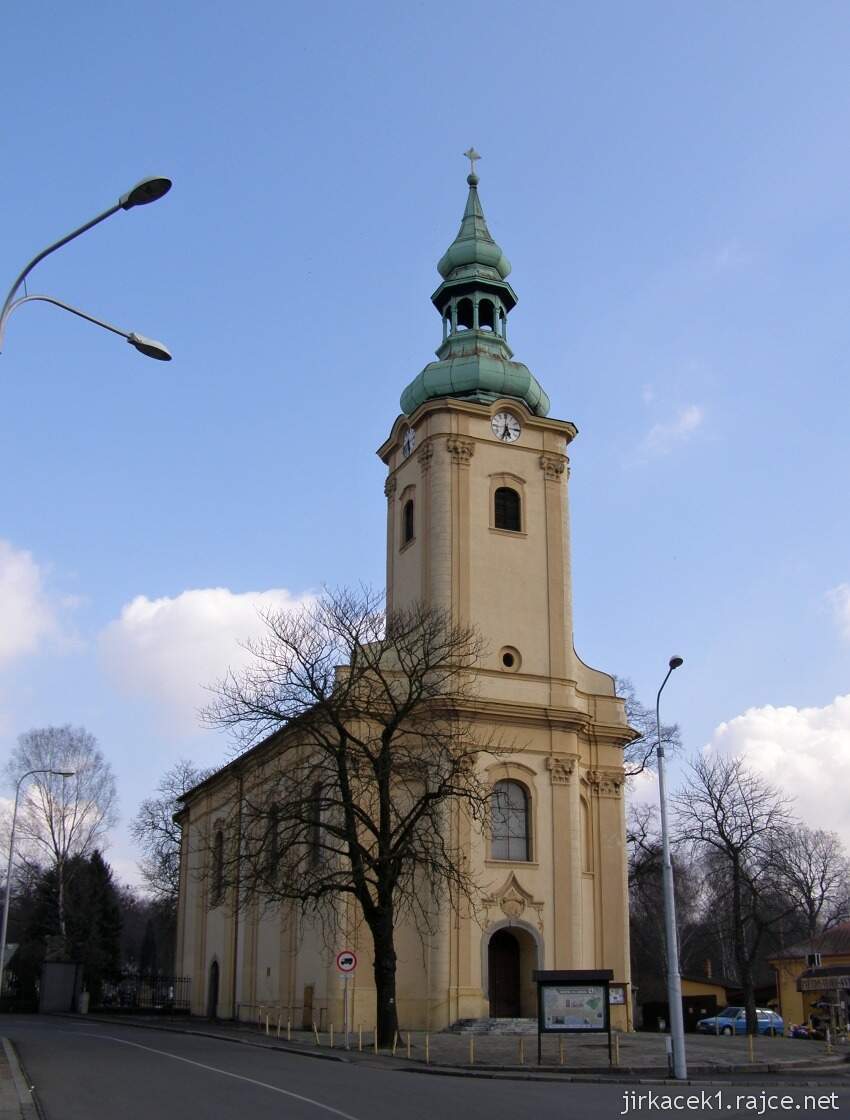 Před námi se nacházely budovy v typickém funkcionalistickém slohu, postaveném roku 1924 podle projektu firmy Jožy Dvořáka a C. Kučery ze Slezské Ostravy, které na nás svou šedivou fasádou působily poněkud omšele a hlavně posmutněle. Jakoby svatostánku neprospívalo, že do něj už neproudilo tolik věřících jako v období před druhou světovou válkou….Jelikož k nám byl kostel otočen zadní částí, nejprve jsme shlédli jeho trojboký presbytář s podlouhlými okny, rozdělených rámy do tří polí. Ke kněžišti přiléhala mohutná hranolová věž s několika malými okénky, pouštějících světlo na schodiště do zvonice, jenž byla zakončena jehlancovou střechou a pozlaceným křížem.