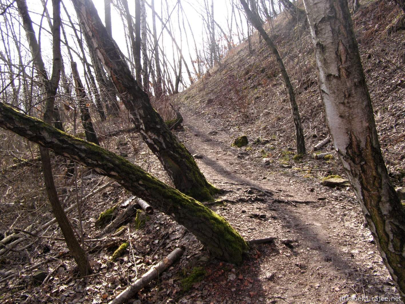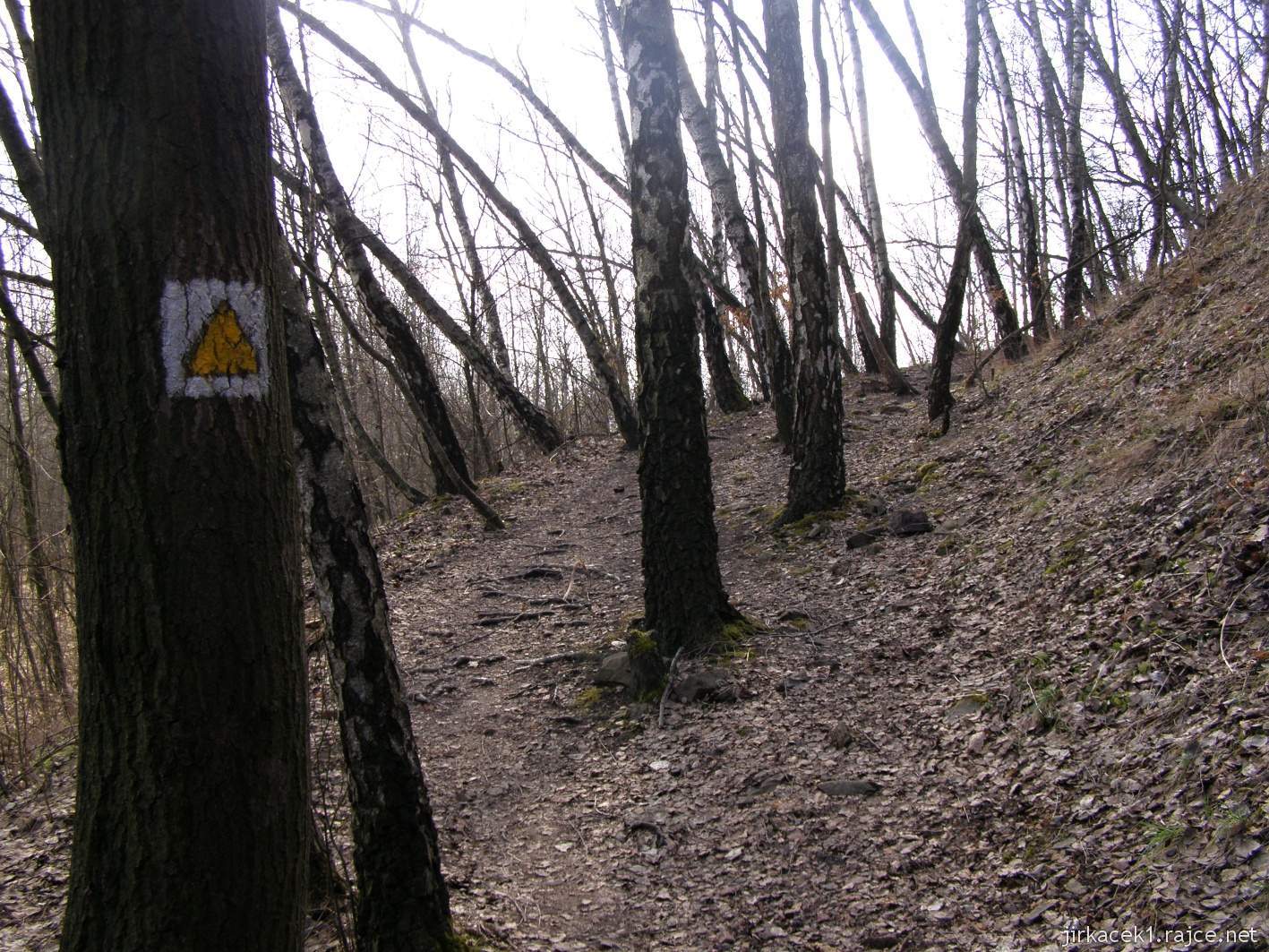 Vzhledem k tomu, že jsme do Ostravy přijeli brzy na jaře, okolní lesní porost se ještě nestačil obalit listím, takže jsme iv polovině stoupání mohli vidět nepříliš vzdálený vrchol haldy Ema, která je pravděpodobně sahají do doby před rokem 1920, přičemž nasypávání nových a nových pak probíhalo bez přestávky až do roku 1960. Po úzké pěšině a žluté značce jsme pokračovali už mírnějším stoupáním do dalších serpentin, za kterou jsme již dorazili na vrchol haldy, přicházejícím se v pěkném březovém hájku.